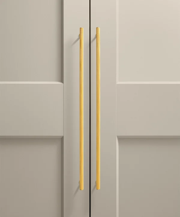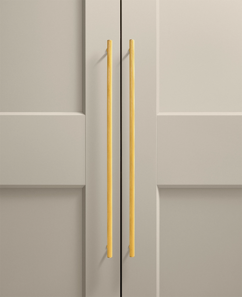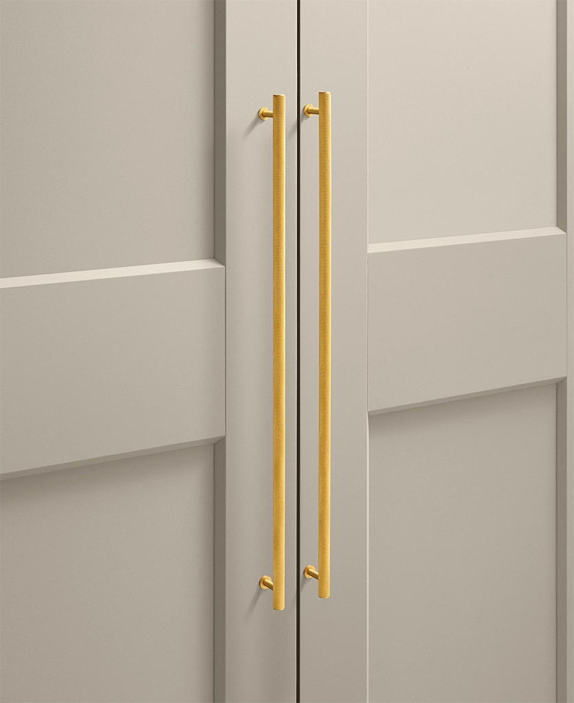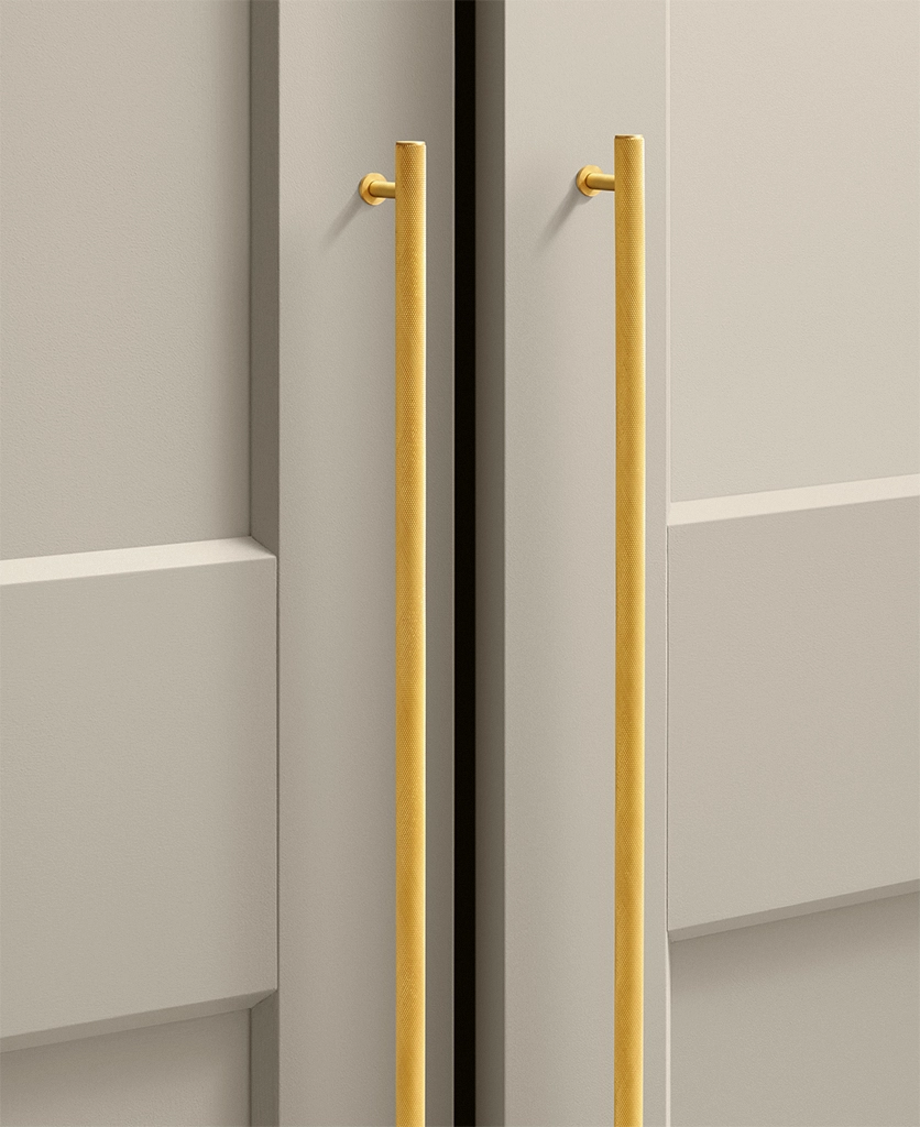 Gold Podia knurled handles work beautifully in contemporary kitchens, dressing rooms and utility spaces where texture adds depth without clutter. Their architectural form keeps things clean and structured, while the knurled detailing introduces a layer of interest that rewards closer attention. They sit particularly well alongside stone surfaces, flat-fronted cabinetry and layered lighting schemes.