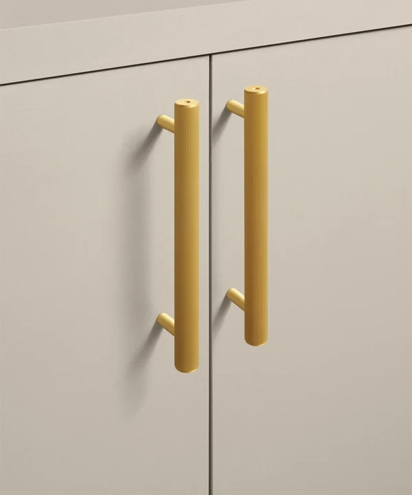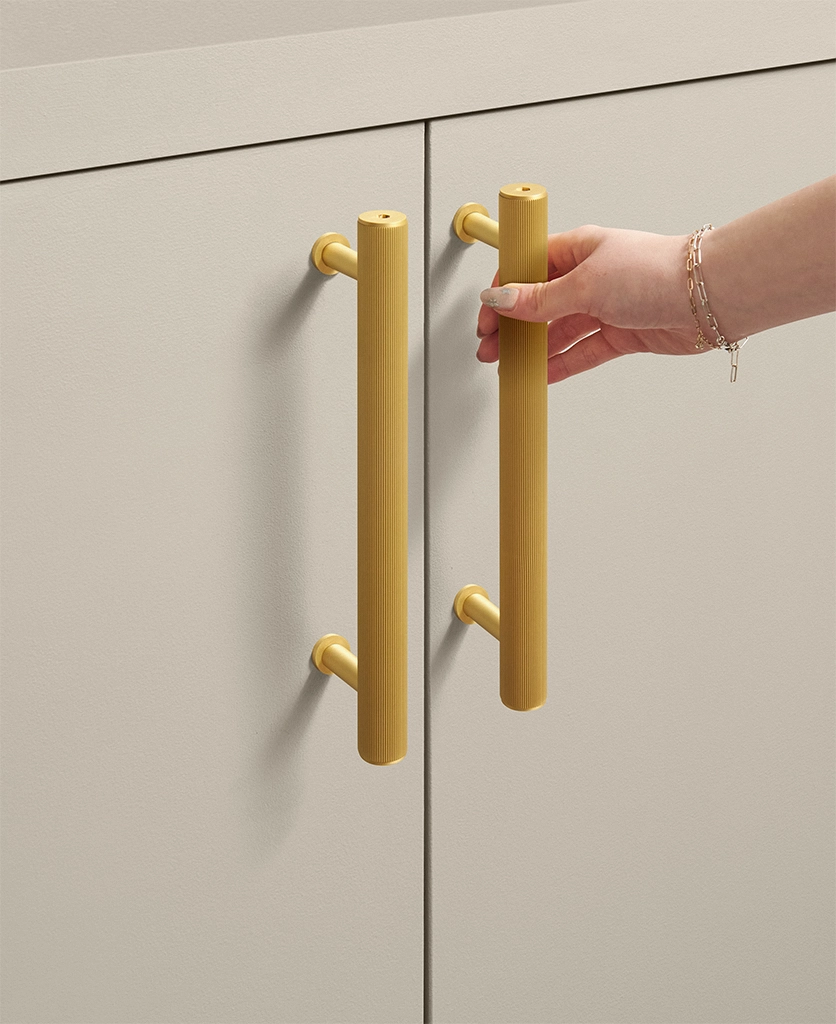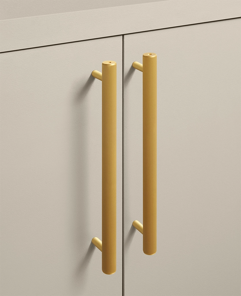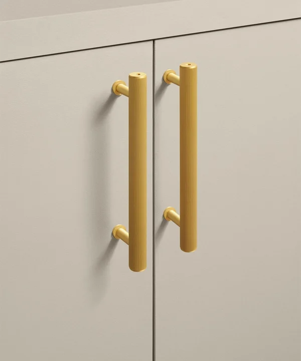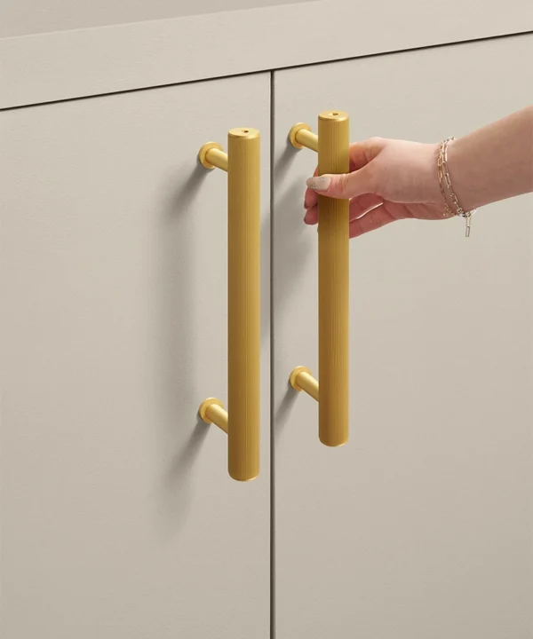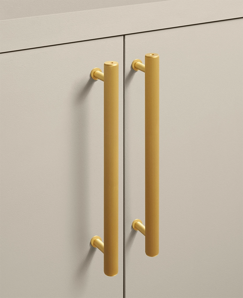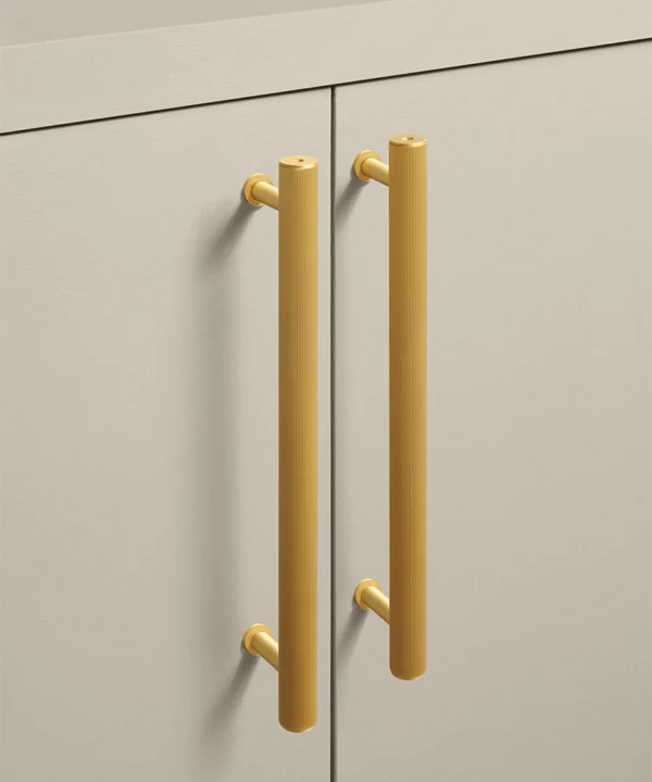 Gold Portico ribbed handles sit beautifully in kitchens, dressing rooms and utility spaces alike. Their architectural form brings structure to shaker cabinetry, while the warm gold finish adds depth to modern homes that risk feeling flat or overly minimal. They’re particularly well suited to neutral palettes, natural stone worktops and layered lighting schemes where material choice does the heavy lifting.