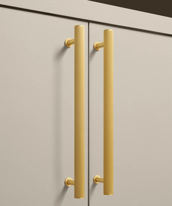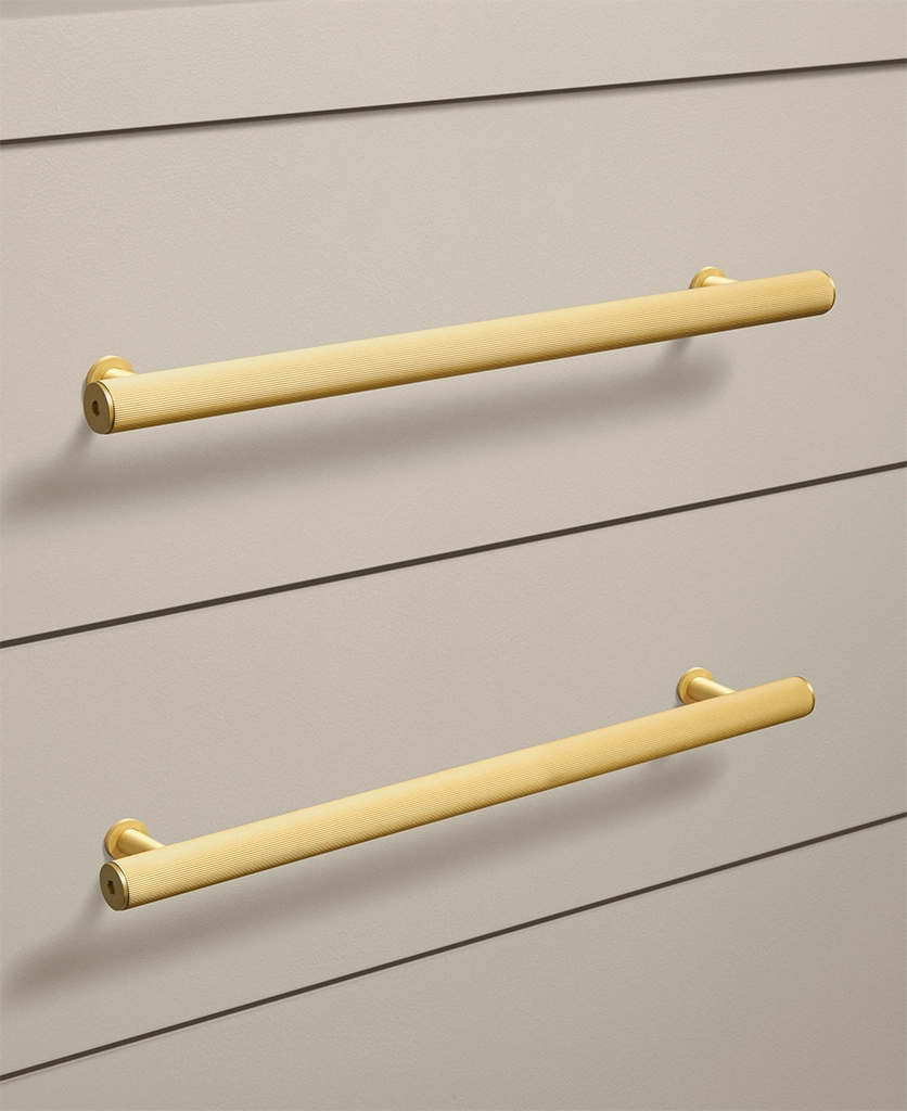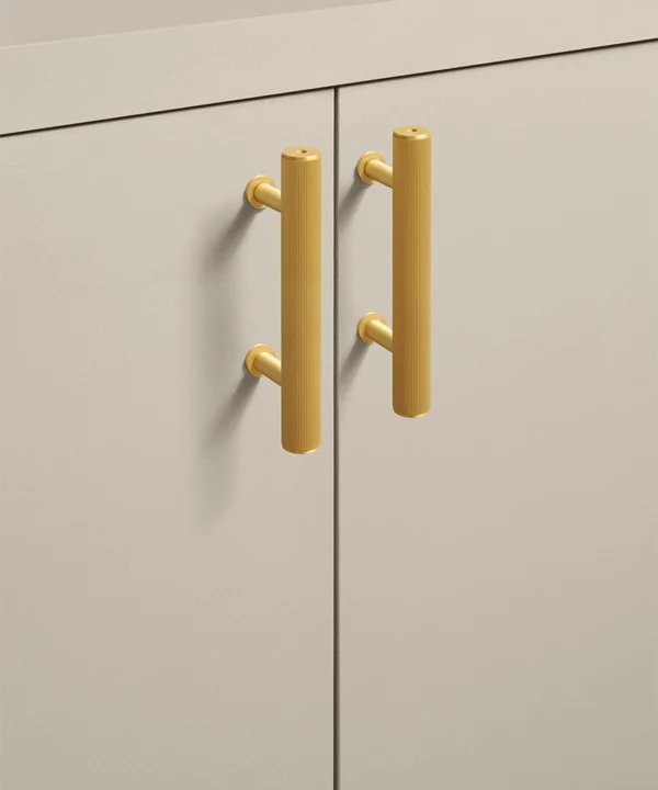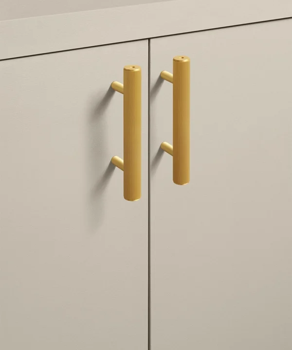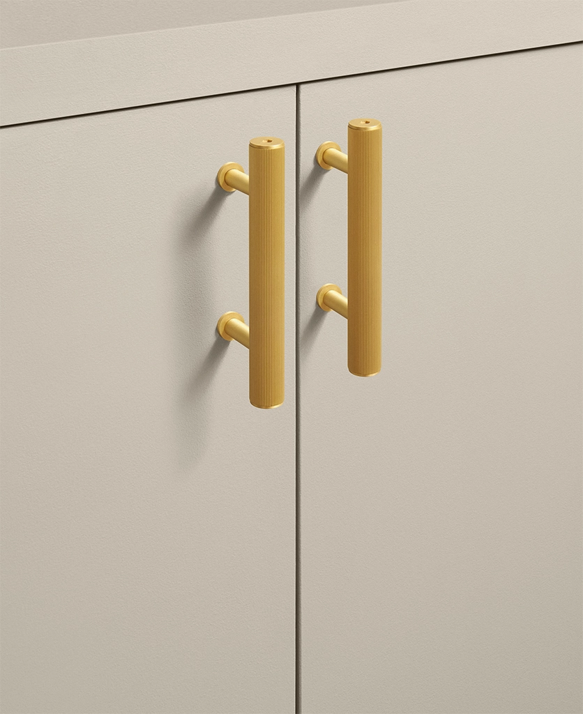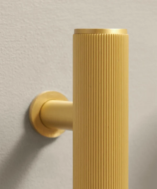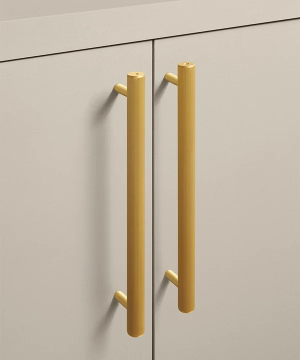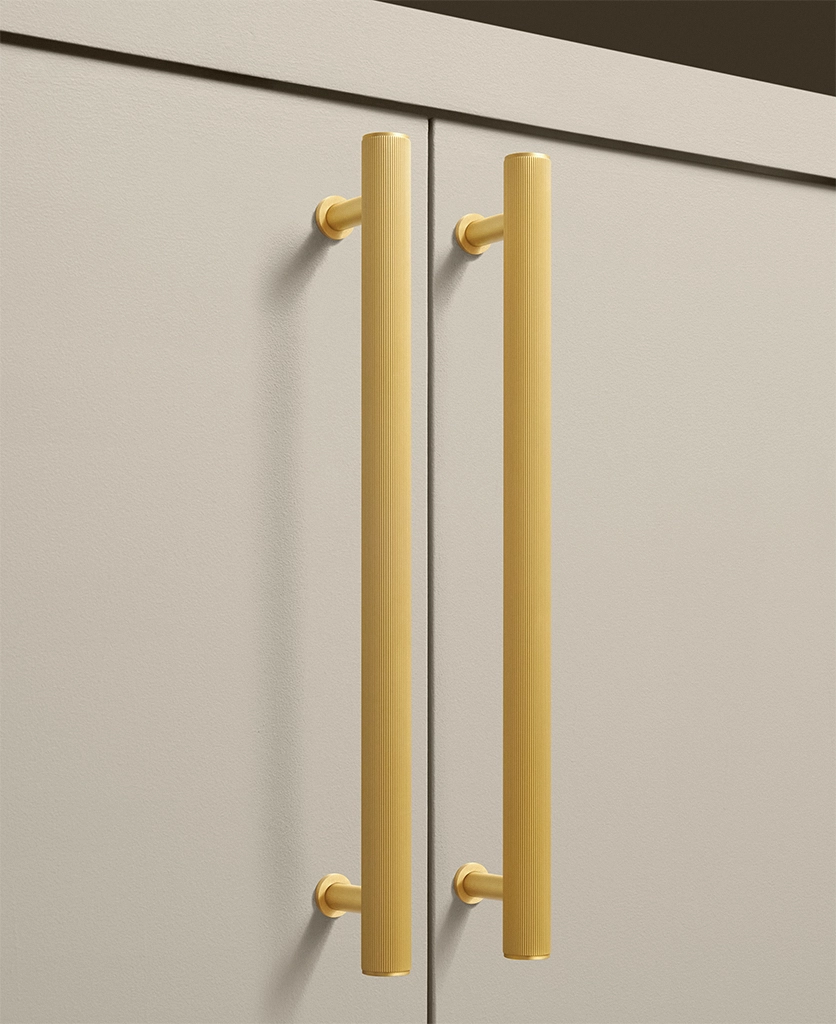 Gold Portico ribbed handles sit beautifully in kitchens, dressing rooms and utility spaces alike. Their architectural form brings structure to shaker cabinetry, while the warm gold finish adds depth to modern homes that risk feeling flat or overly minimal. They’re particularly well suited to neutral palettes, natural stone worktops and layered lighting schemes where material choice does the heavy lifting.