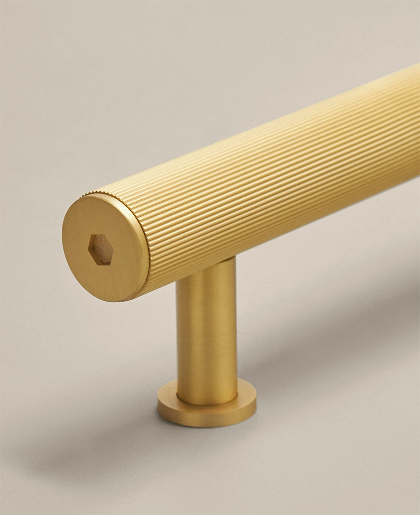 Crafted from solid metal, each handle features a precisely ribbed grip and a refined cylindrical form. For those who like an extra layer of detail, Portico handles can also be finished with optional stepped feet, adding a subtle architectural accent. Designed for cupboards and drawers throughout the home. Suitable for indoor use only.