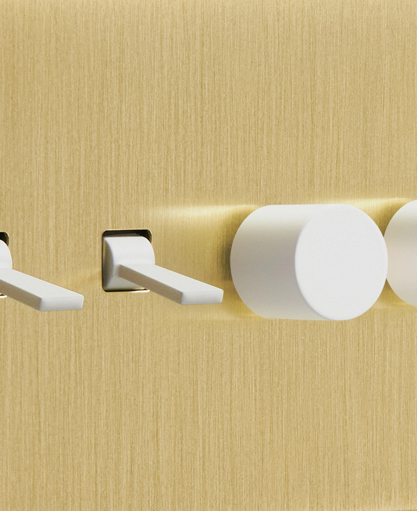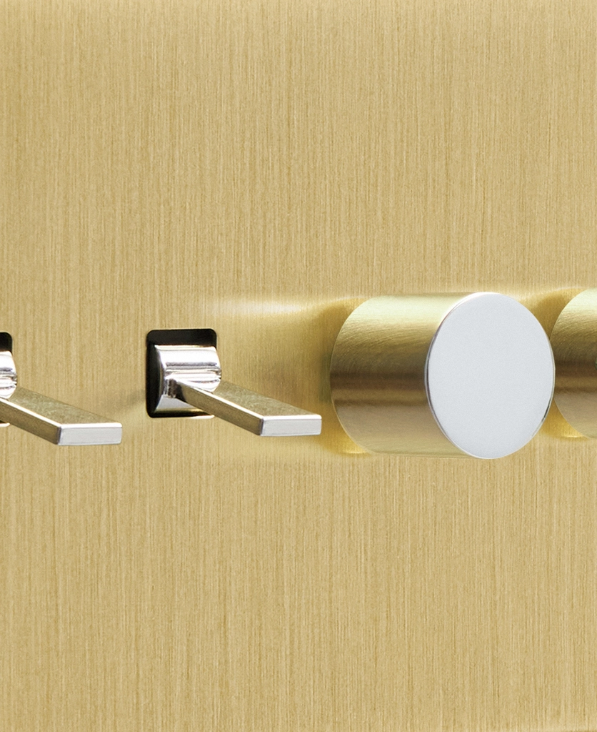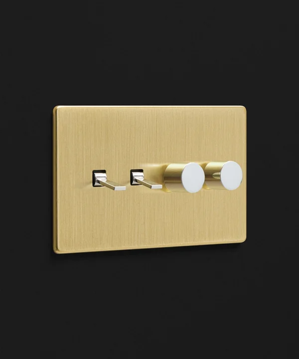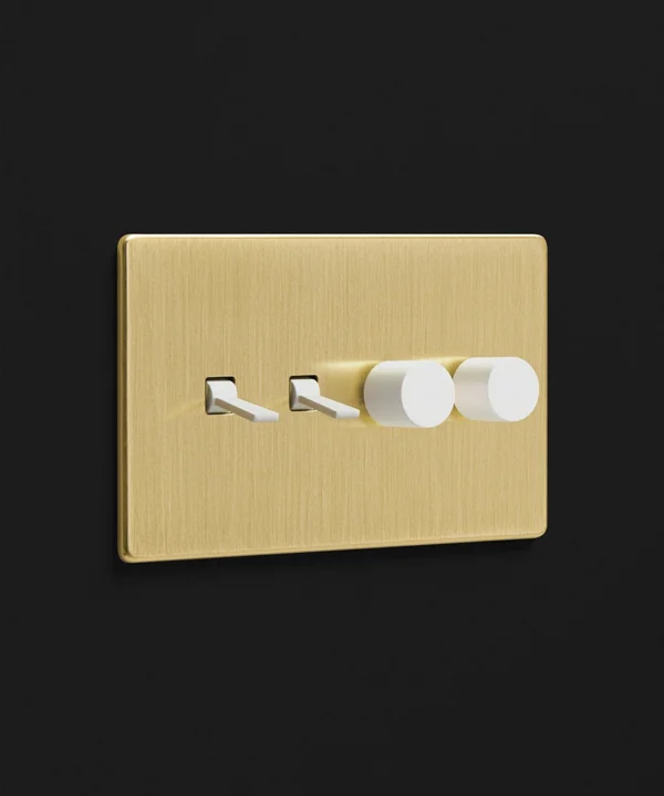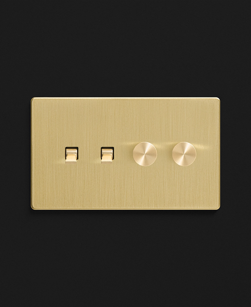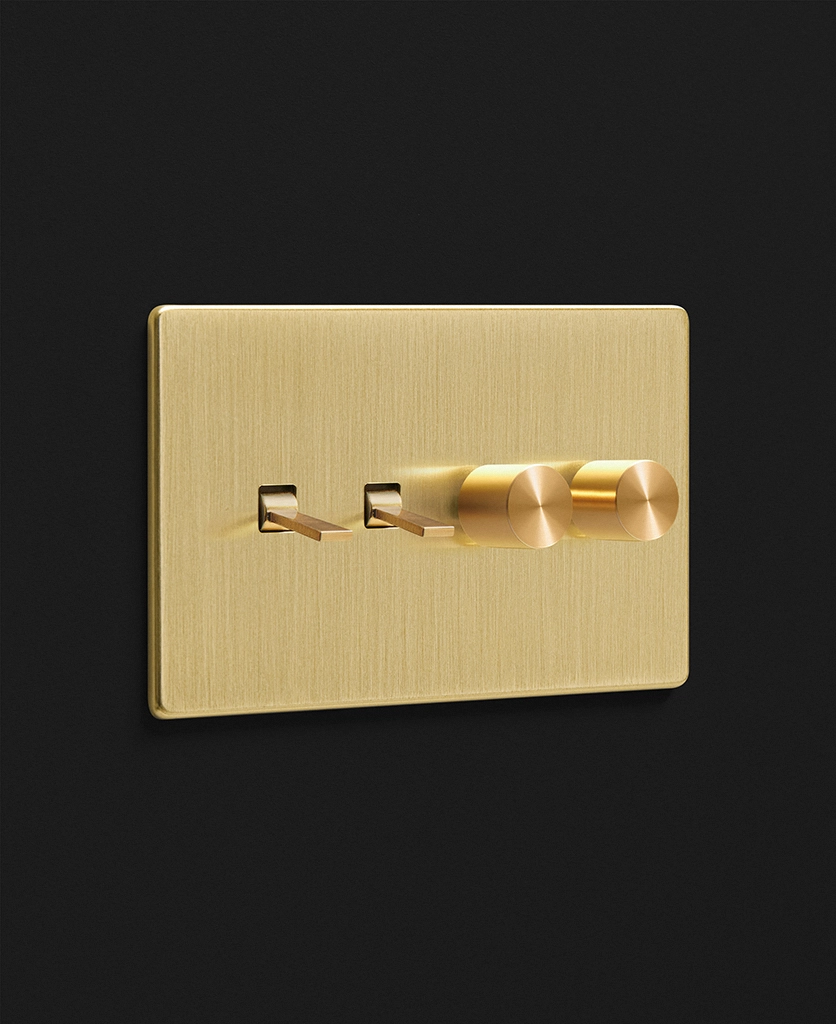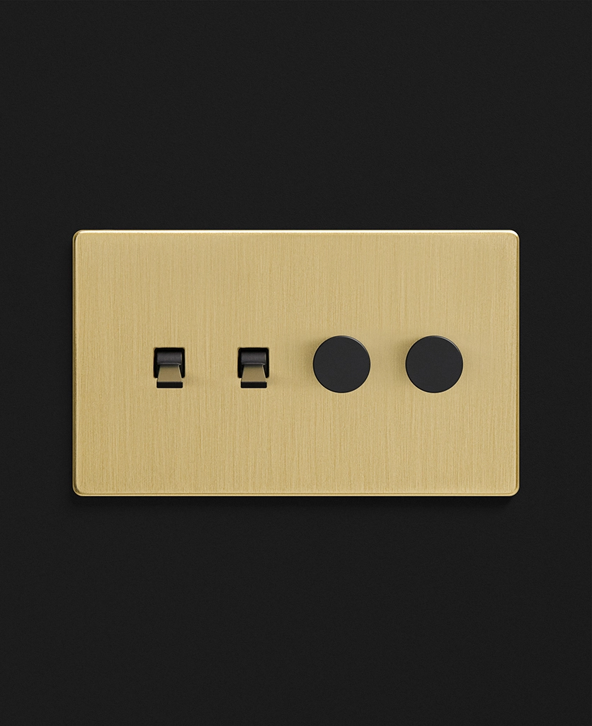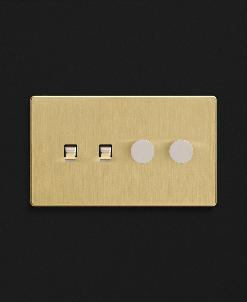 Noticing dense grey clouds blanket your windows, you stand and head towards the brushed gold light switch. Rain patters against the glass, and you gently twist the dimmer dial, illuminating your kitchen island lights to create a soft ambience. You love having toggles and dimmers on one switch plate, making it easy to flick on your task lighting whilst still being able to adjust the mood when the moment calls.