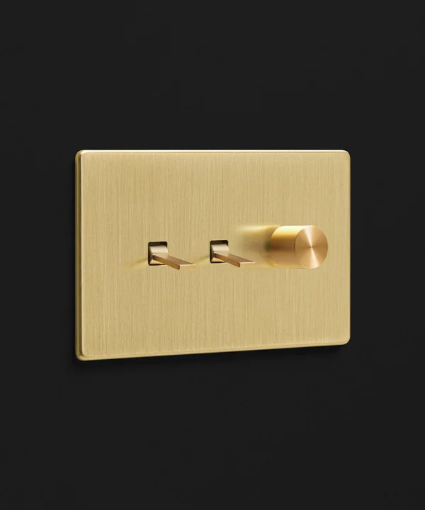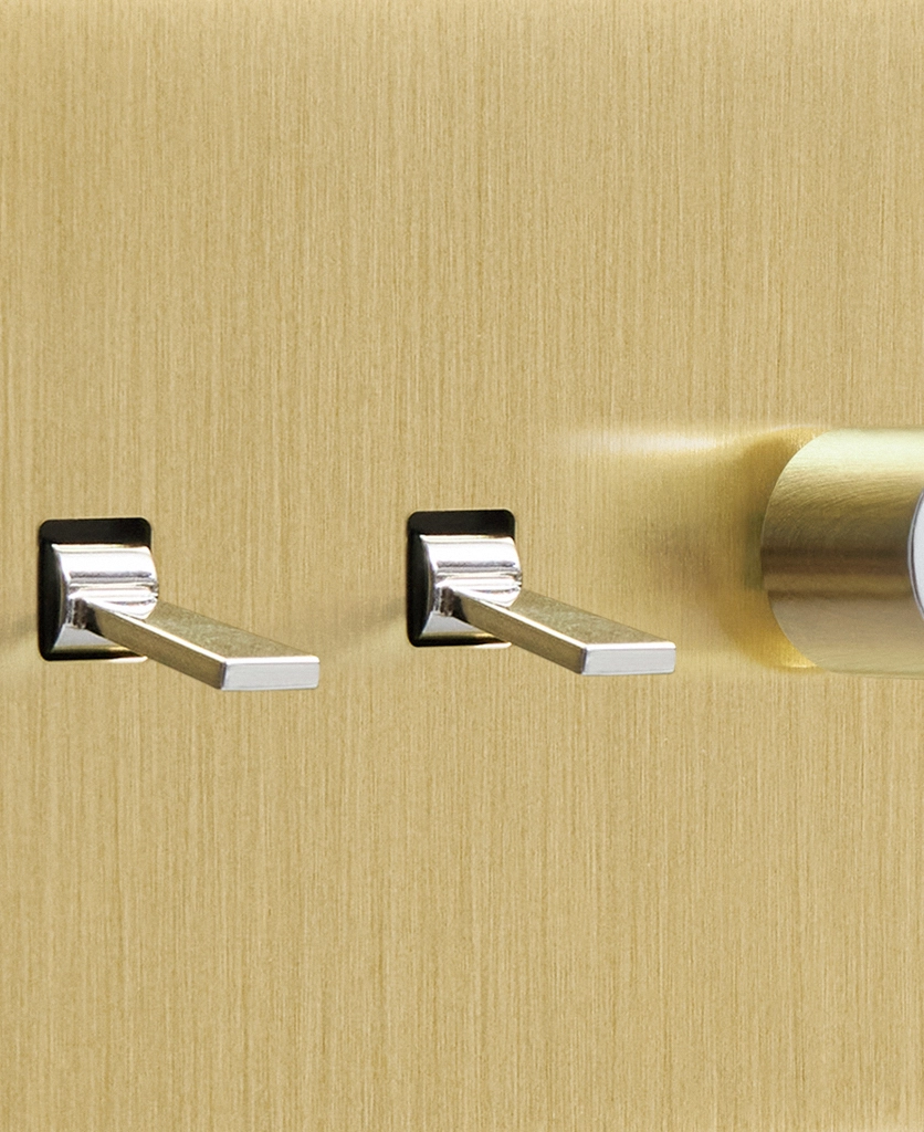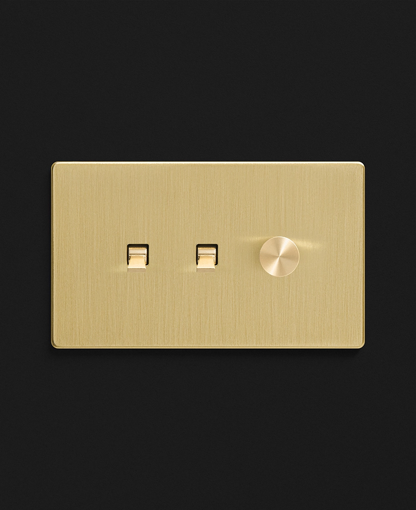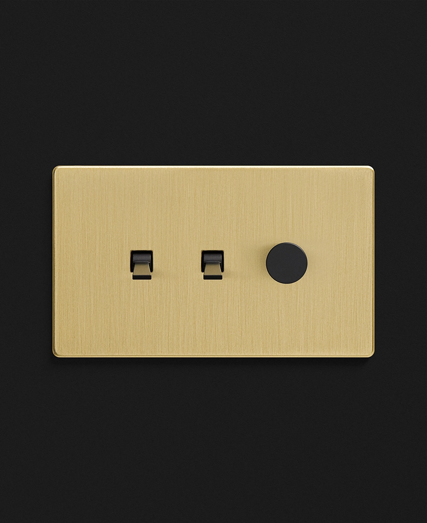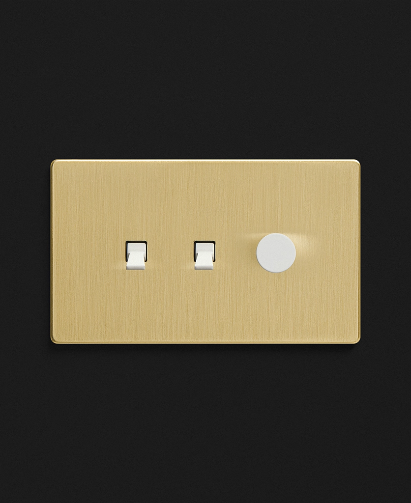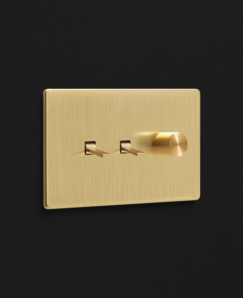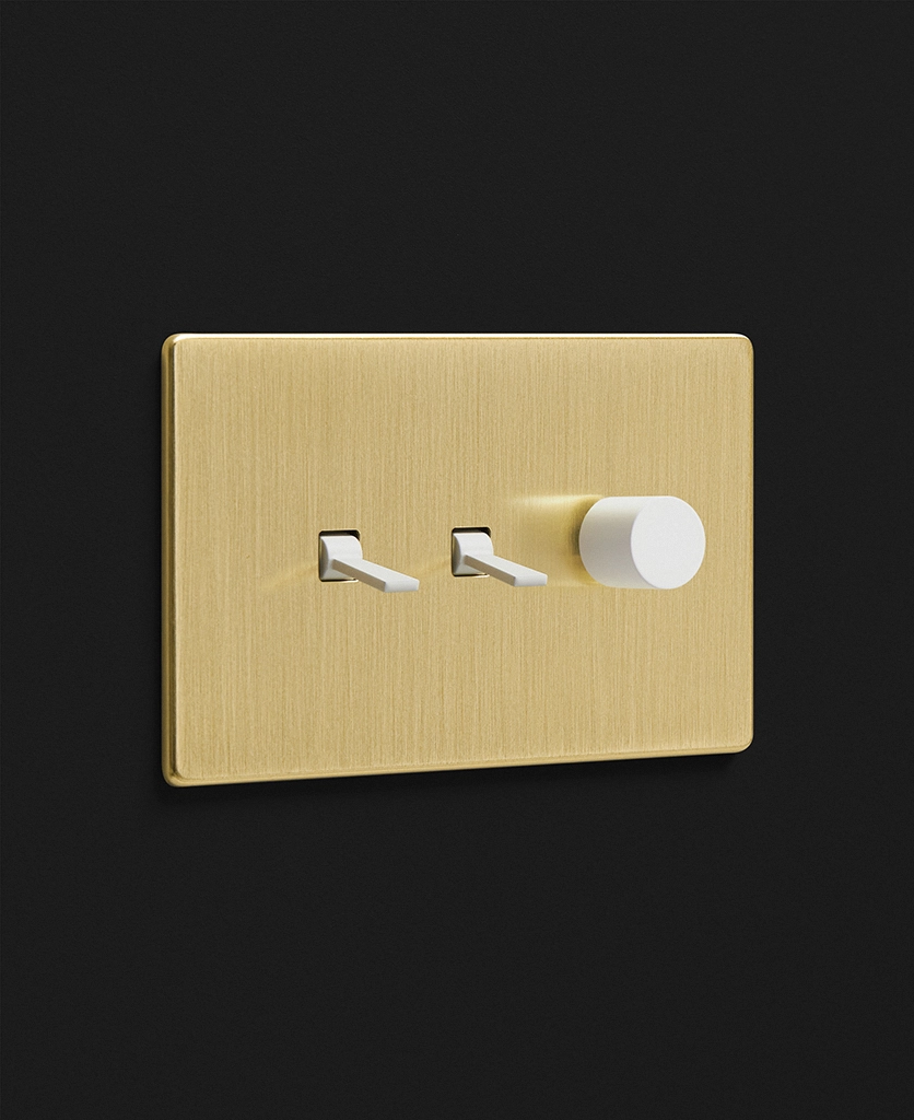 Wearily slotting your keycard into the door of your hotel room, you enter the space and flick the toggle of the triple gold light switch on the wall, smiling at the satisfying click that echoes through the boutique space.