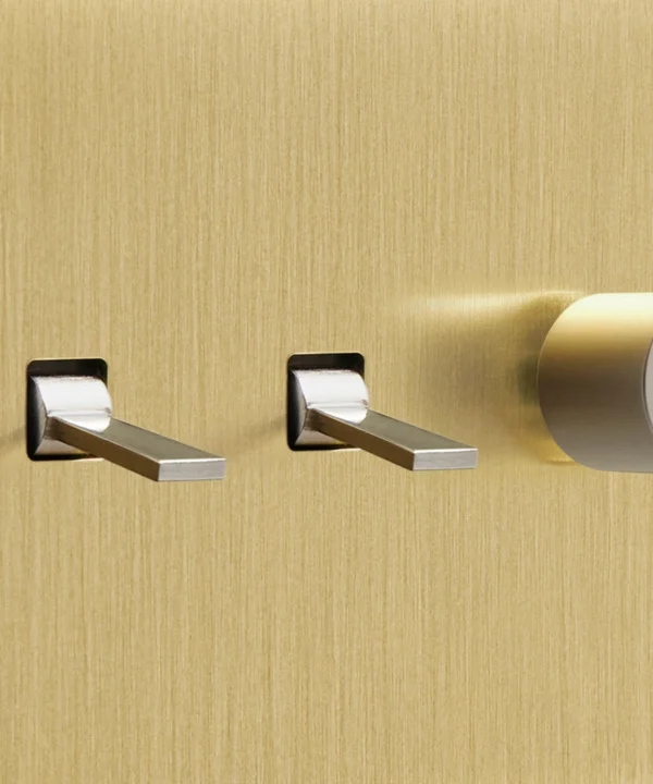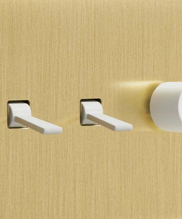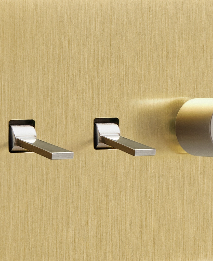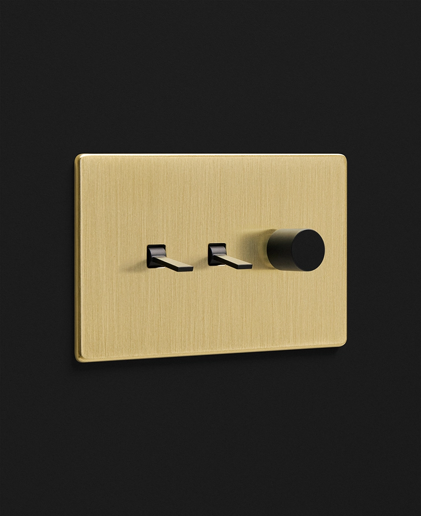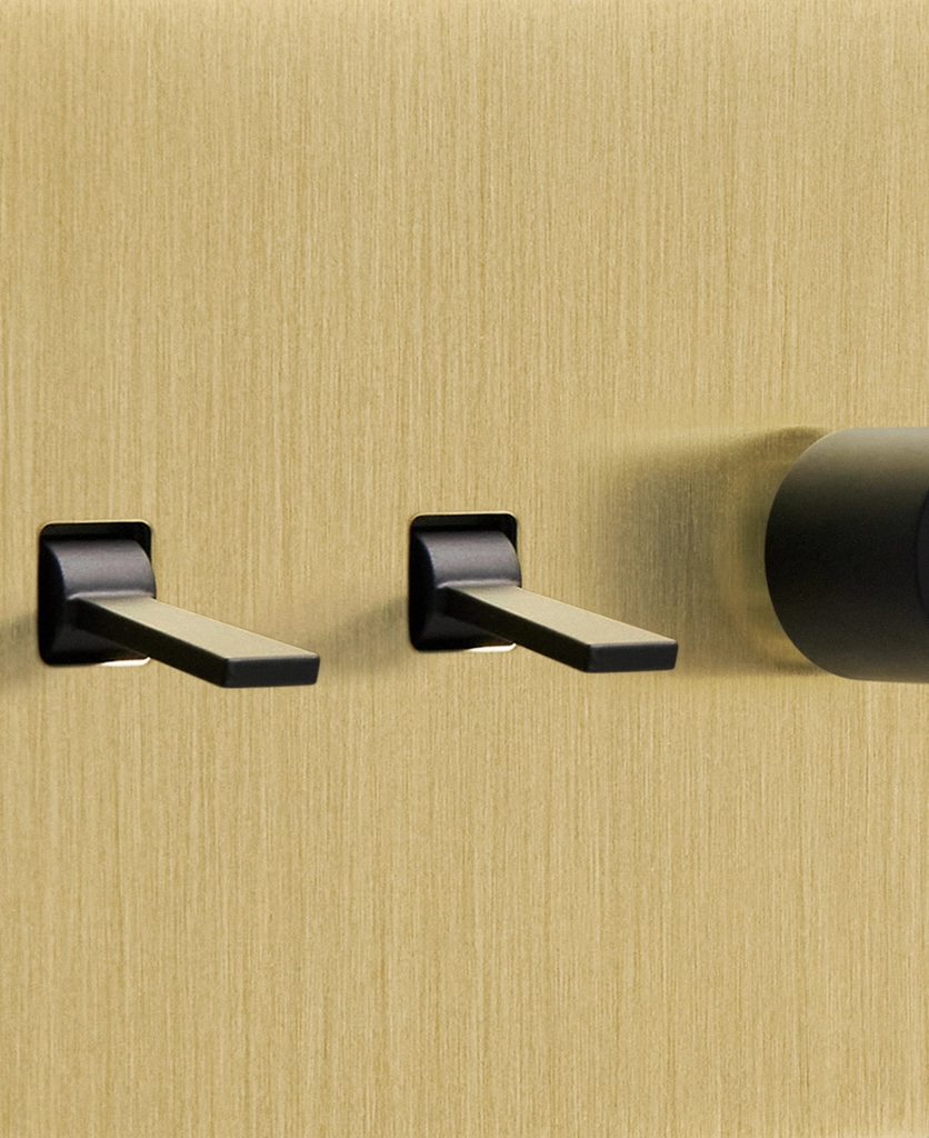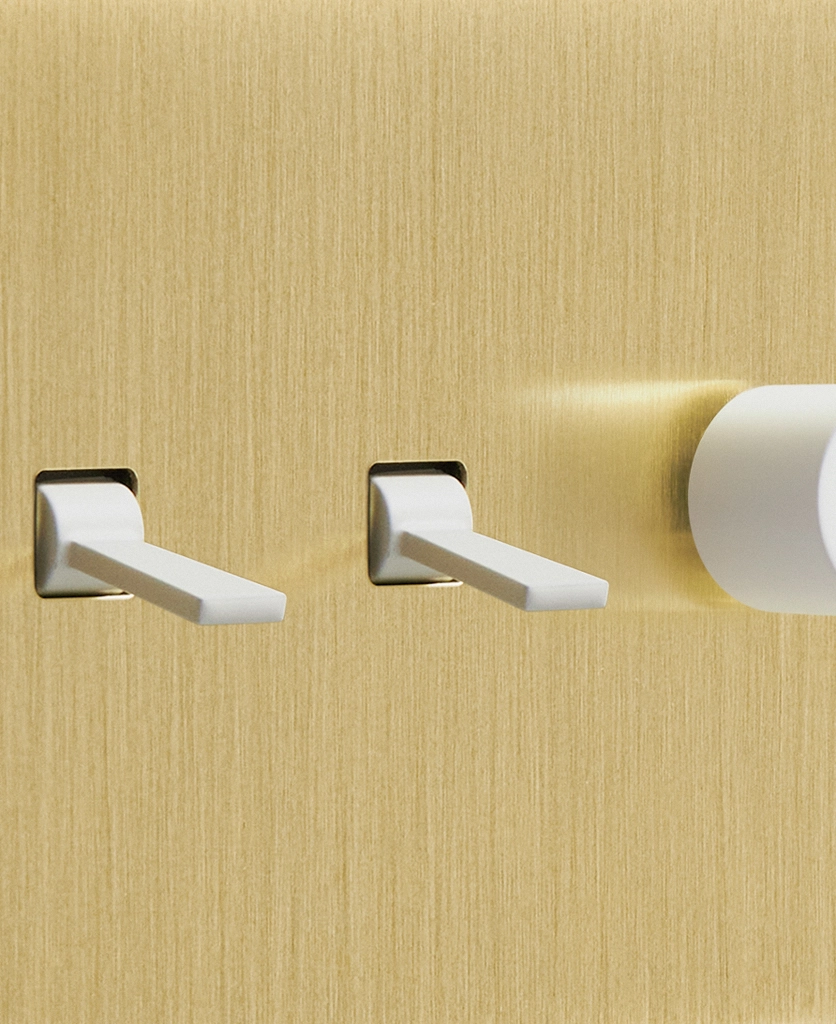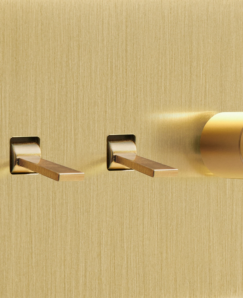 Wearily slotting your keycard into the door of your hotel room, you enter the space and flick the toggle of the triple gold light switch on the wall, smiling at the satisfying click that echoes through the boutique space.