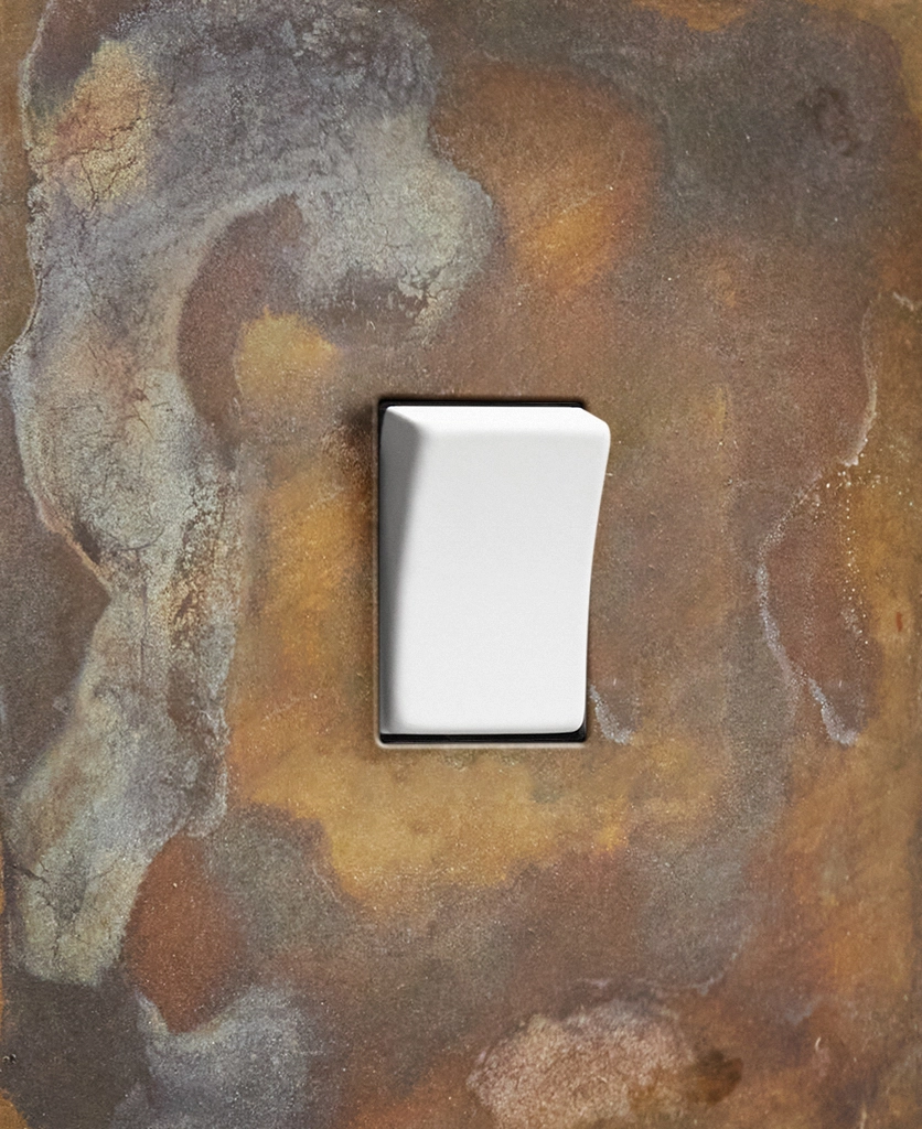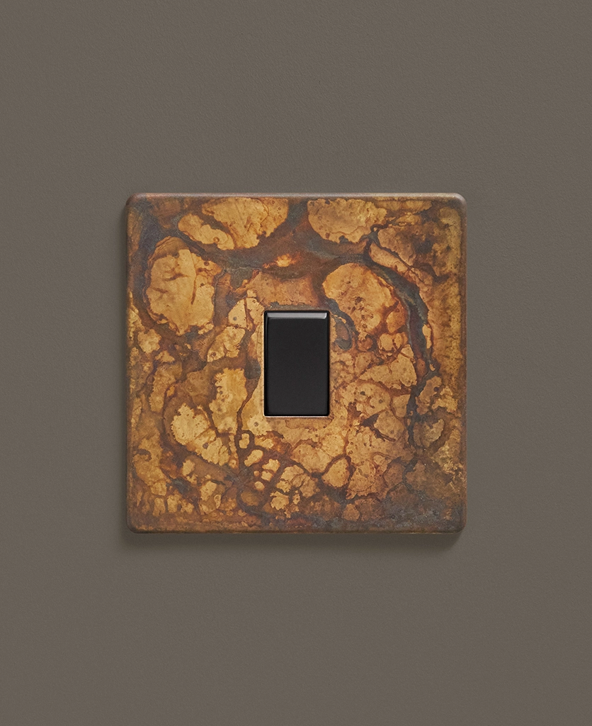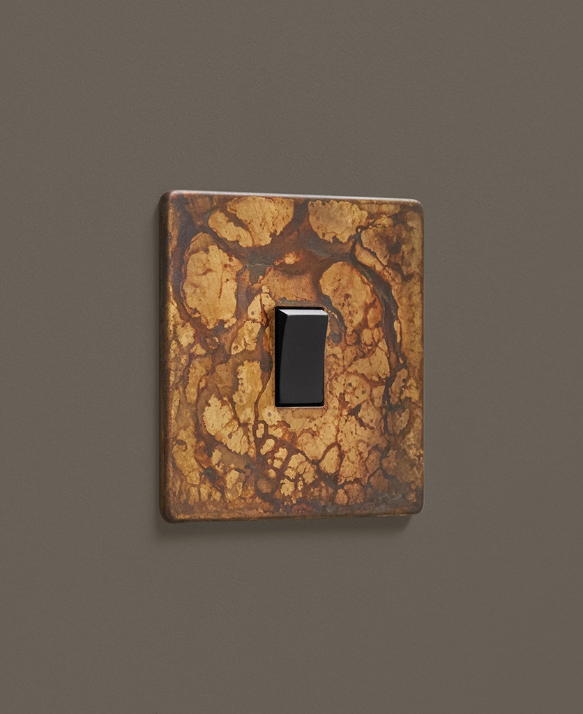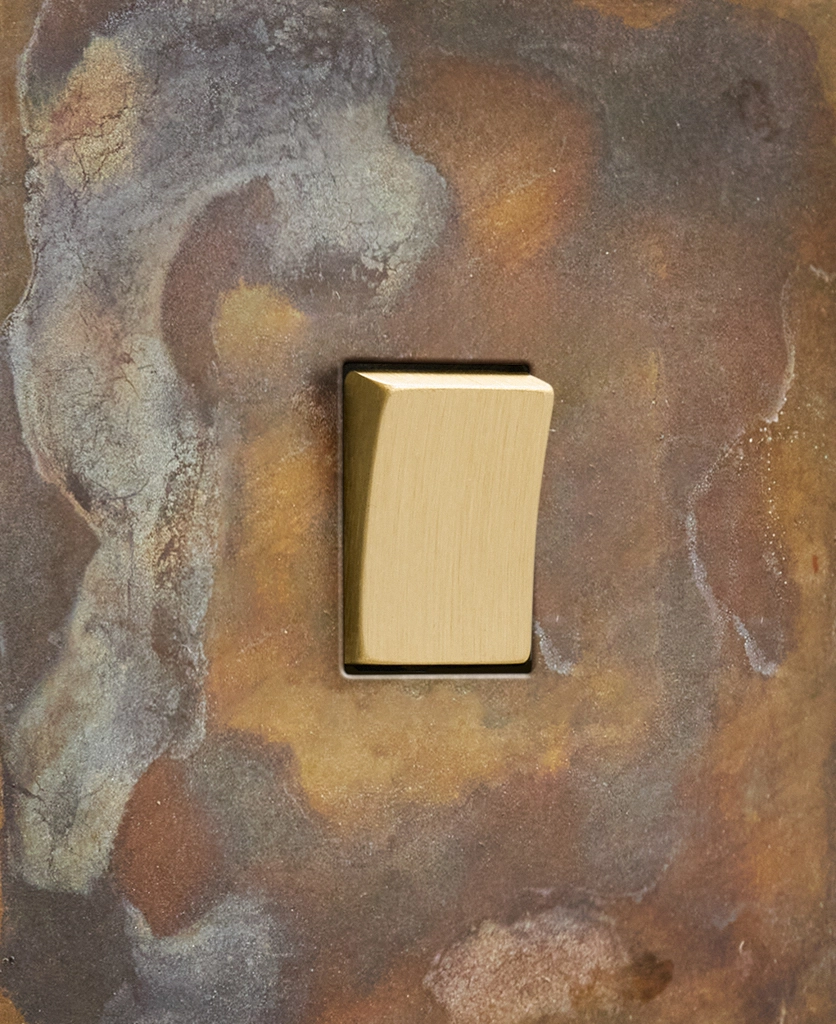 A elemental gold rocker switch is the only way to control your lights. This super-sophisticated matt brass switch looks amazing on soft grey walls where the smokey hues that drift across the surface of the steel plate can really stand out.