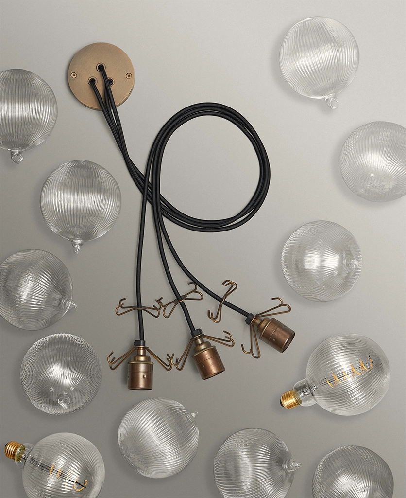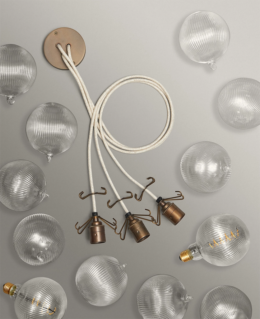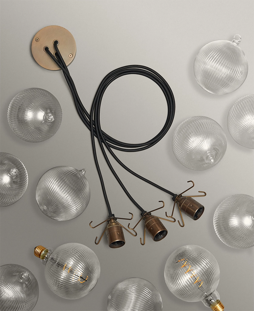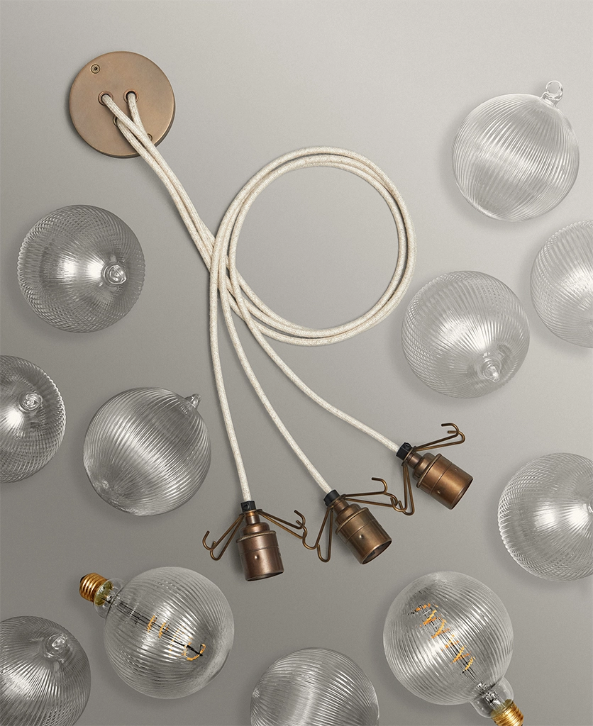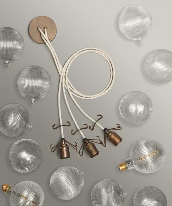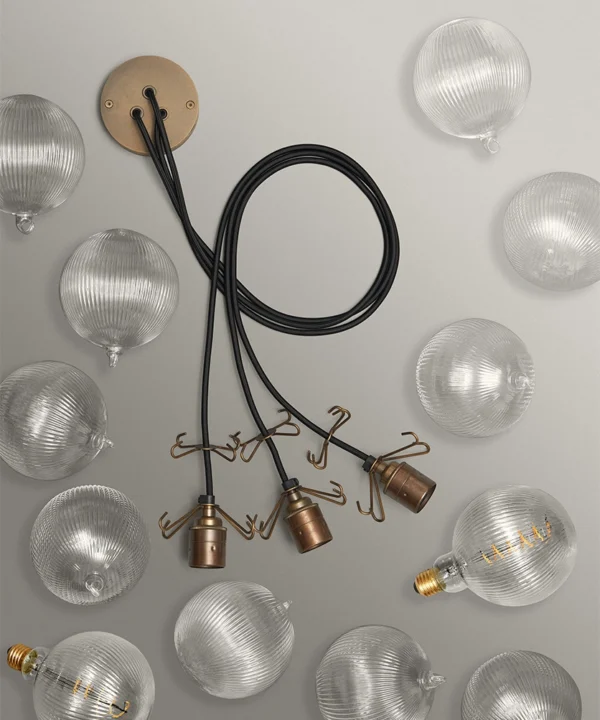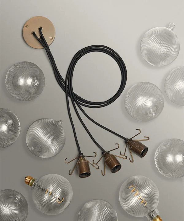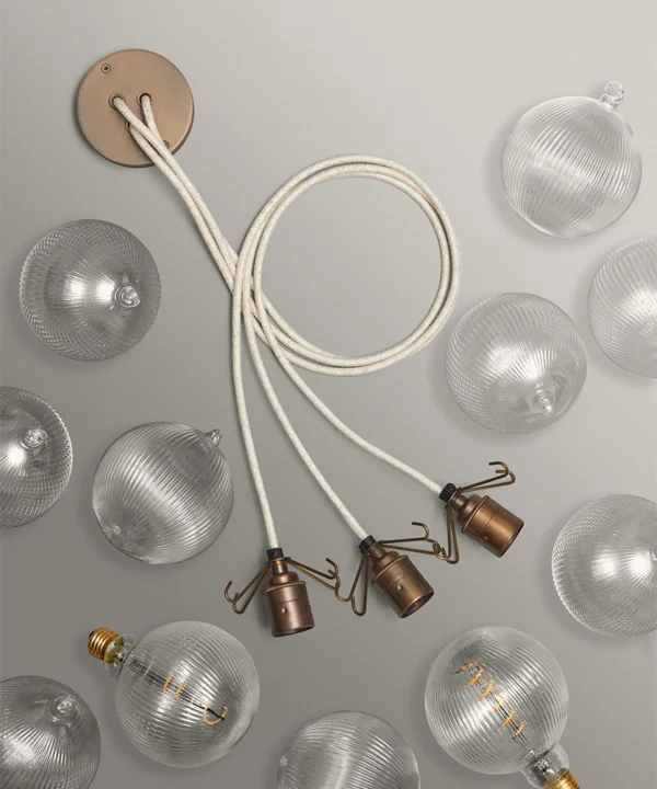 - 12 or 24 clear ribbed glass baubles; 3 XL Fluted Globe Spiral Filament LED bulb, 1m of Oh So Black fabric or Course Linen cable per outlet, 1 antique brass ceiling rose, 3 antique brass bulb holders, 1 x antique brass 4-point hook per length of cable (12 baubles) or 2 x antique brass 4-point hooks per length of cable (24 baubles); instructions; connectors and ceiling bracket.