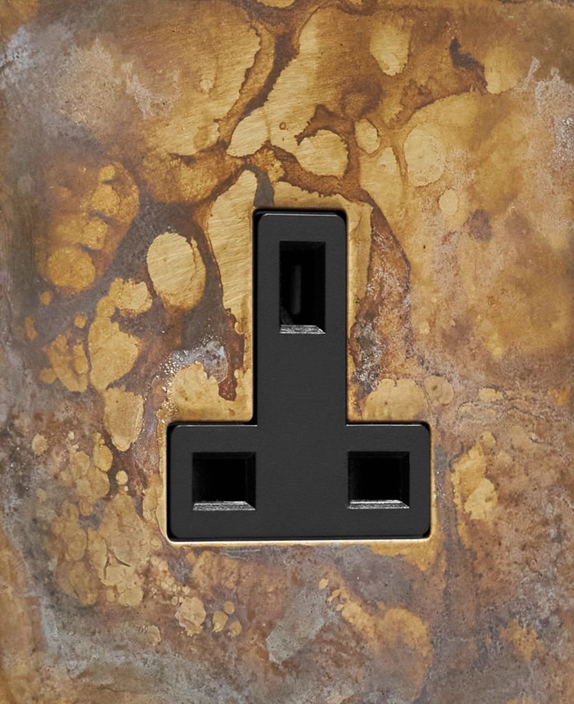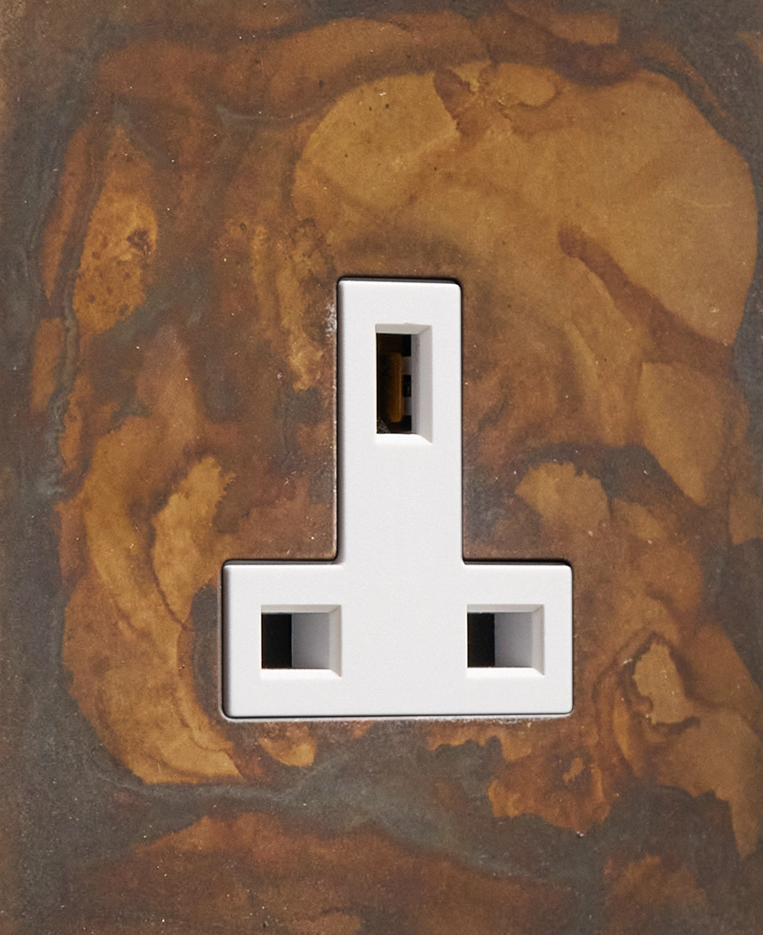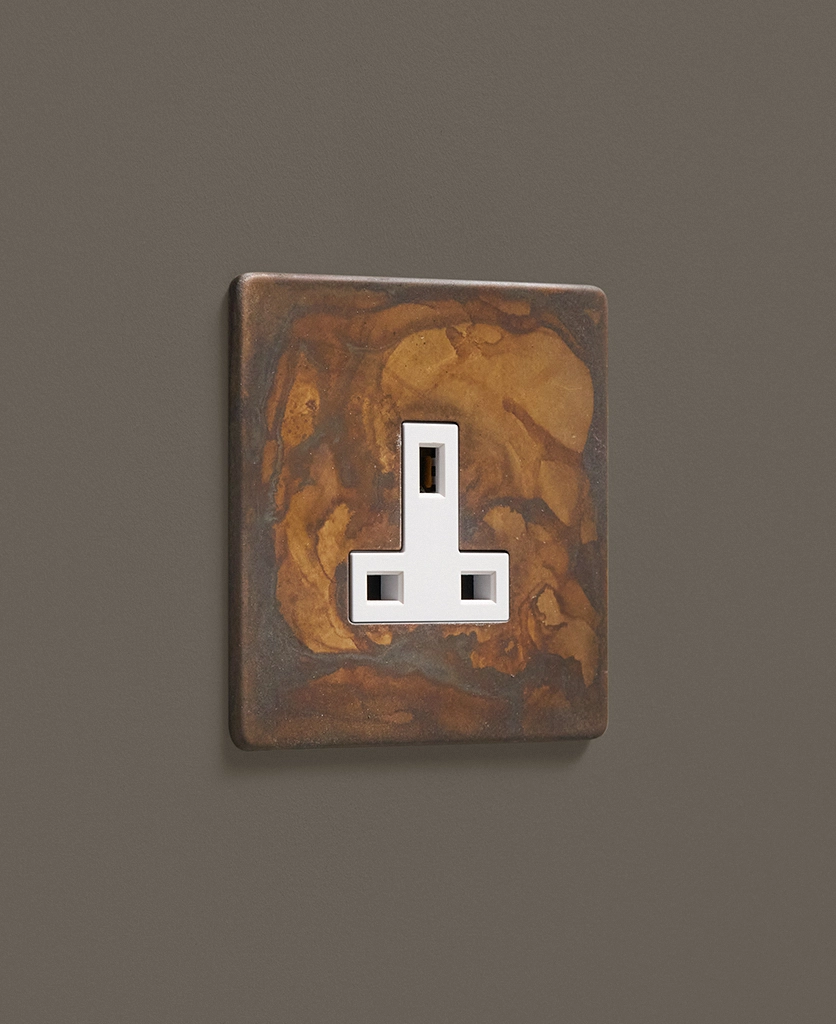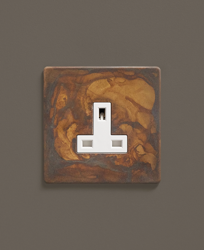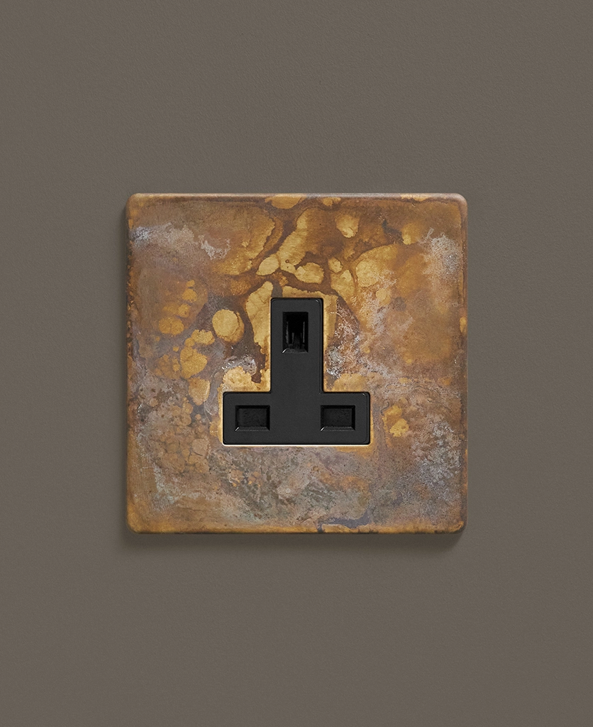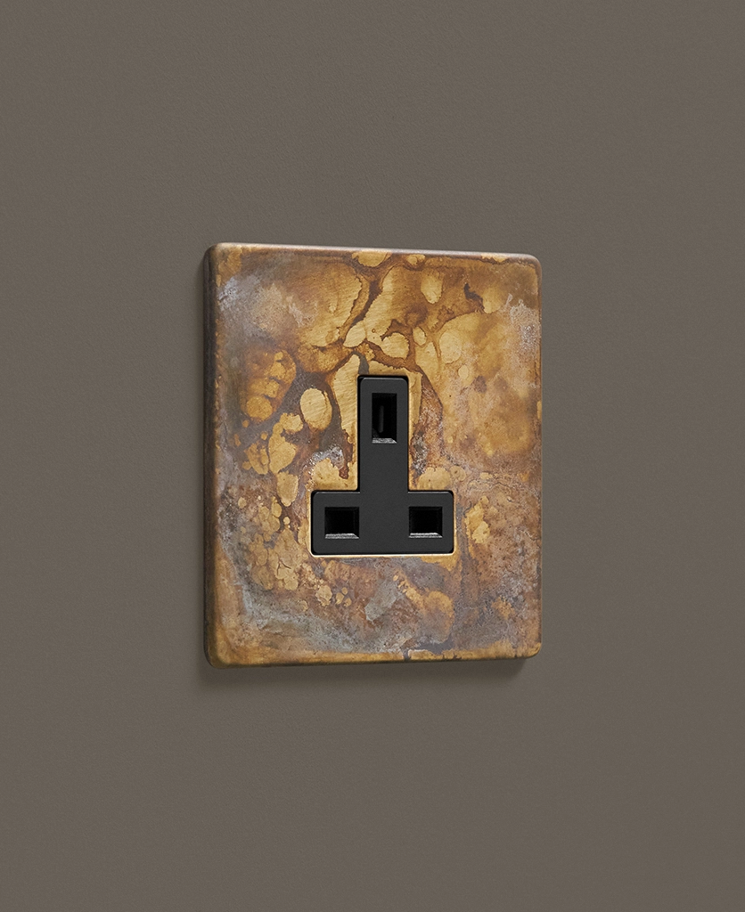 Elemental gold is a finish that's perfect for introducing a touch of decadence to your spaces, whether this is a crisp white space that needs a metallic touch to amp up the glam or a richly painted room where this lavish switch will be right at home. Take a look at our high pigment paint collection for more colour inspiration. We love this vintage-inspired metal plug socket on dark grey walls, where the smokey hues can really be complemented. Complete the look with gold accessories like drawer knobs and internal handles to add to the sophistication.