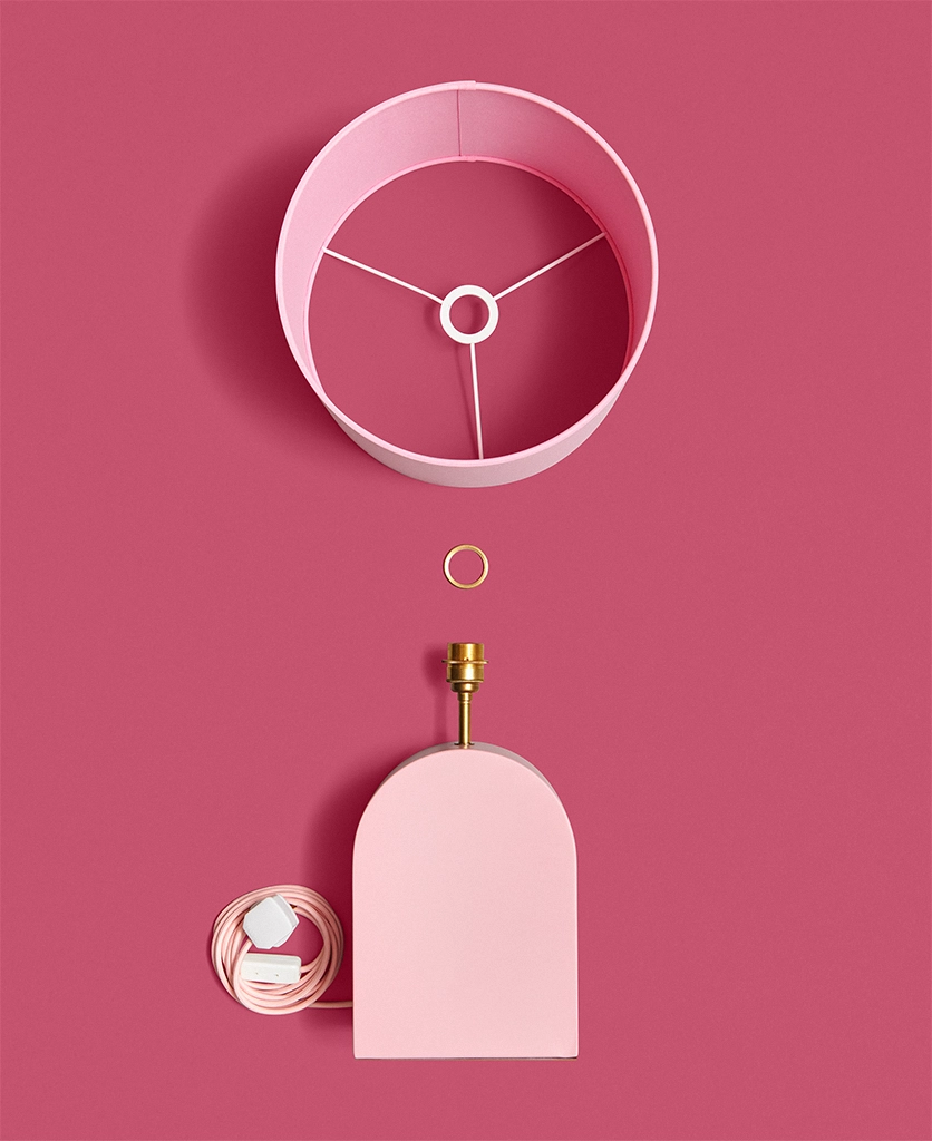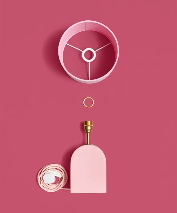 - Included: steel base, fitted with pink fabric cable, white plug, white inline switch, brass bulb holder, felt base and lamp shade