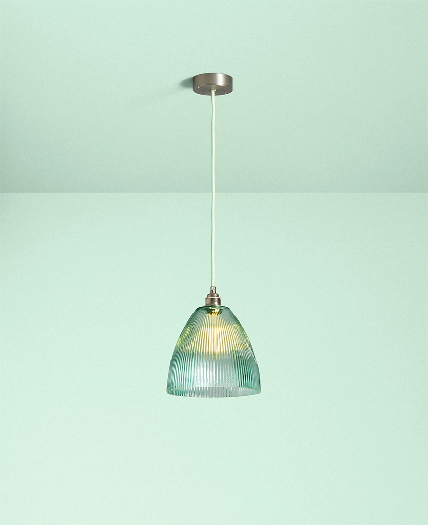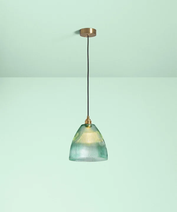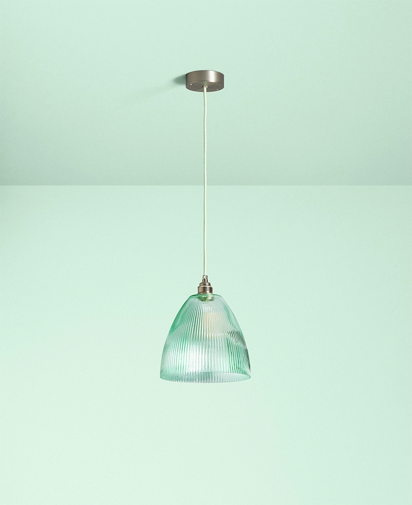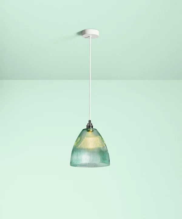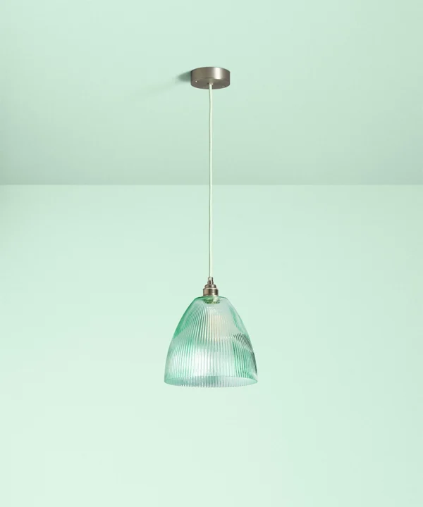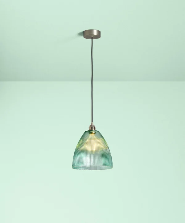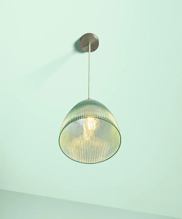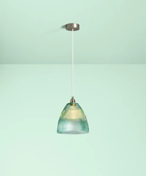 A vintage-inspired fluted glass pendant designed to introduce soft mint colour and gently focused ambient light to kitchens and dining spaces.