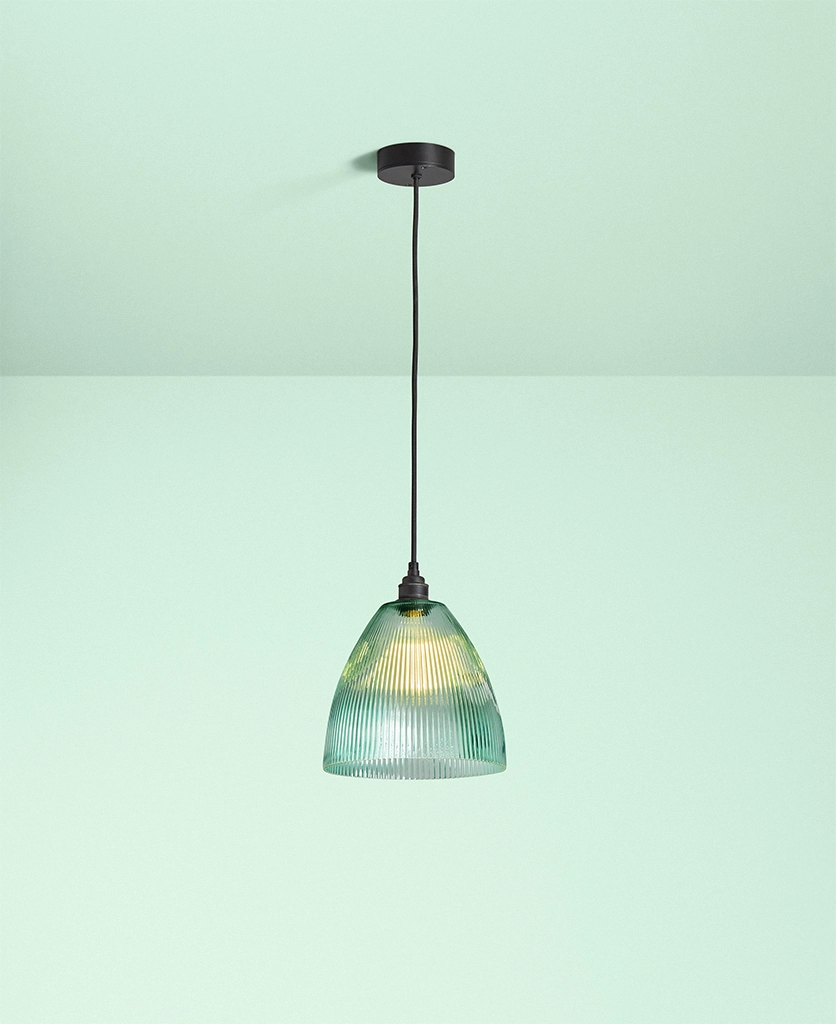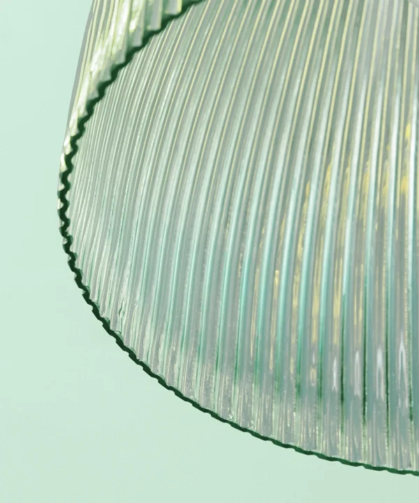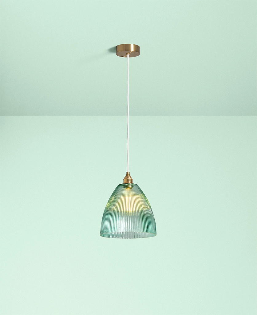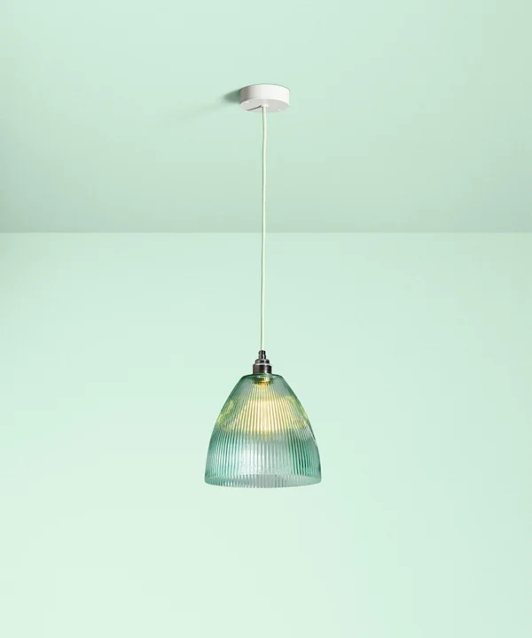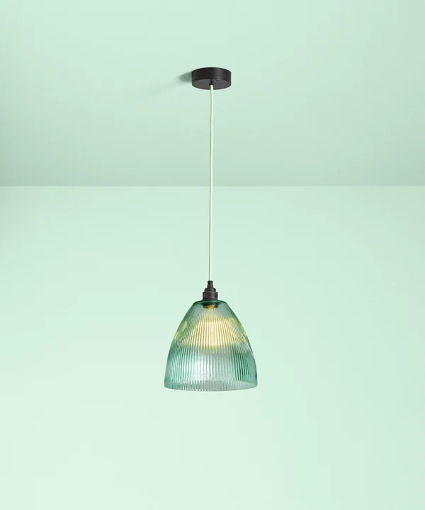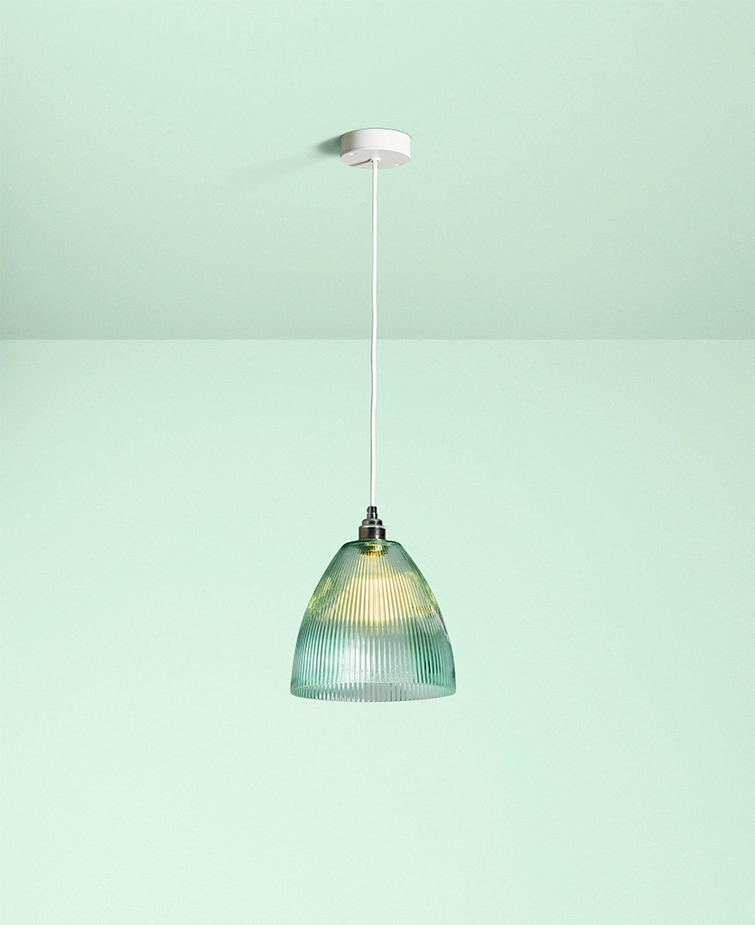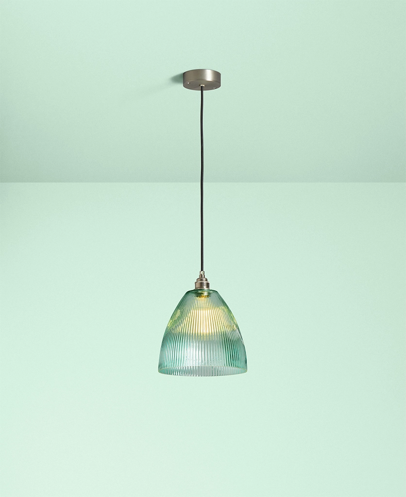 A vintage-inspired fluted glass pendant designed to introduce soft mint colour and gently focused ambient light to kitchens and dining spaces.