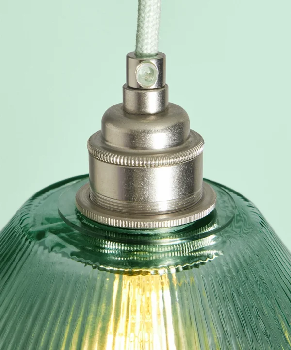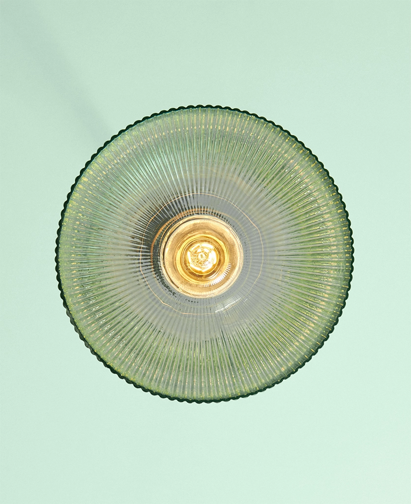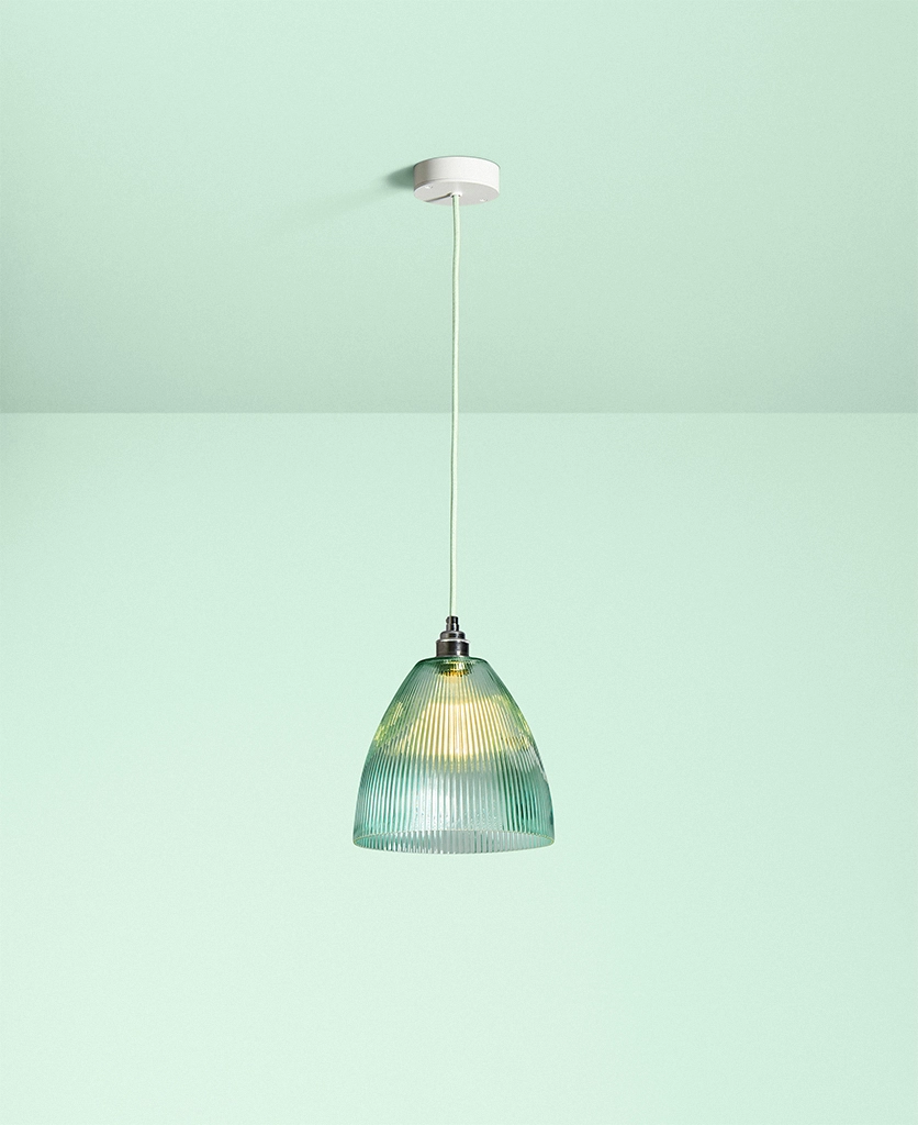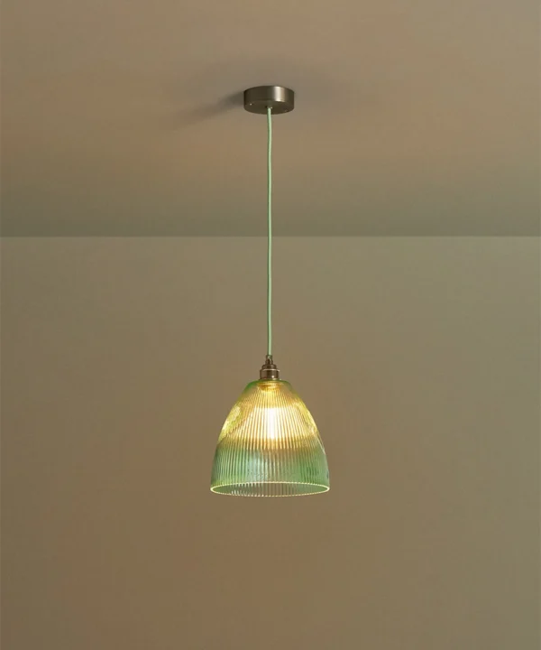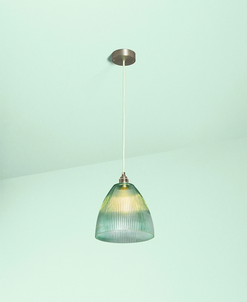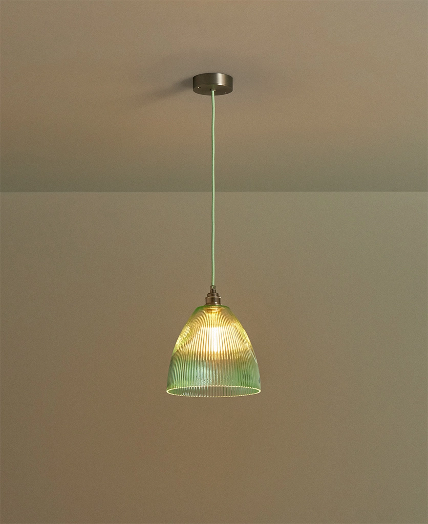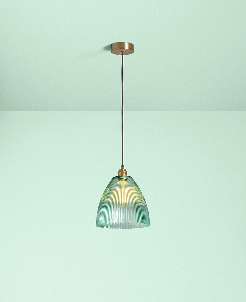 A vintage-inspired fluted glass pendant designed to introduce soft mint colour and gently focused ambient light to kitchens and dining spaces.