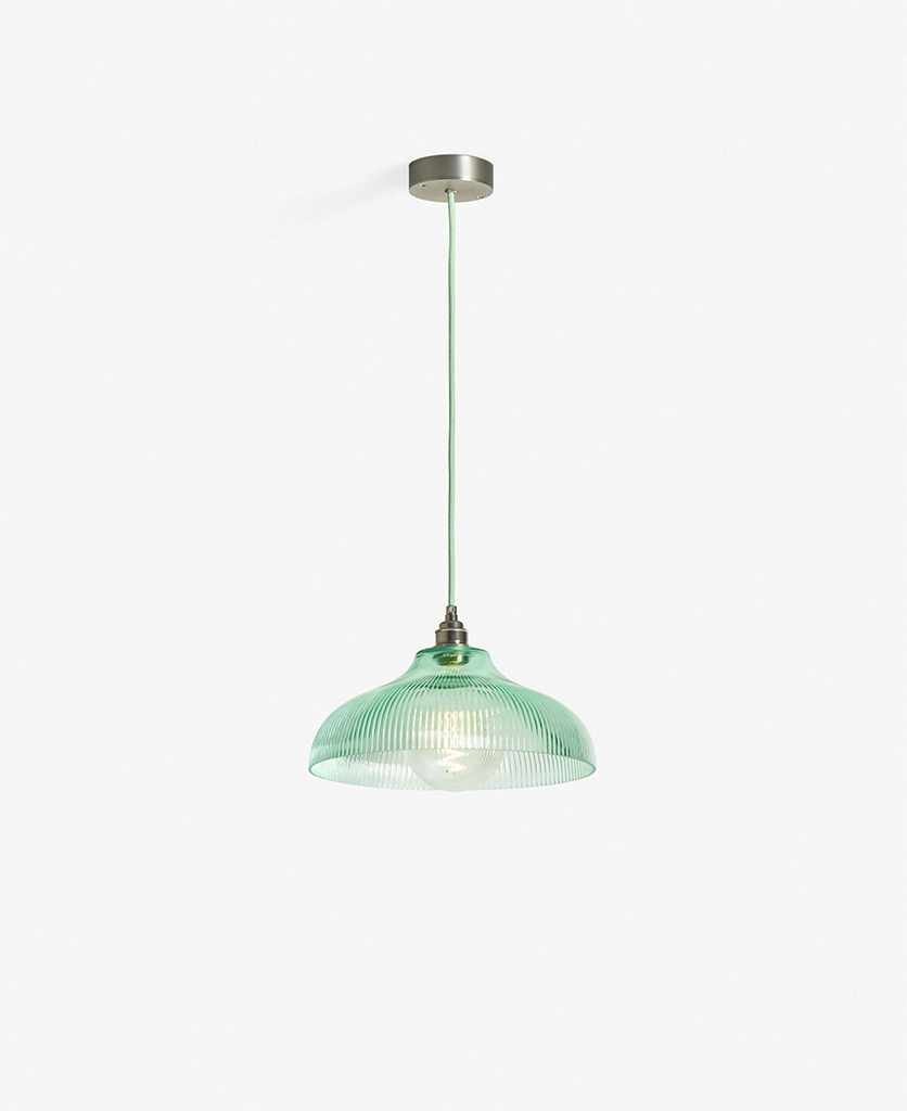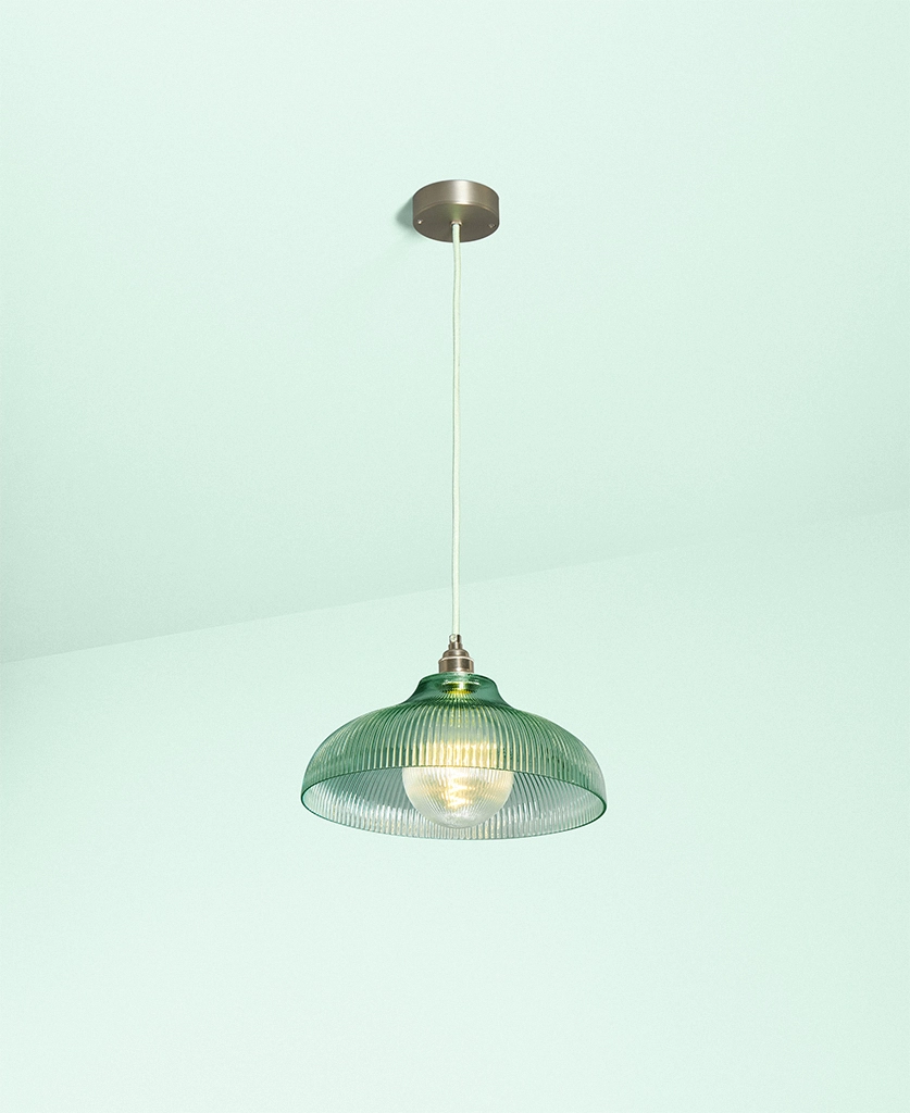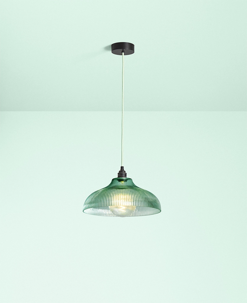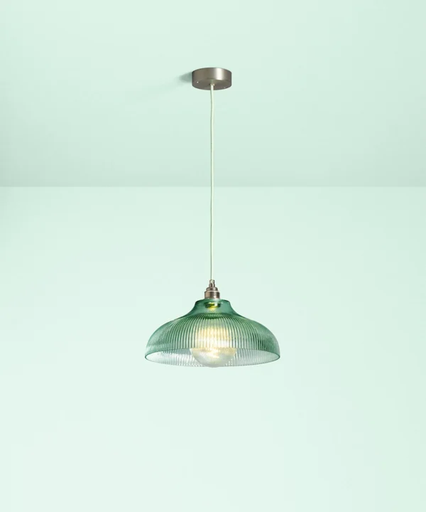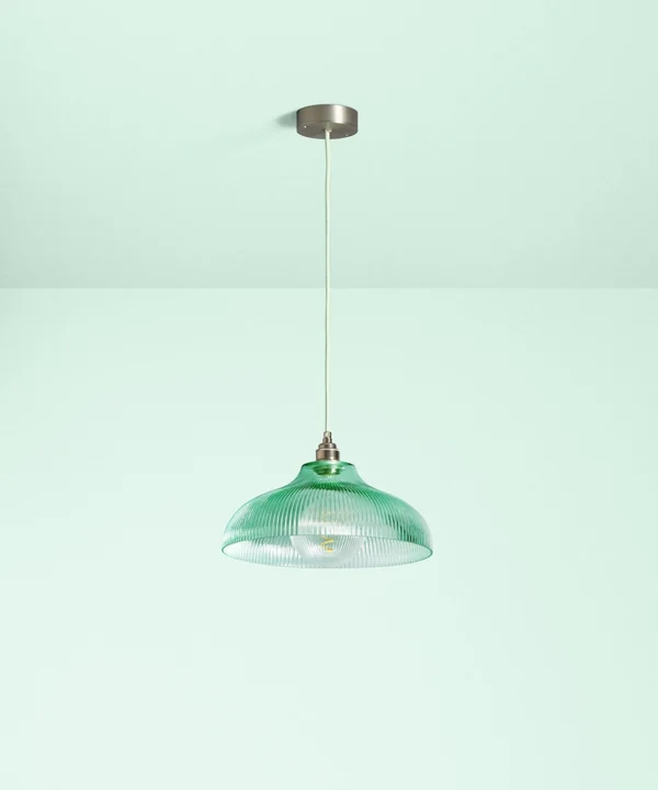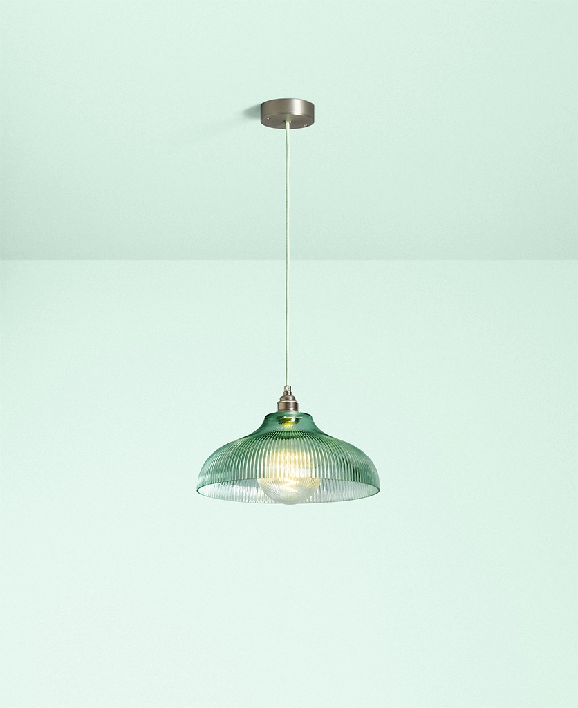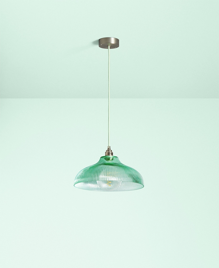 A vintage-inspired fluted glass pendant designed to introduce soft mint colour and gentle texture to kitchens and dining spaces.