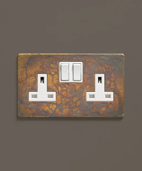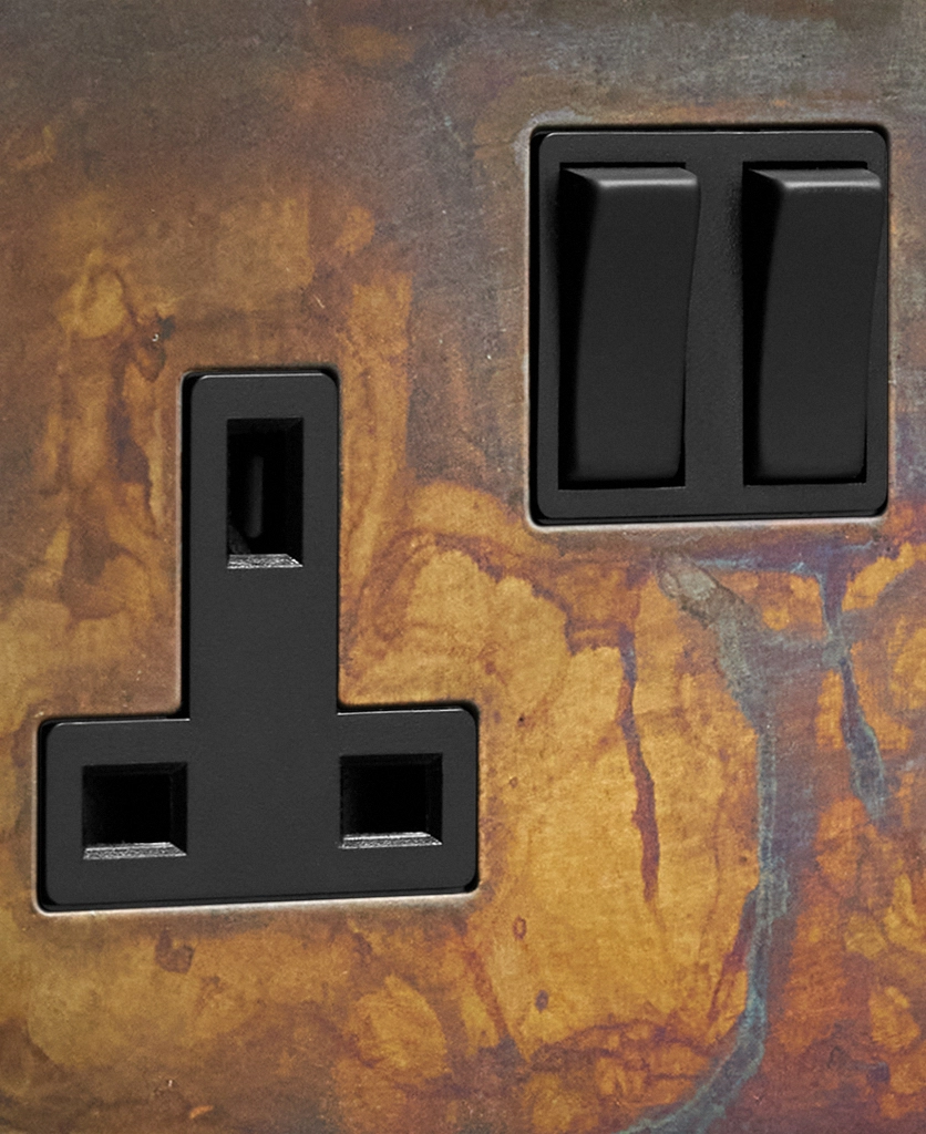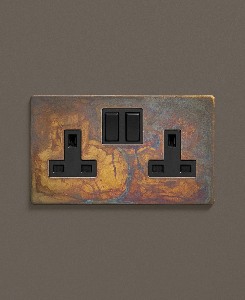 If you’re looking for an industrial style alternative to your mundane white plastic electrical sockets, then our exclusive elemental gold double sockets are just the job. Each features a beautiful rolling pattern of matt gold and charcoal black that transforms these traditional brass sockets into the truly contemporary pieces. These elemental gold double plug sockets show off your creative eye for detail.