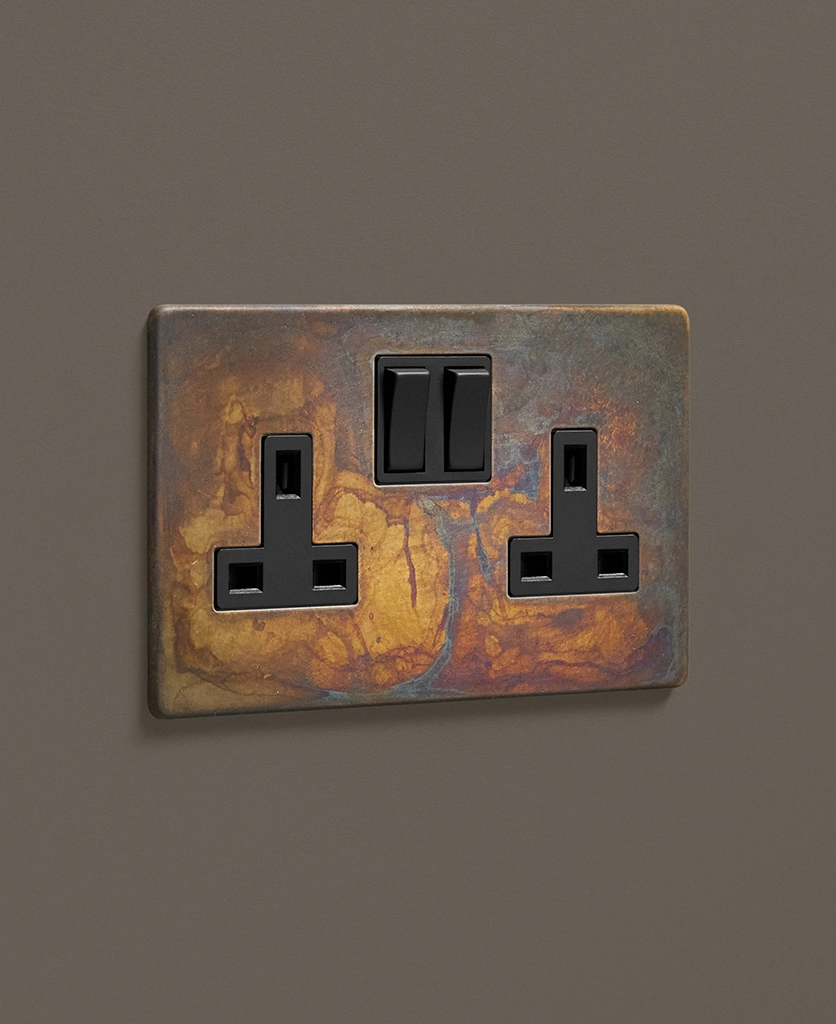 Showcase your elemental gold plug socket against indulgently bold complimenting interiors. Colours from this 1920's era were softer, more faded versions of the stronger Victorian colours we know. Lighter, natural and more jovial somehow. Elemental gold and black looks amazing against soft aubergine, warm stone, and coffee browns.