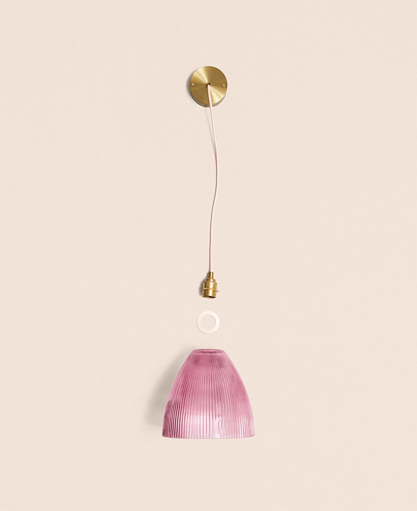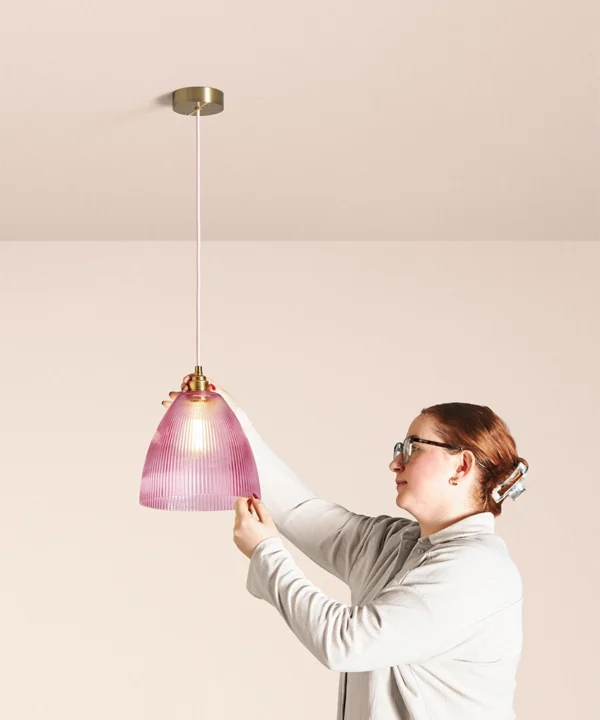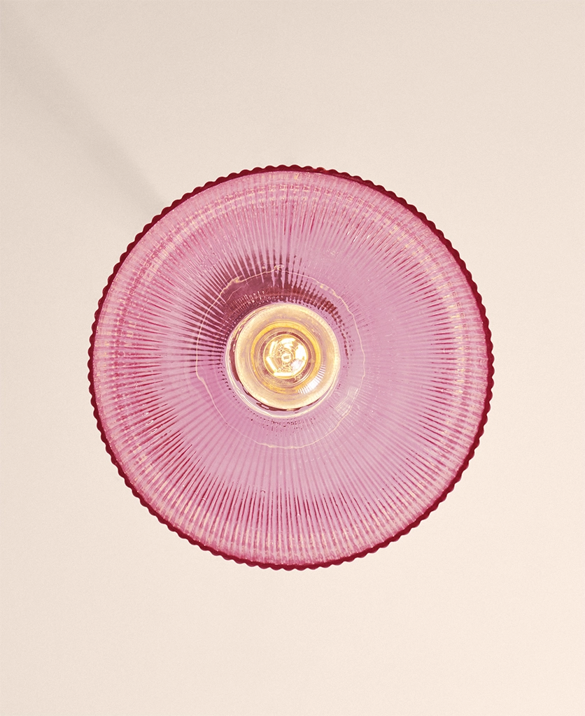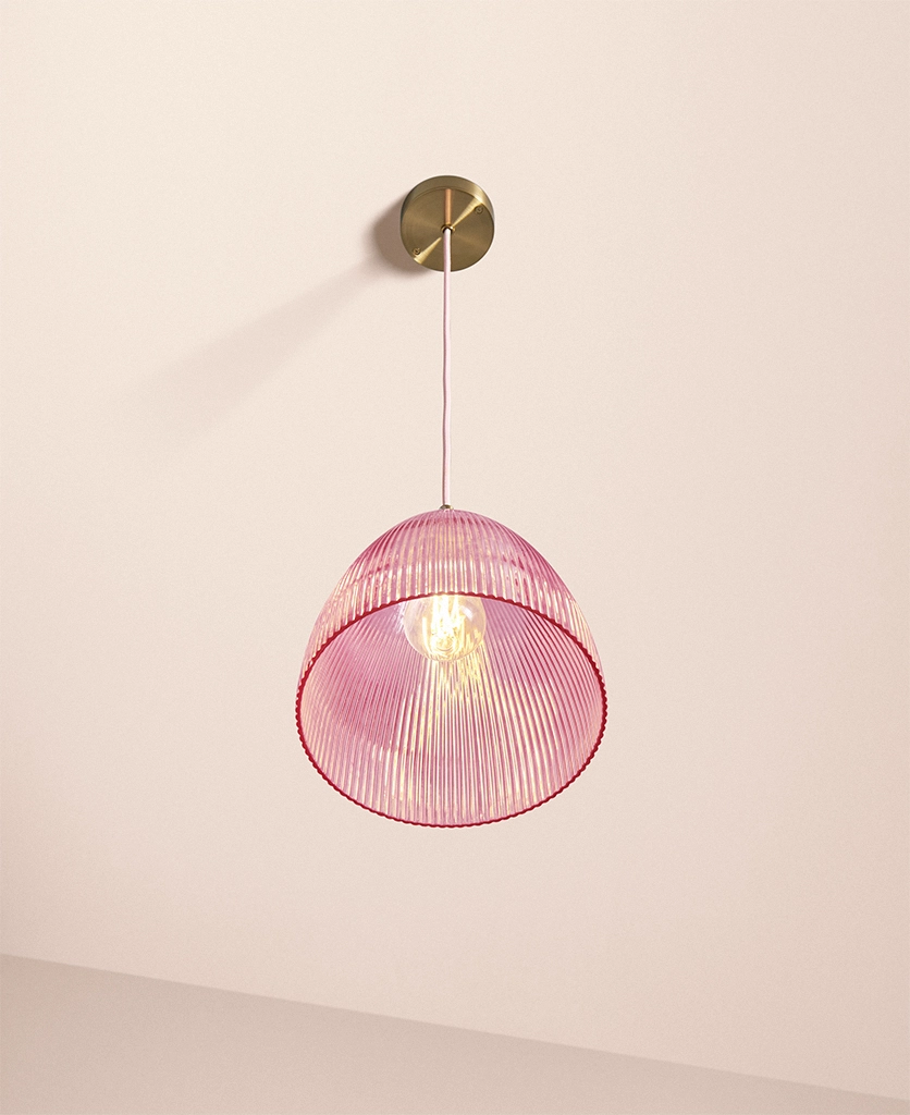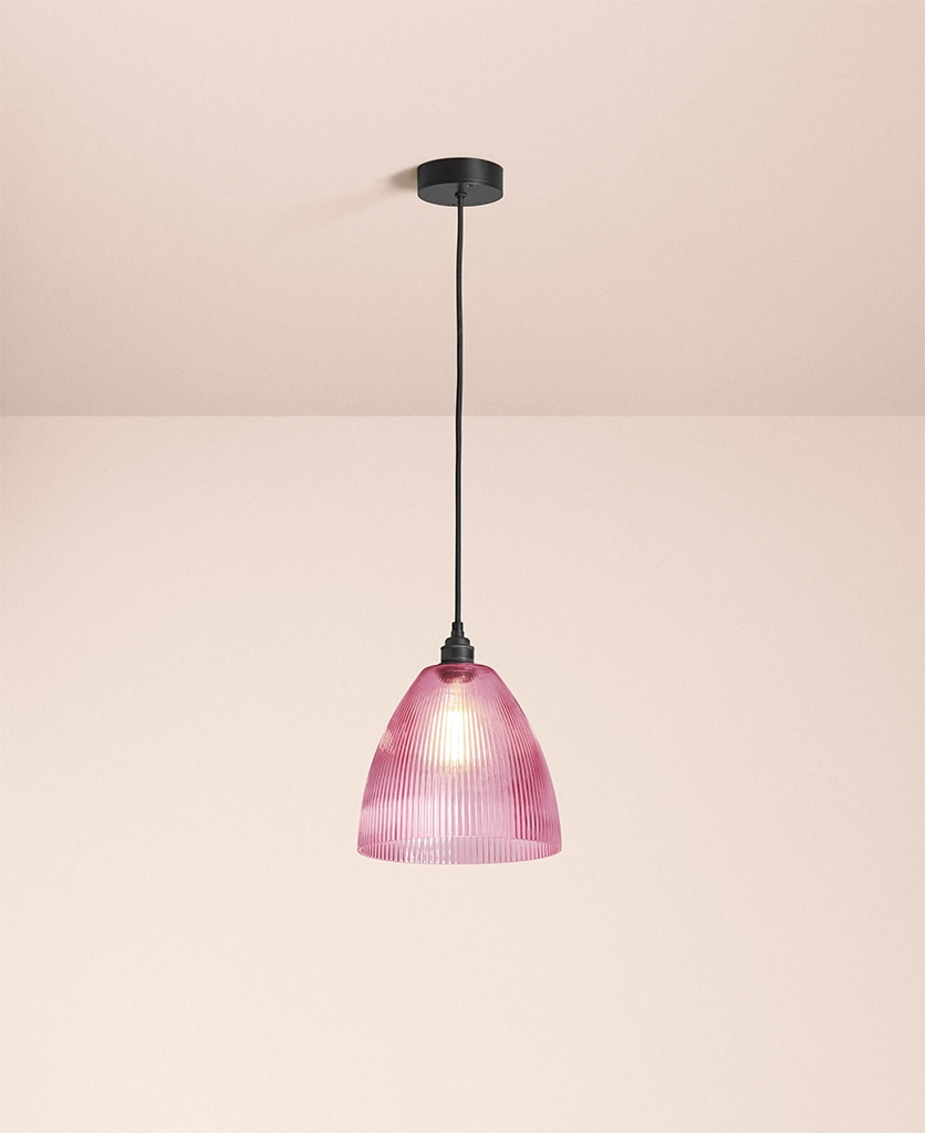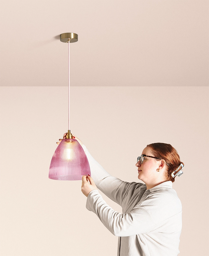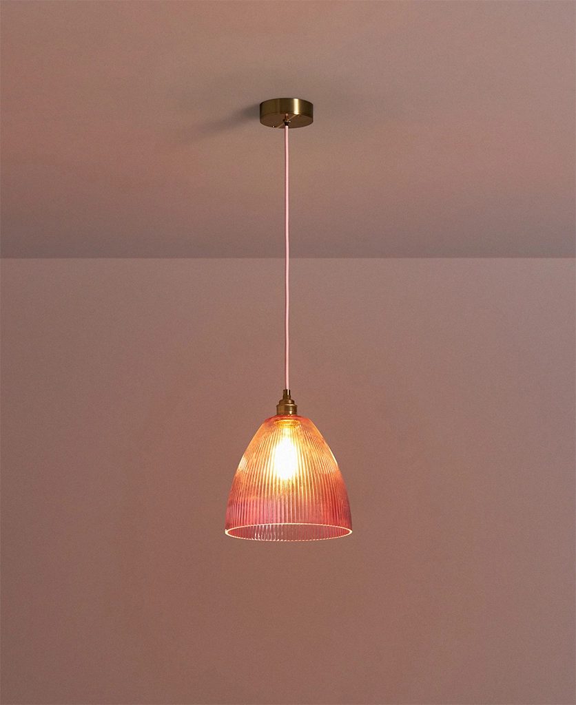 Why it works The fluted glass diffuses brightness while the deeper Evelyn shape directs light downward, balancing atmosphere with function. The pink tone can be echoed elsewhere in the room for a consistent visual language.