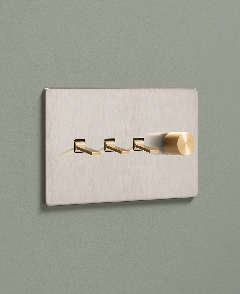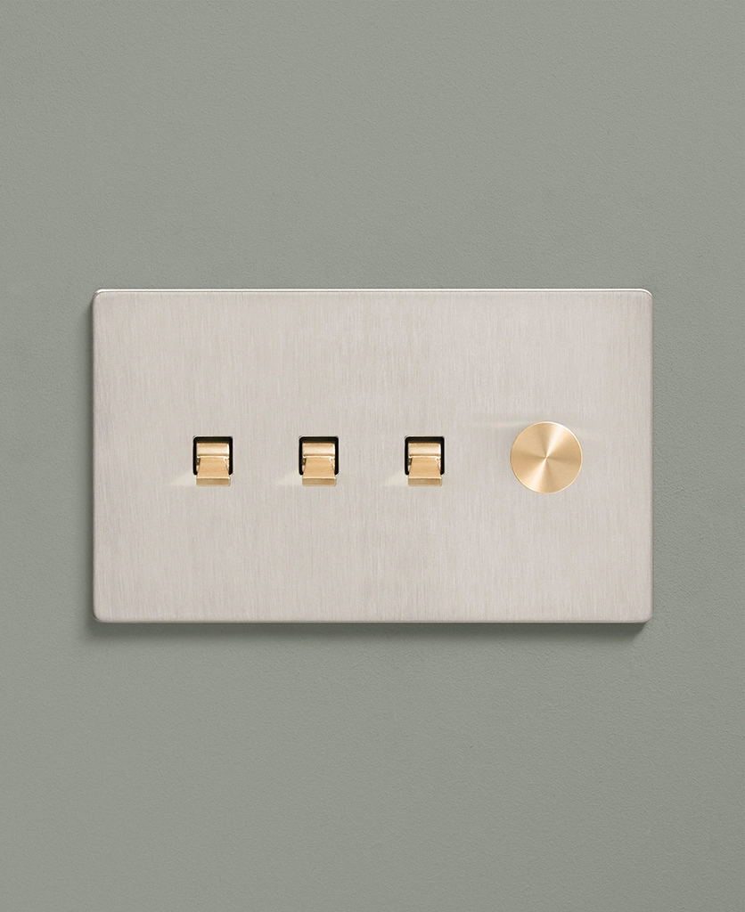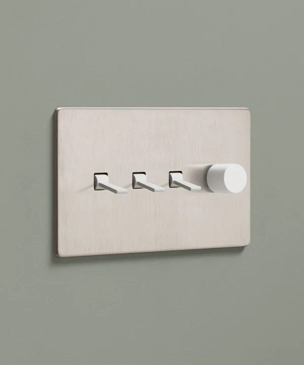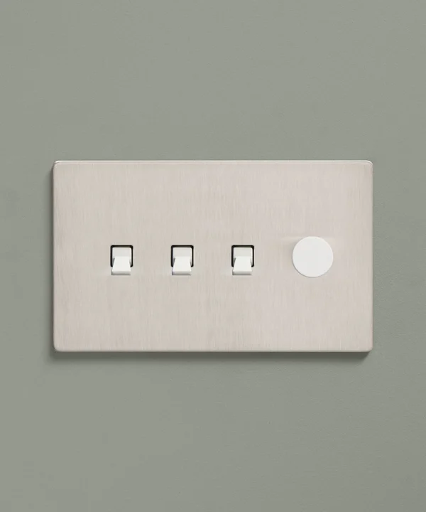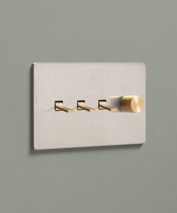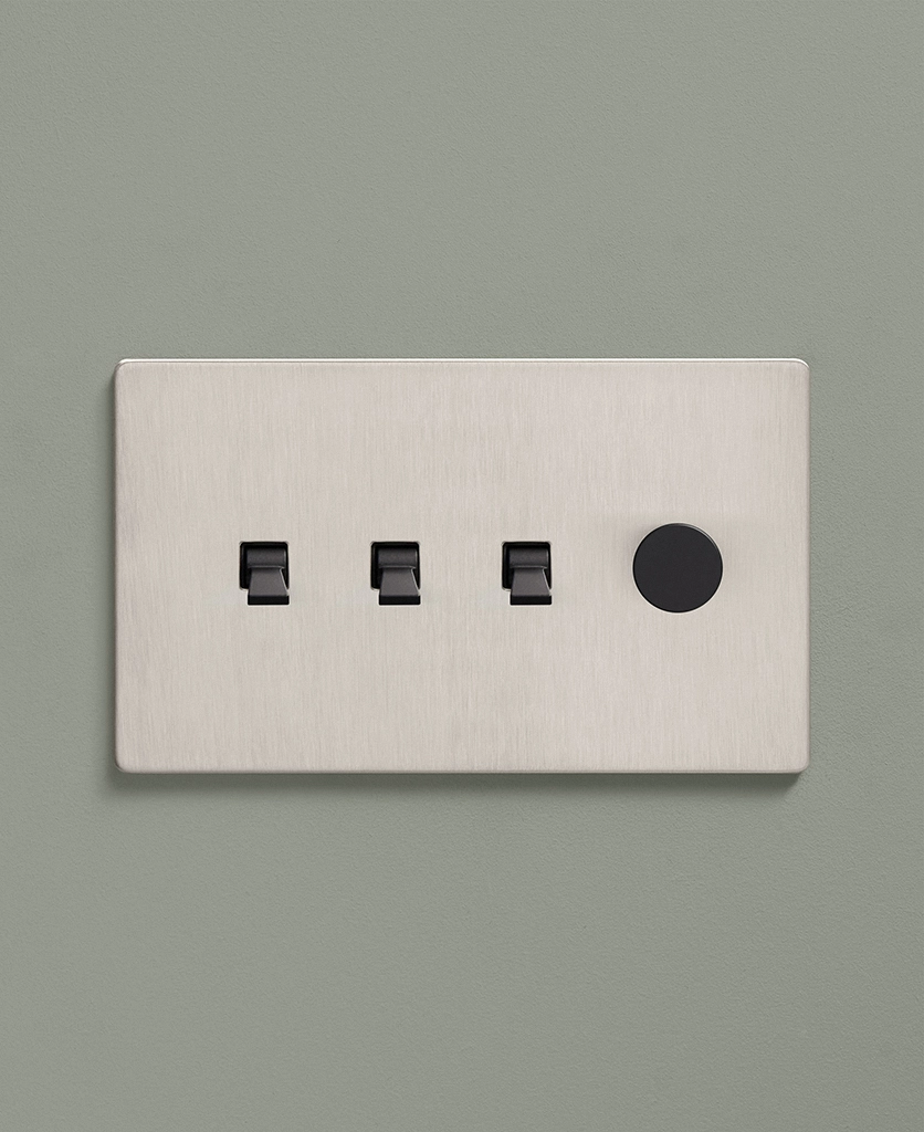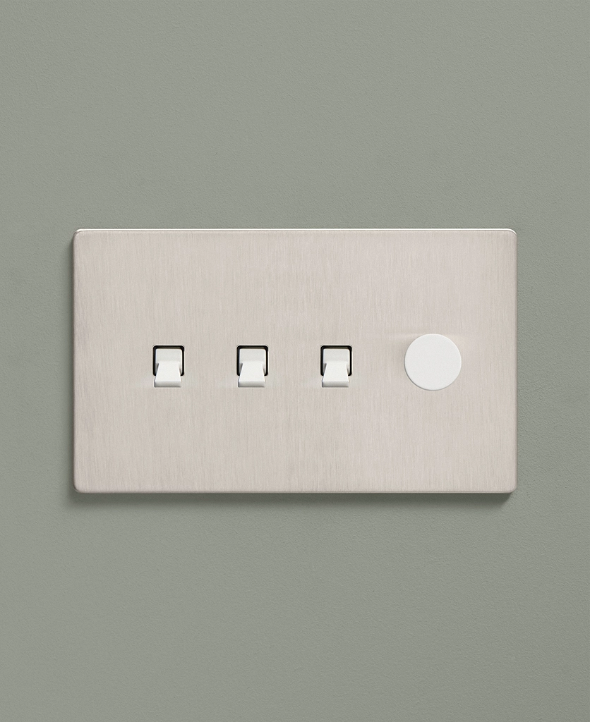 Padding over to the brushed silver light switch on your wood-slatted walls, you feel the toggle between your finger and thumb and flick it upwards, plunging your bedroom into darkness. Twisting the dimmer dial, you watch your bedside lights gently illuminate, casting a warm glow over your space. Controlling all your lights from one switch plate keeps your décor flowing seamlessly without multiple functional fixtures disrupting the peace.