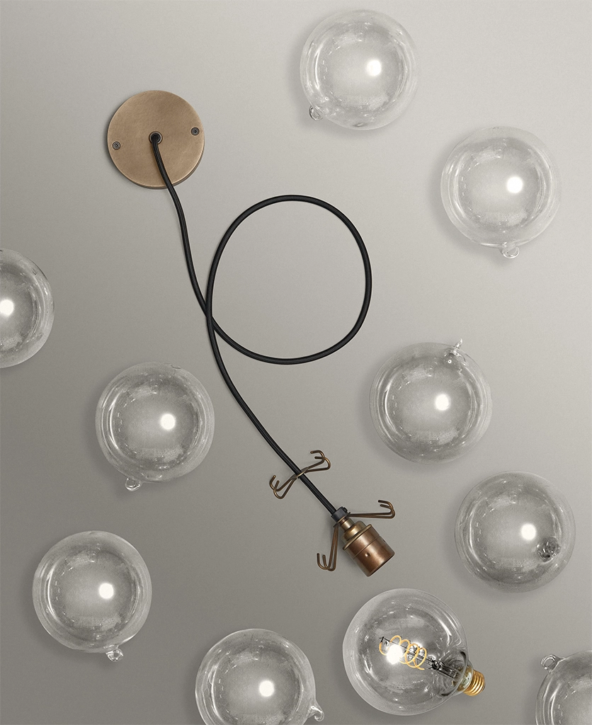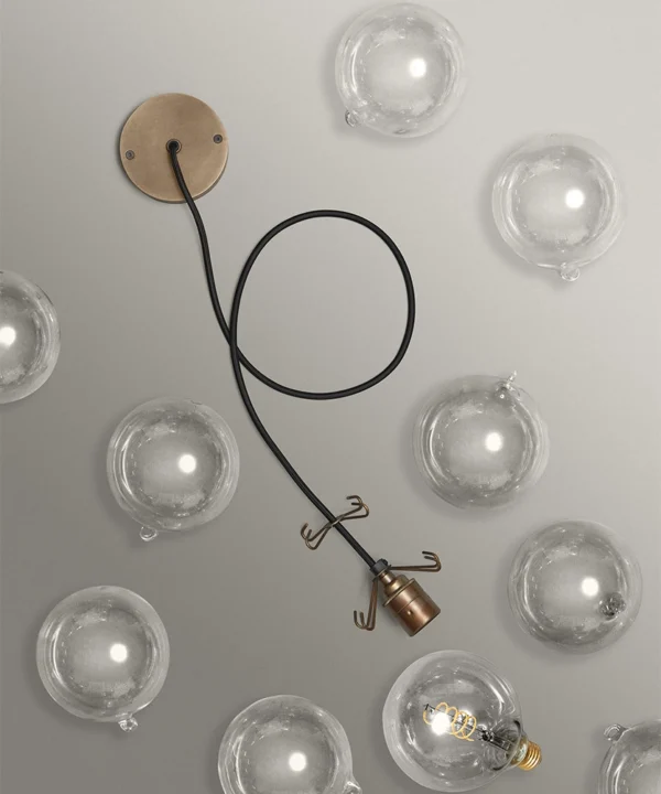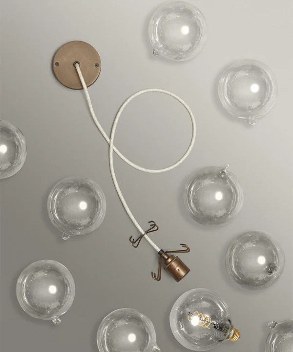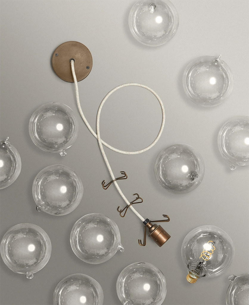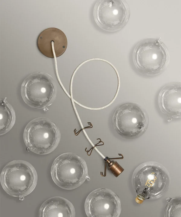 - 8 or 12 clear glass baubles; 1 XL Globe Spiral Filament LED bulbs, 1m of Oh So Black fabric cable or Course Linen cable, 1 antique brass ceiling rose, 1 antique brass bulb holder, 2 antique brass 4-point hooks (8 baubles) or 3 antique brass 4-point hooks (12 baubles); instructions; connectors and ceiling bracket.