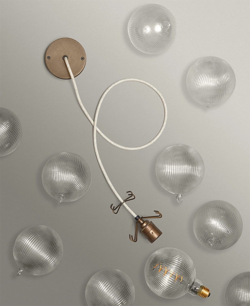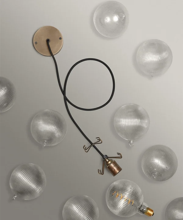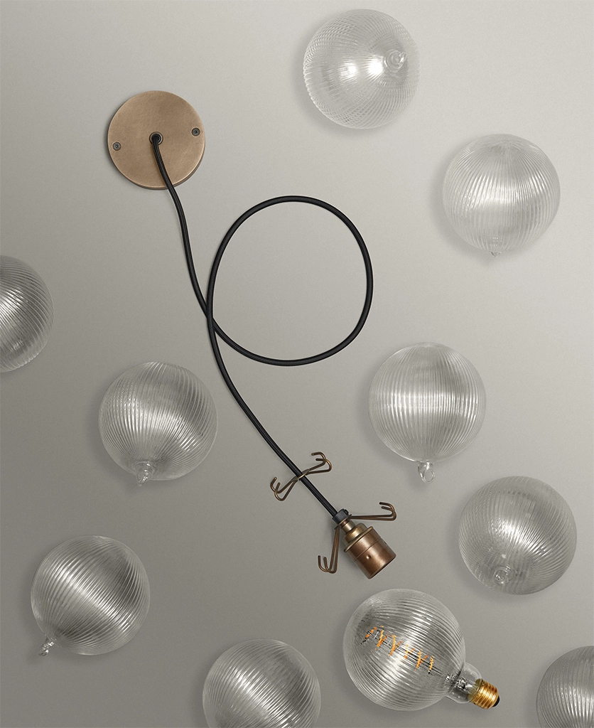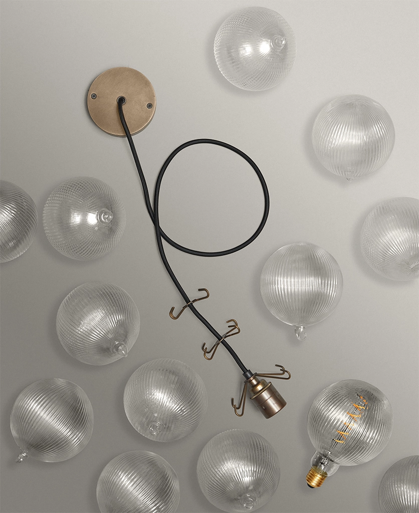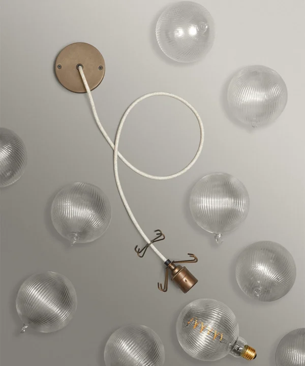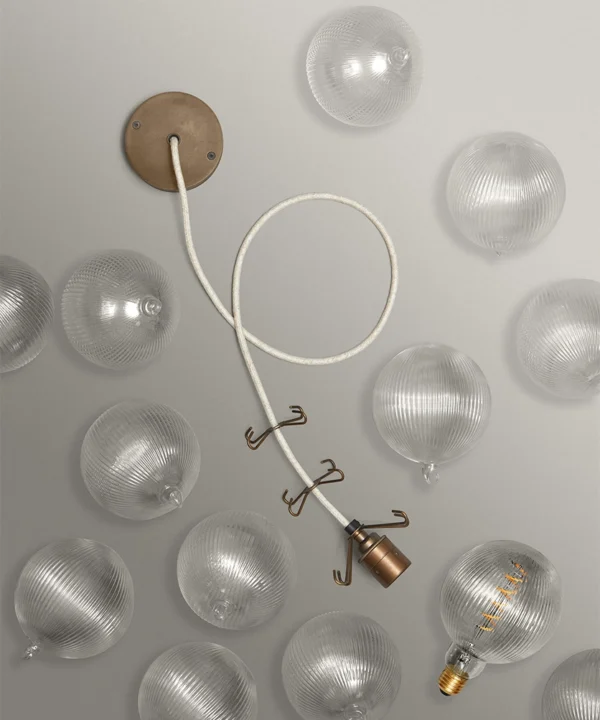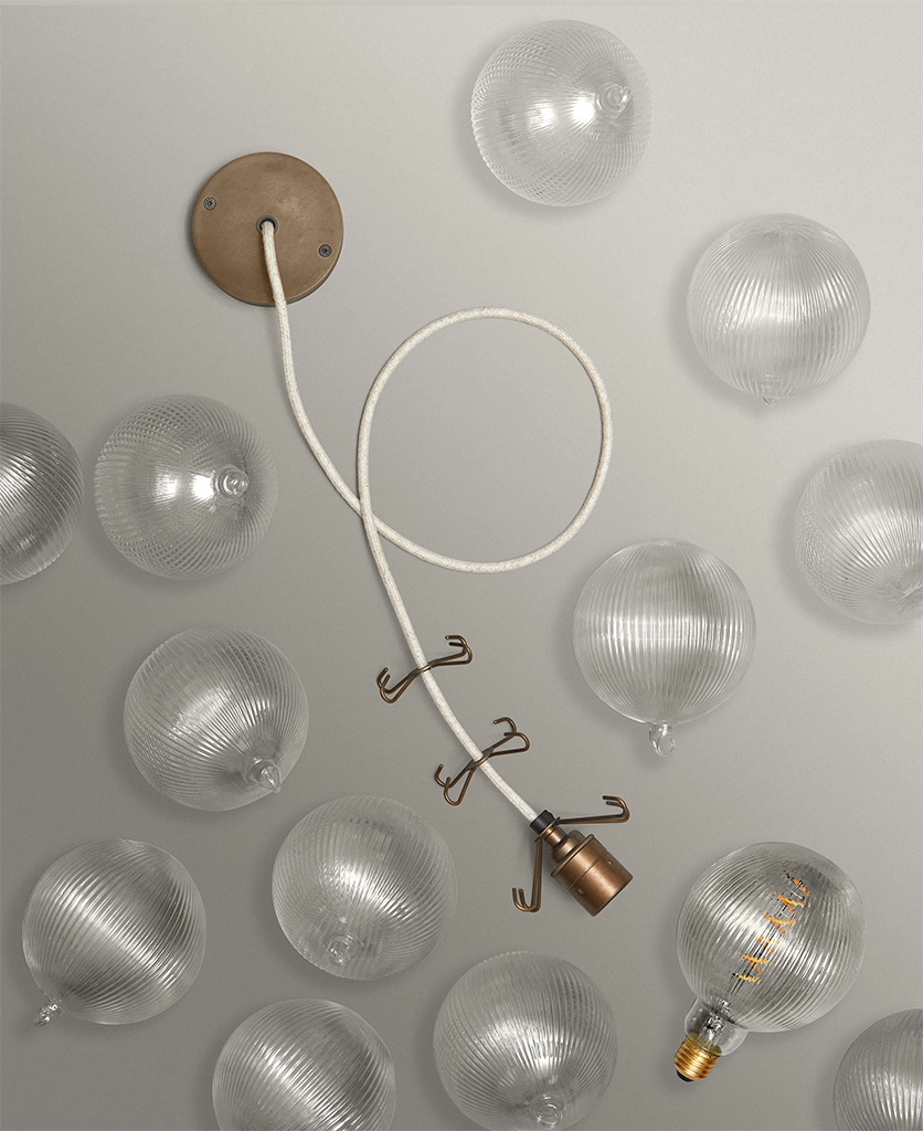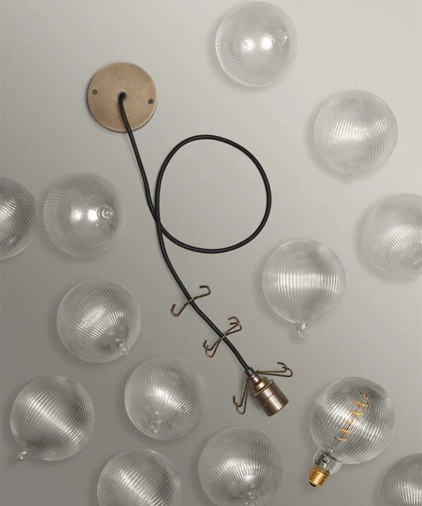 - 8 or 12 clear fluted glass baubles; 1 XL Fluted Globe Spiral Filament LED bulbs, 1m of Oh So Black fabric cable or Course Linen cable, 1 antique brass ceiling rose, 1 antique brass bulb holder, 2 antique brass 4-point hooks (8 baubles) or 3 antique brass 4-point hooks (12 baubles); instructions; connectors and ceiling bracket.