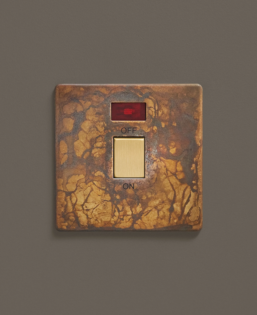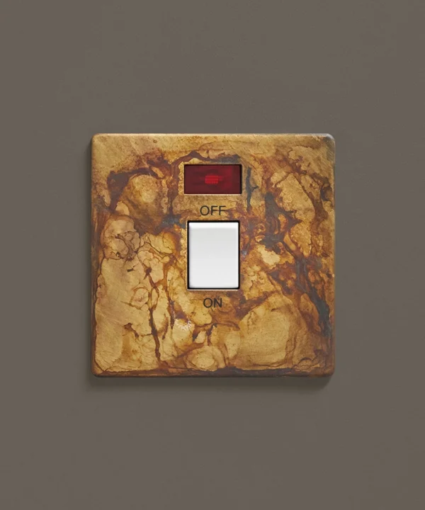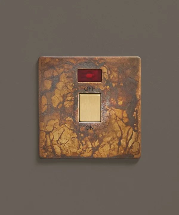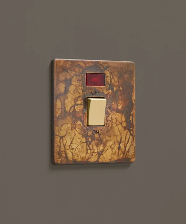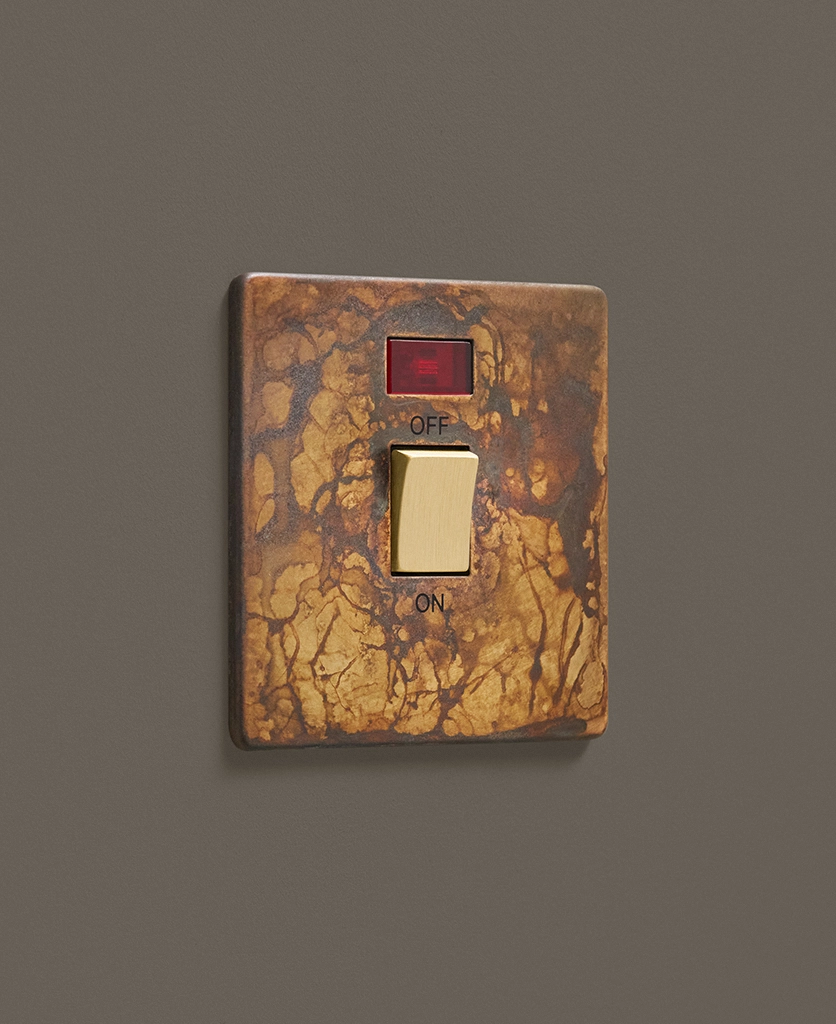 This single switch has double pole protection and a neon indicator. The concealed fixings allow the gorgeous elemental gold finish of the plate to really be the star of the show.