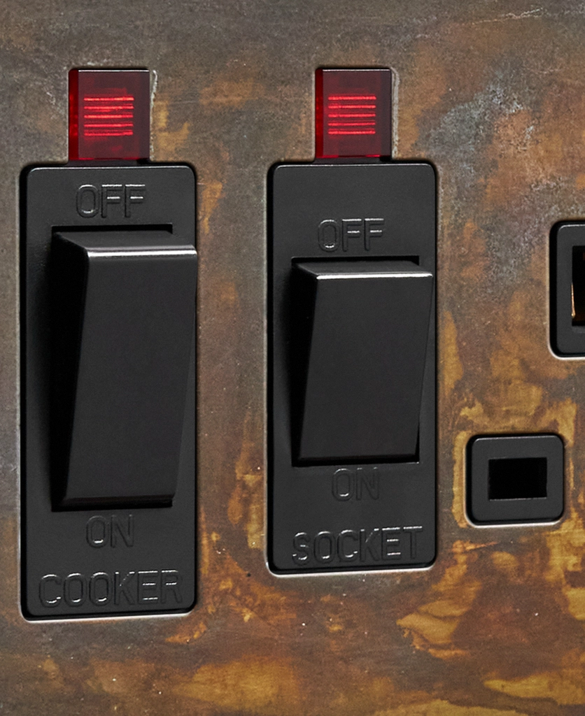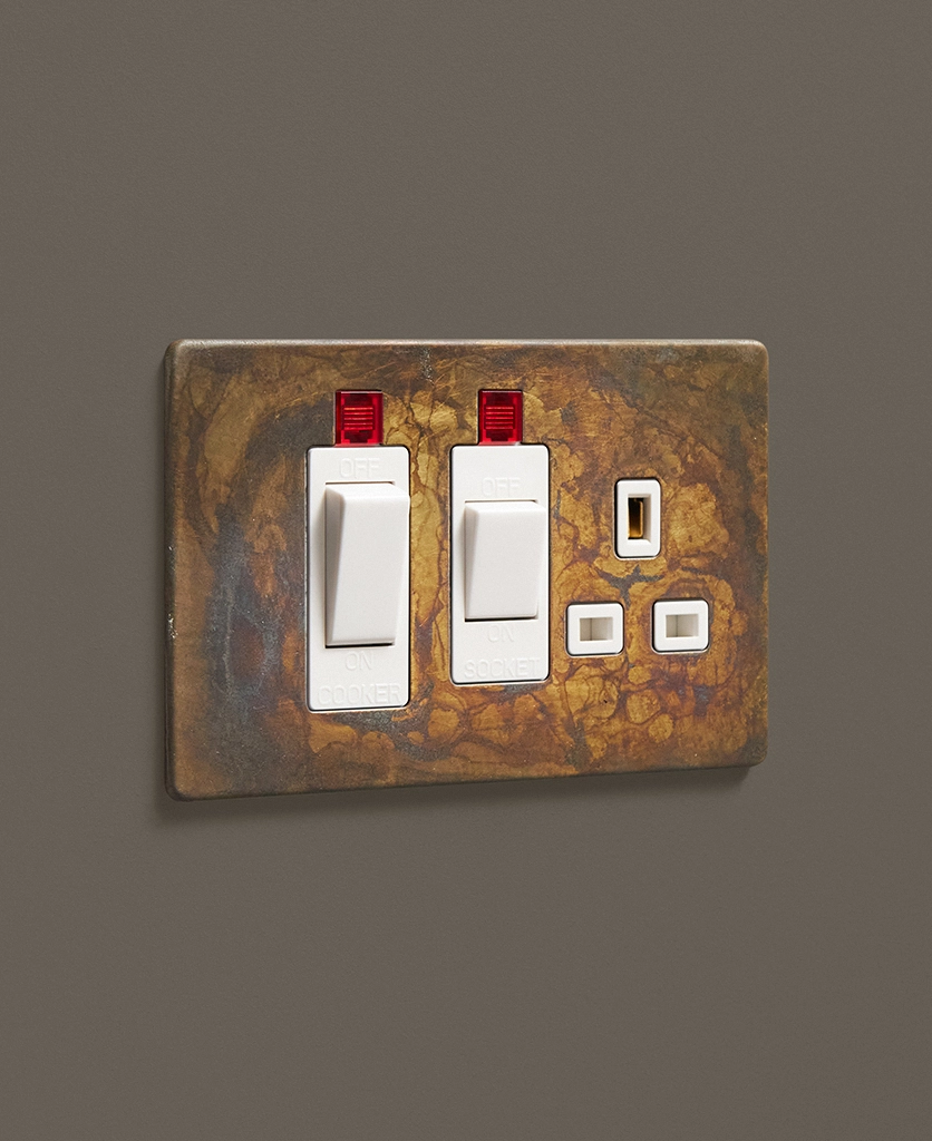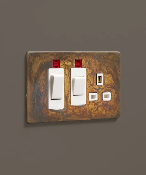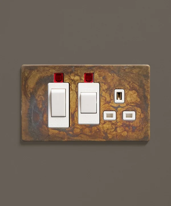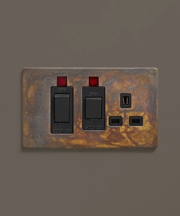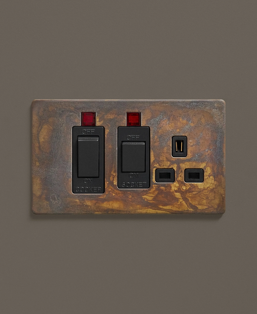 If you’re looking to add a decadent edge to your industrial interiors, then our elemental gold cooker switch & socket is a stunning choice. Featuring a gorgeously decadent matt brass plate with a decadent distressed finish, this switch has a real antique vibe. Almost like something you’d find at an antique market. For maximum impact show this stunning switch off against matt white walls to add a heritage edge to your industrial spaces.