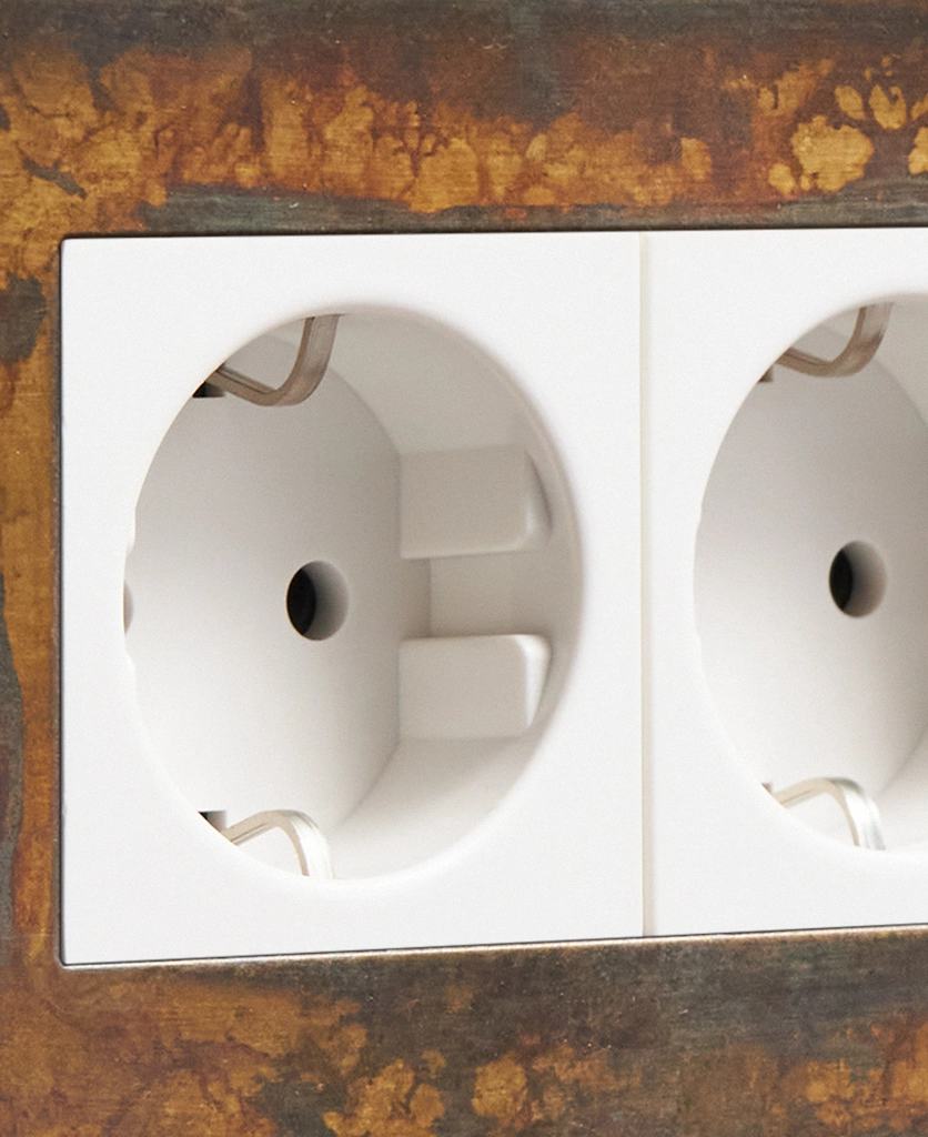 We LOVE this elemental gold schuko socket. It’s industrial with a decadent twist, which makes it the perfect choice for heritage-inspired interiors. Featuring a gorgeously matt brass plate with swirling hues of teal, cappuccino and grey, this socket looks amazing against matt white walls where the individual patterns can really stand out.