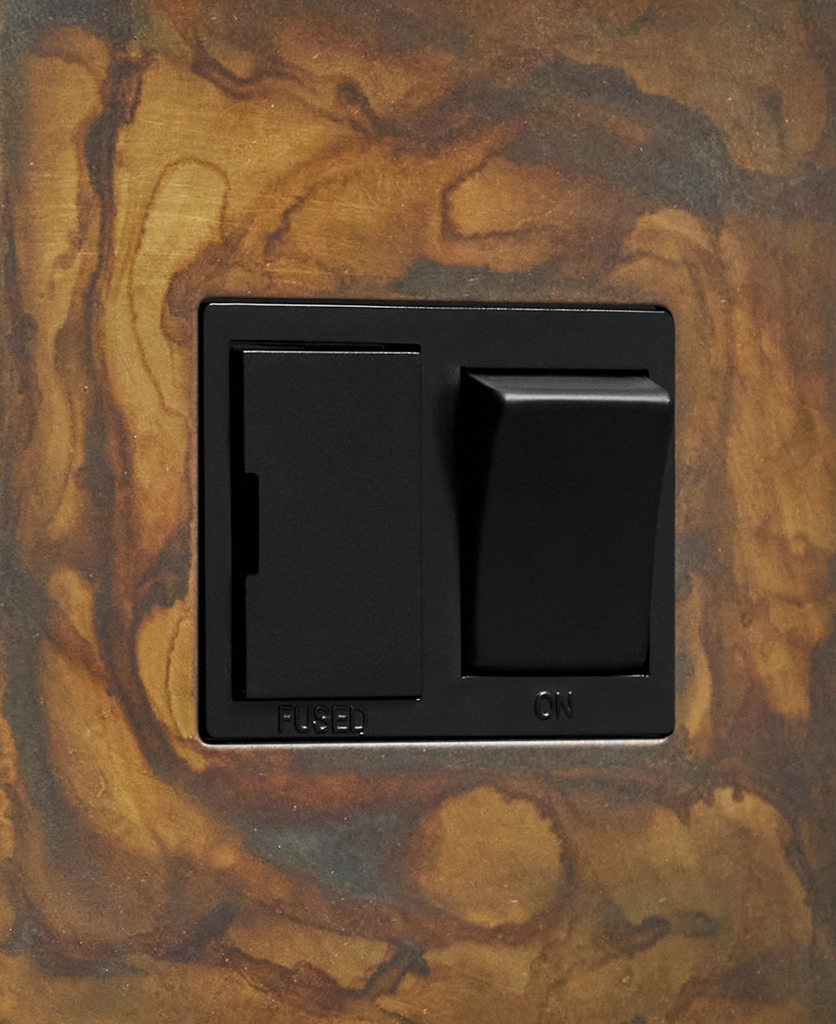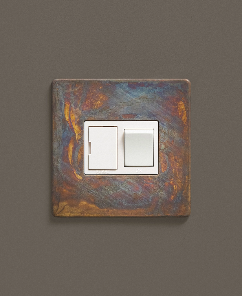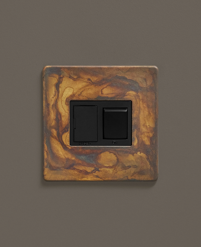 Our industrial style elemental gold fused spur switch is the perfect way to refresh morose looking electrical points in your home that can spoil your carefully crafted designs. Elemental gold is a beautifully tarnished effect that looks amazing in either a vintage or industrially styled interior. The striking smoked patterns that sweep across the brass plate make the sockets completely unique, you won't find any two the same.