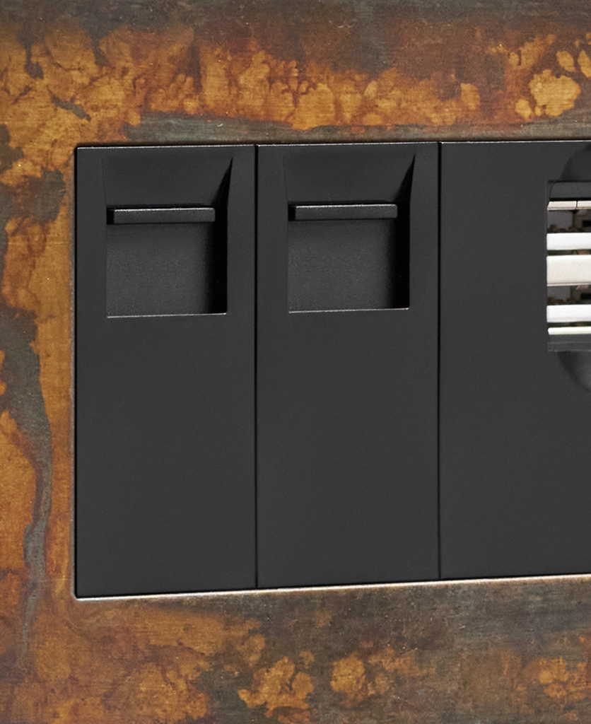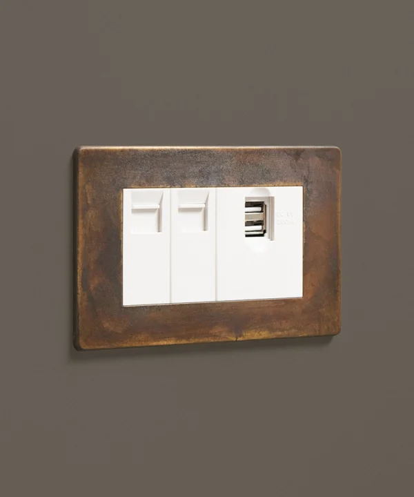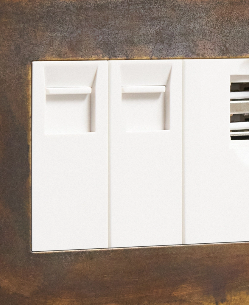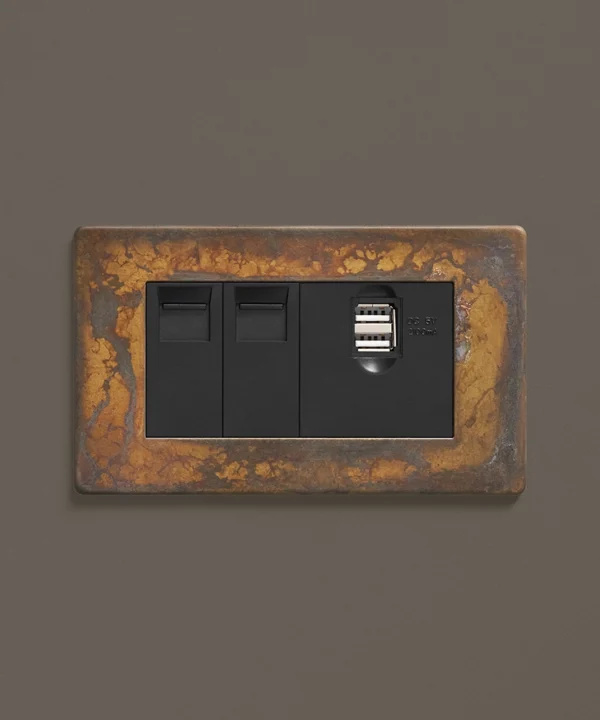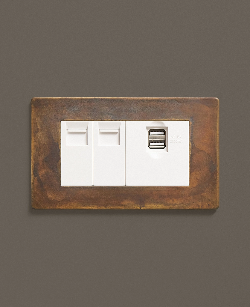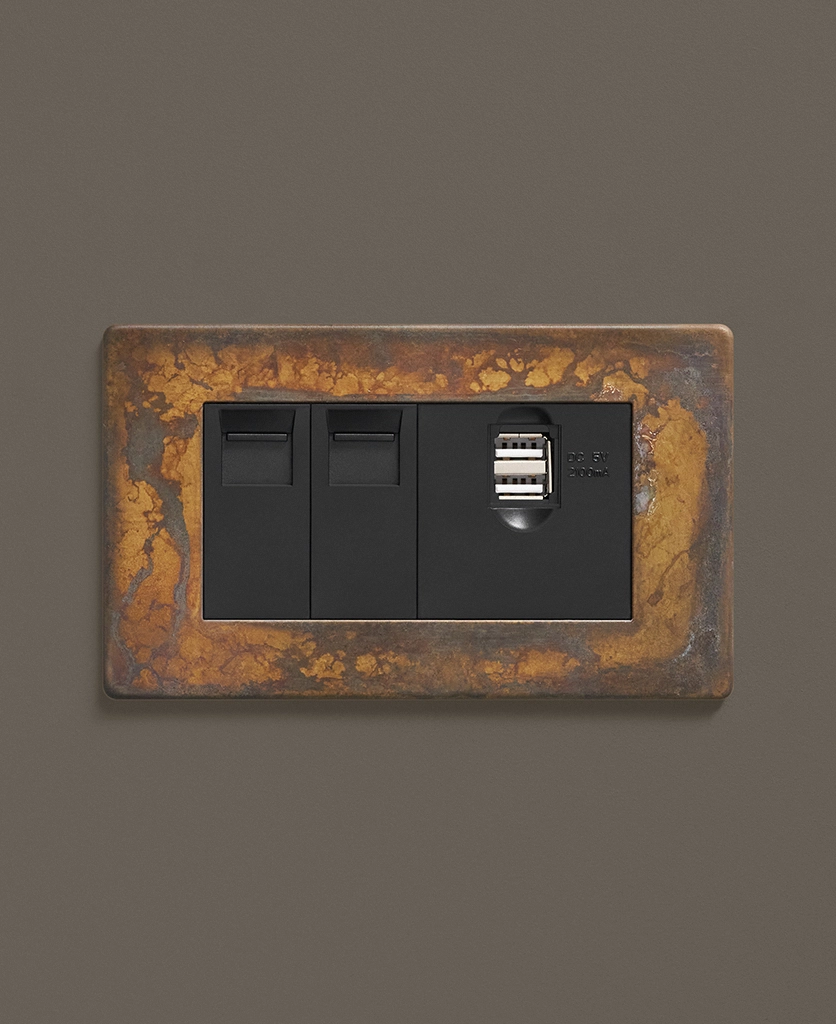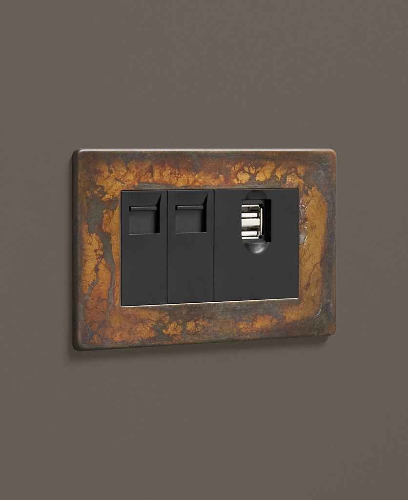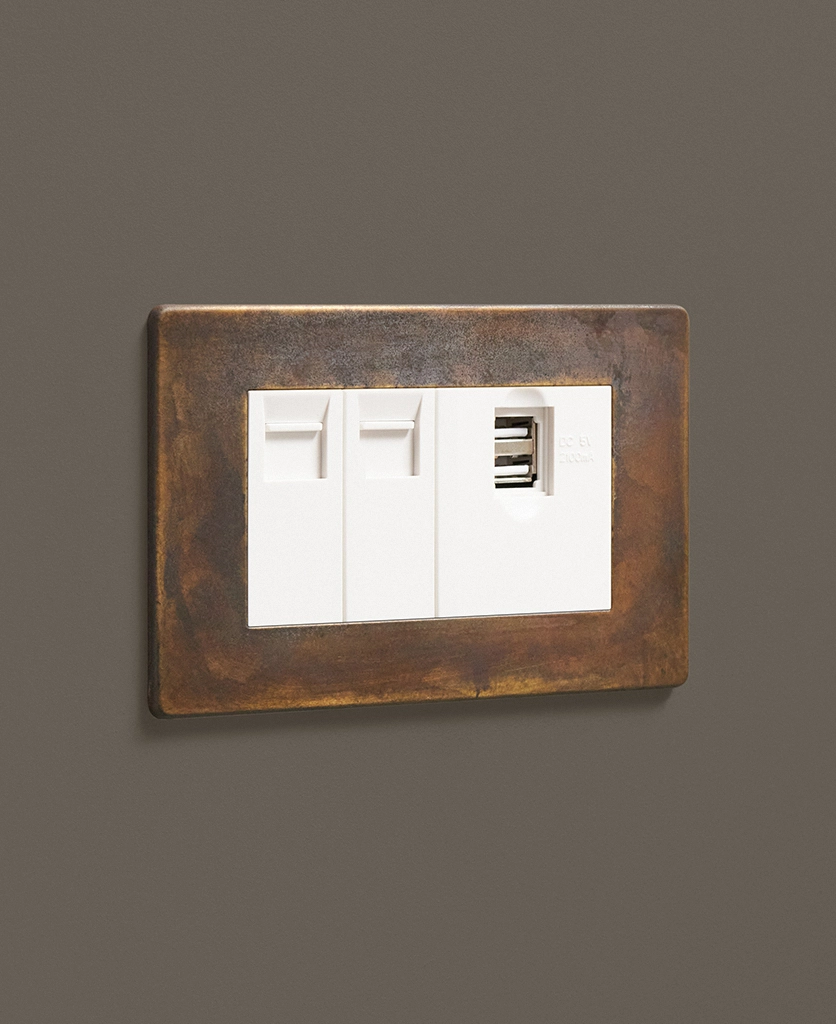 Our elemental gold triple data port is just the ticket if you're looking for something a little bit quirky to finish off your office space. Featuring a beautifully scorched matt brass plate with swirls of coffee and charcoal drifting across the surface, this switch is a stunning hybrid between industrial and glam style. Choose from black or white usb port, ethernet and telephone sockets.