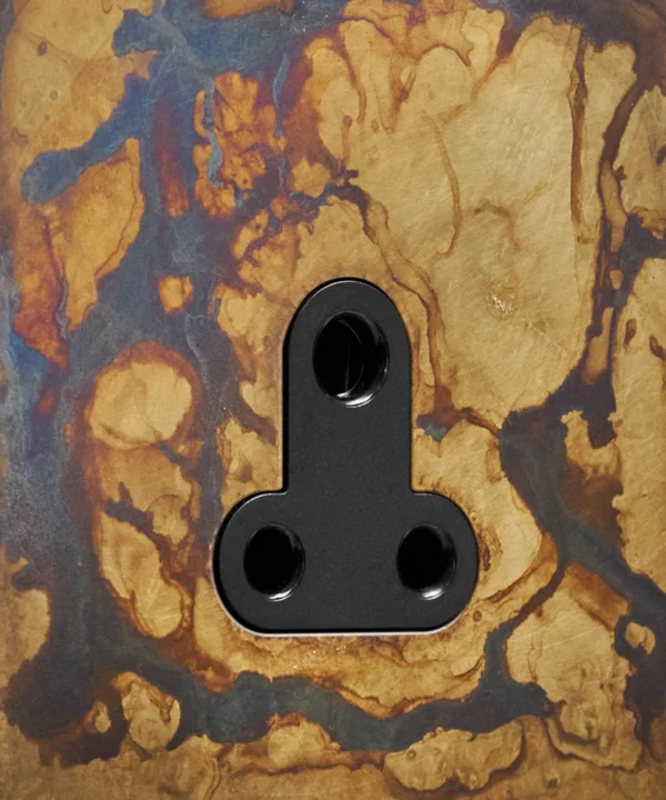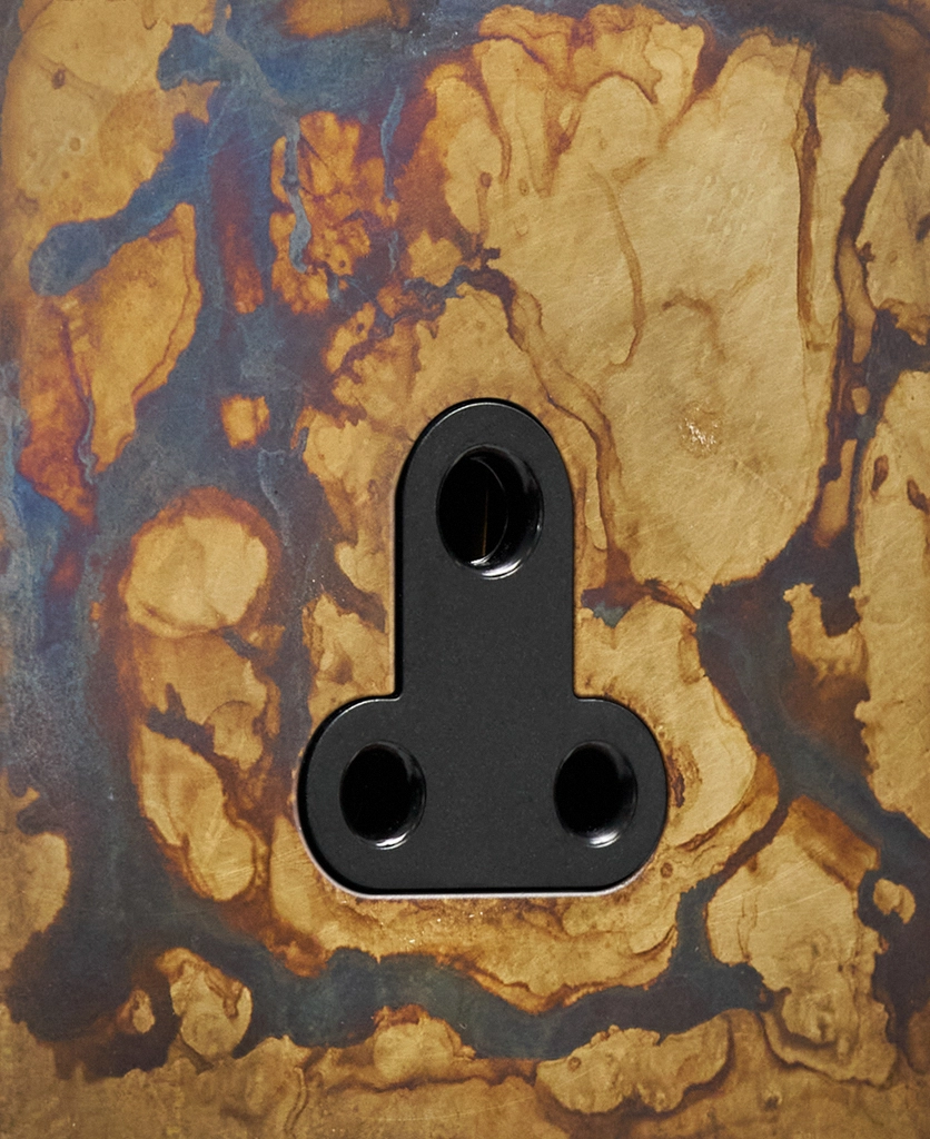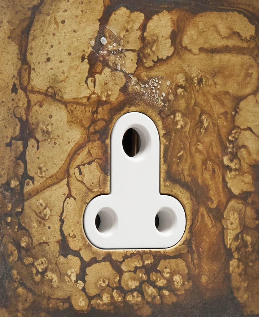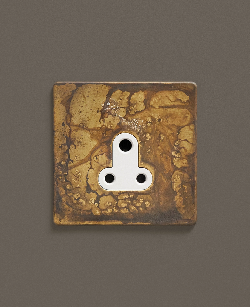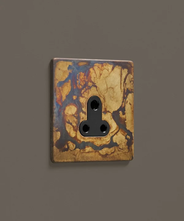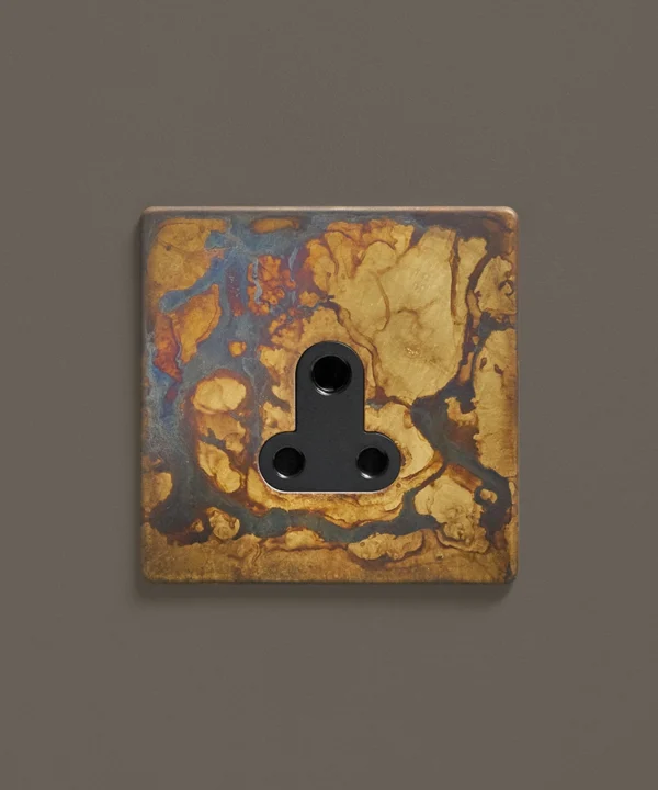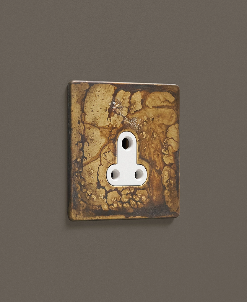 This lavish elemental gold round 3 pin socket is just beautiful. Featuring a gorgeous matt brass plate with swirling hues of charcoal, grey and coffee and a contrasting black or white insert, this dramatic switch looks amazing in an industrially styled interior. For an ultra-chic designer finish, place upon monochromatic walls, we particularly love navy, grey or white, where the distressed finish can really stand out.