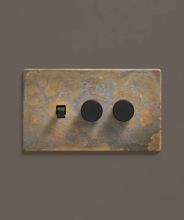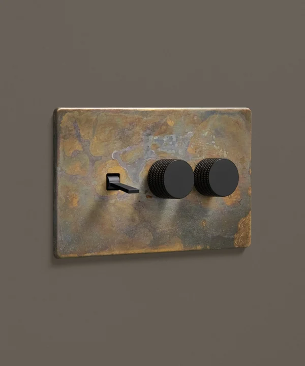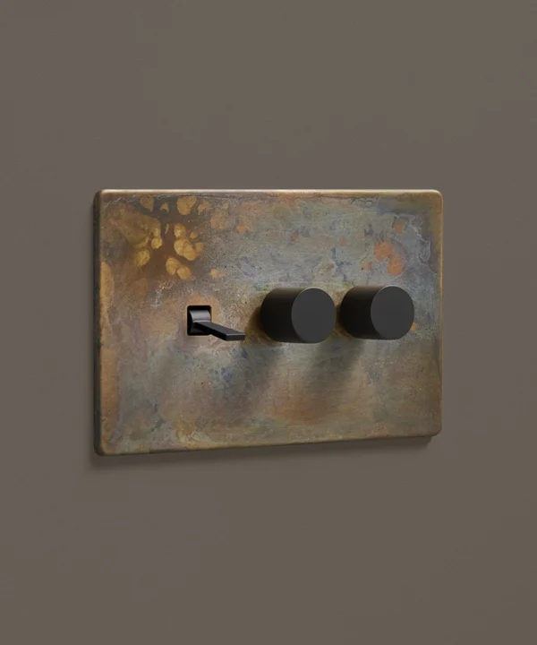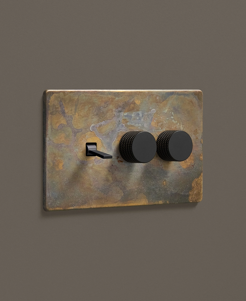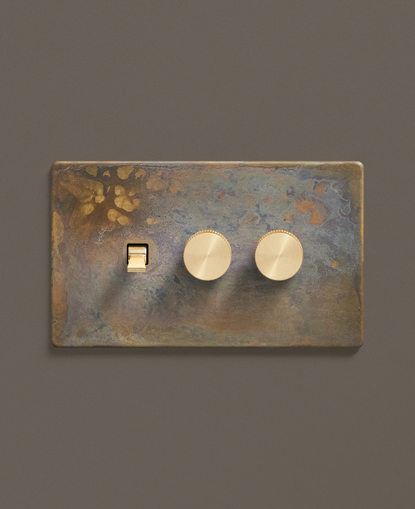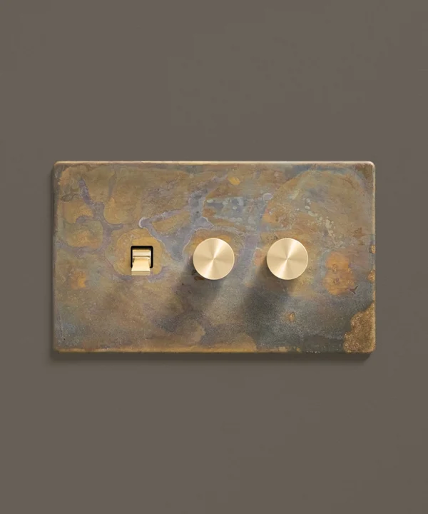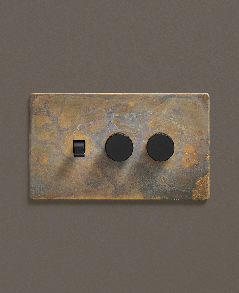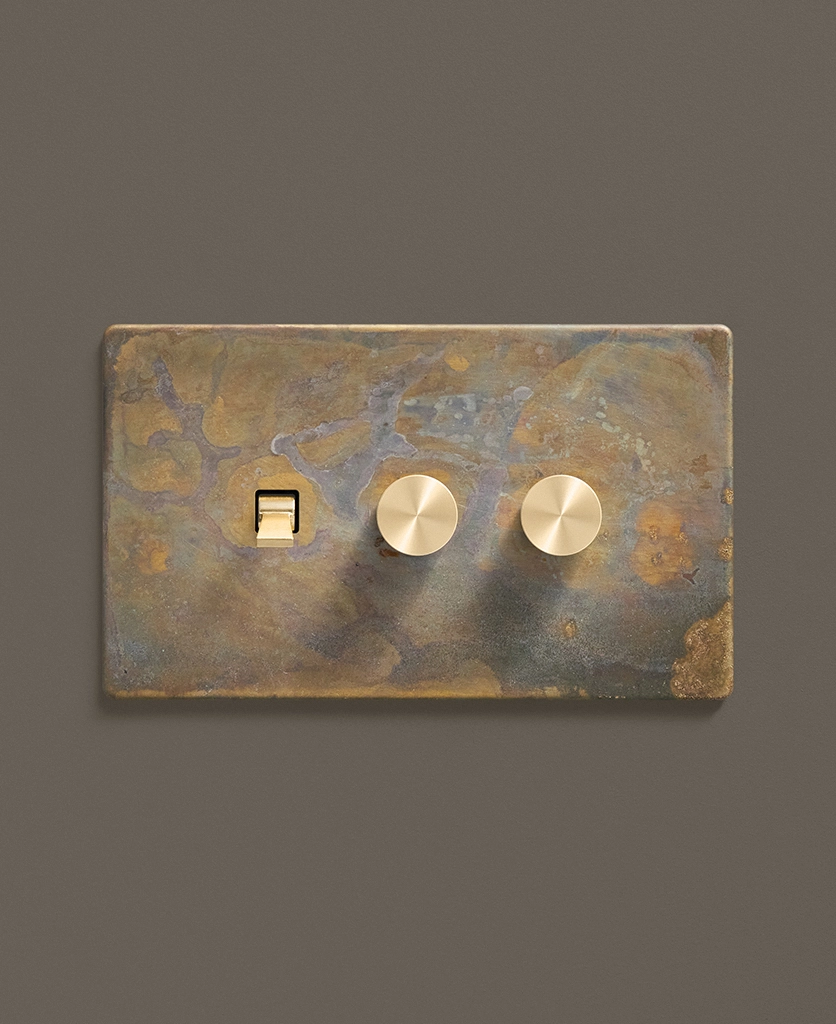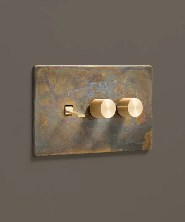 - This finish is made to change and age with wear, making each switch unique, differing from batch to batch. We strongly advise ordering items for the same room together to ensure consistency. If fitted to freshly plastered walls, there is a chance the dampness will encourage the brass finish of this switch to corrode.