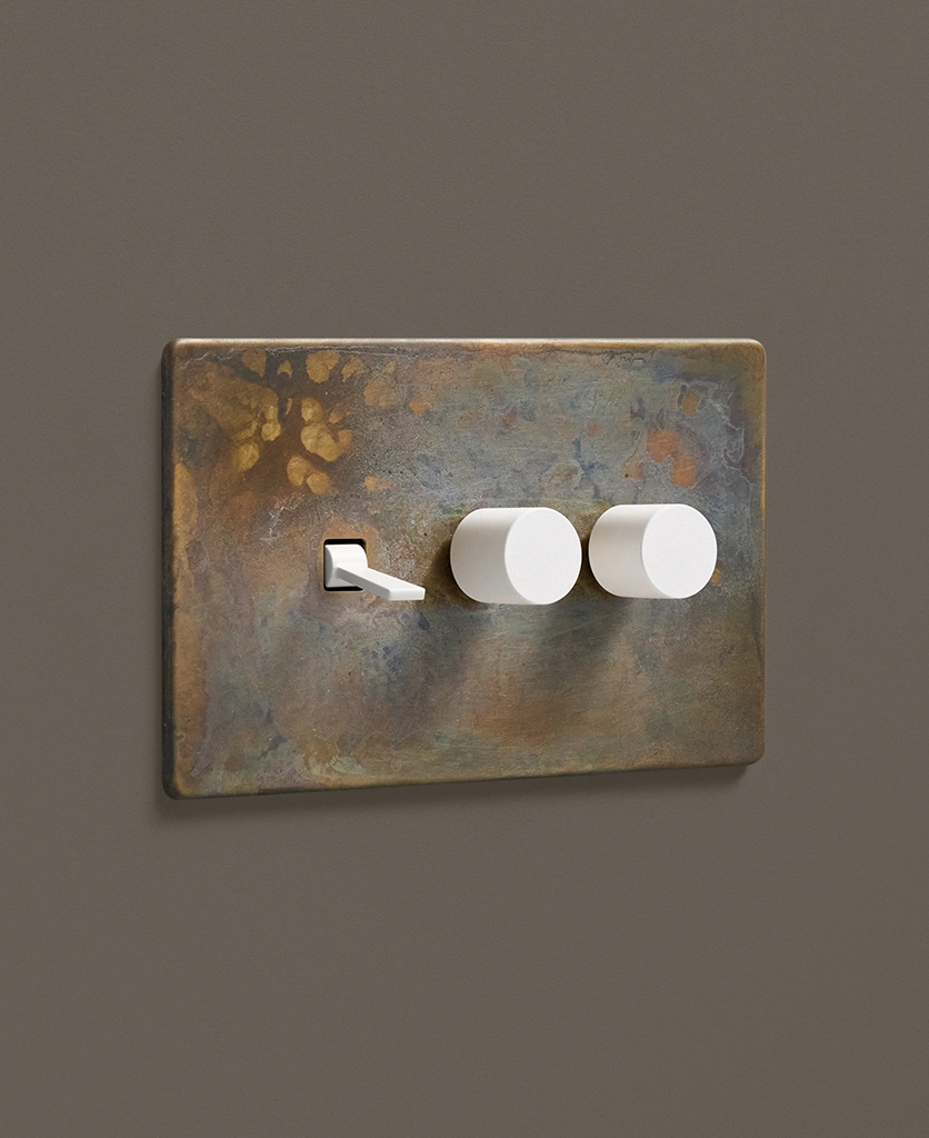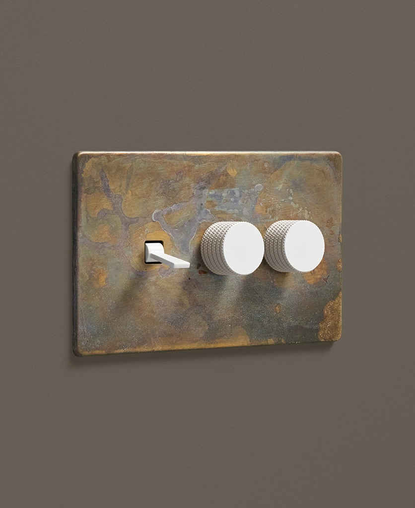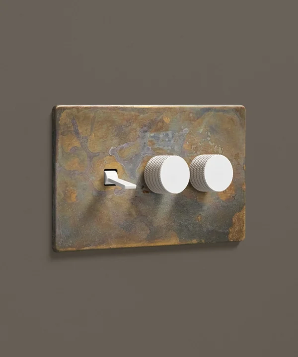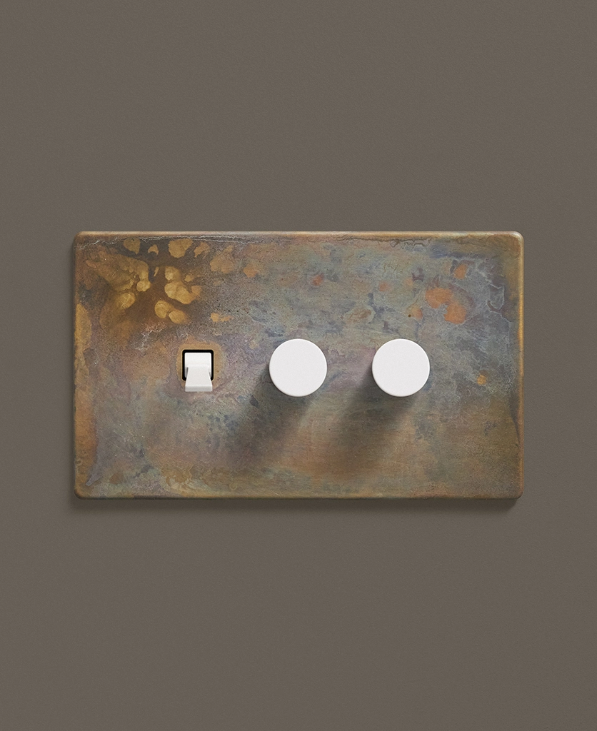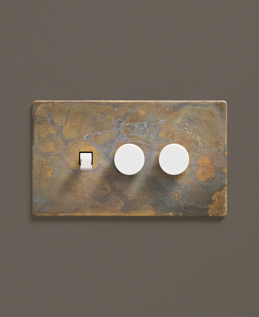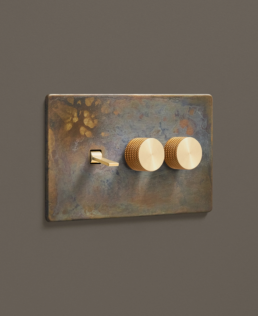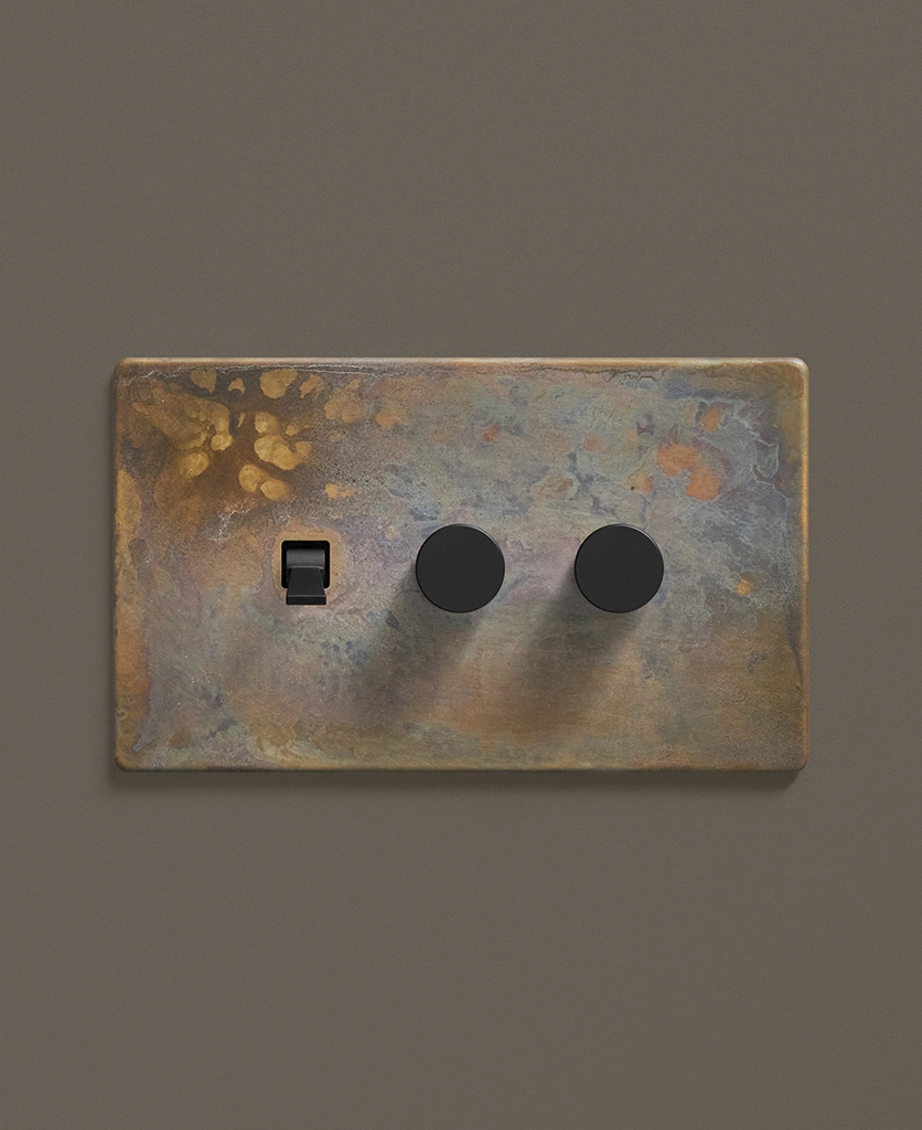 - This finish is made to change and age with wear, making each switch unique, differing from batch to batch. We strongly advise ordering items for the same room together to ensure consistency. If fitted to freshly plastered walls, there is a chance the dampness will encourage the brass finish of this switch to corrode.