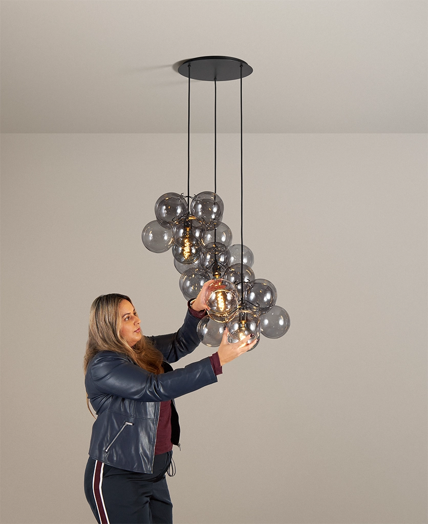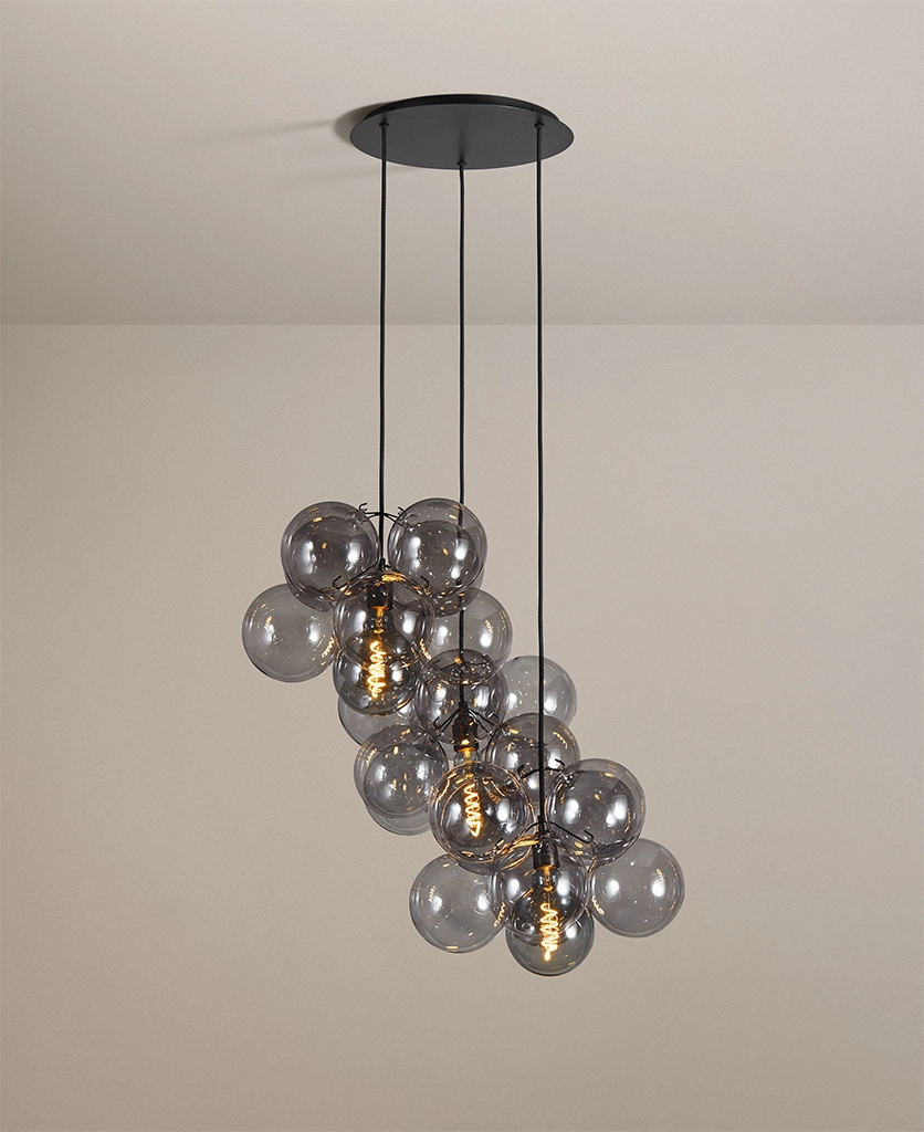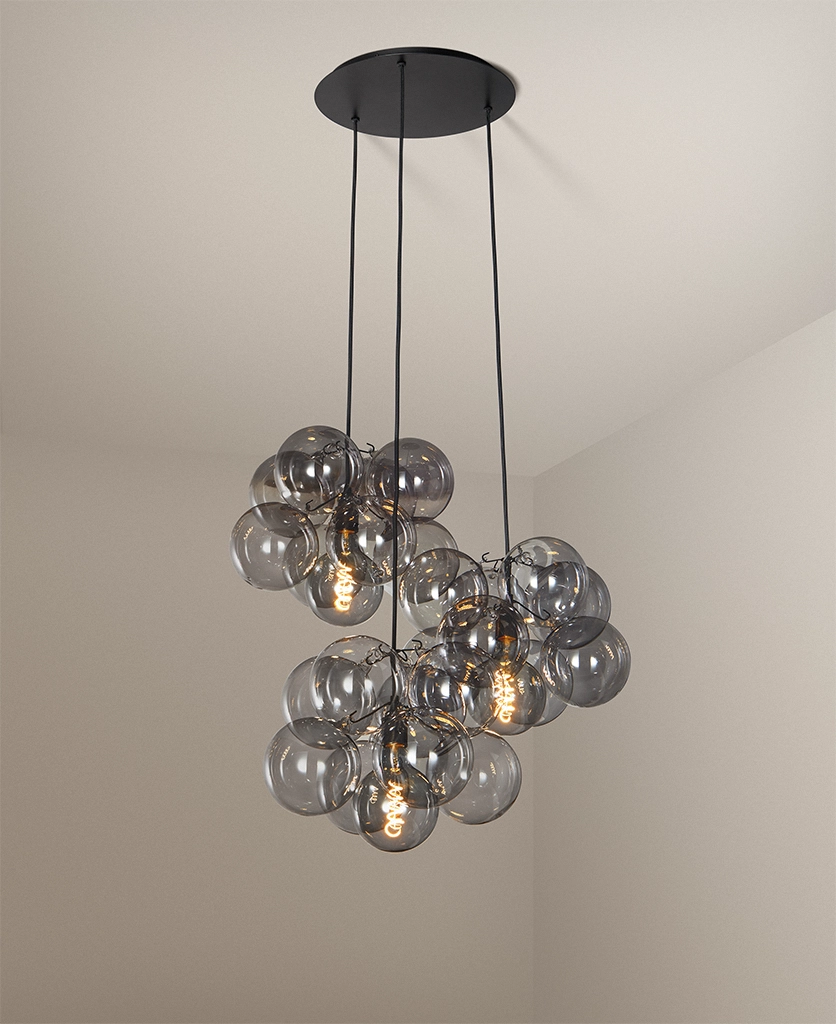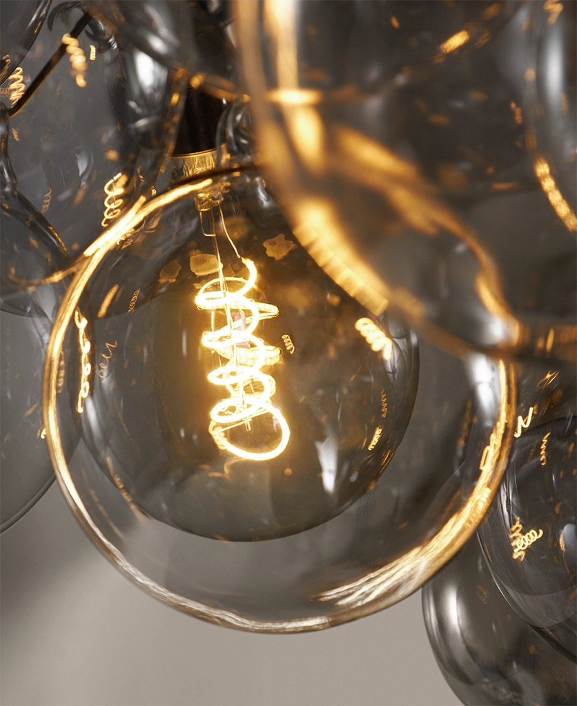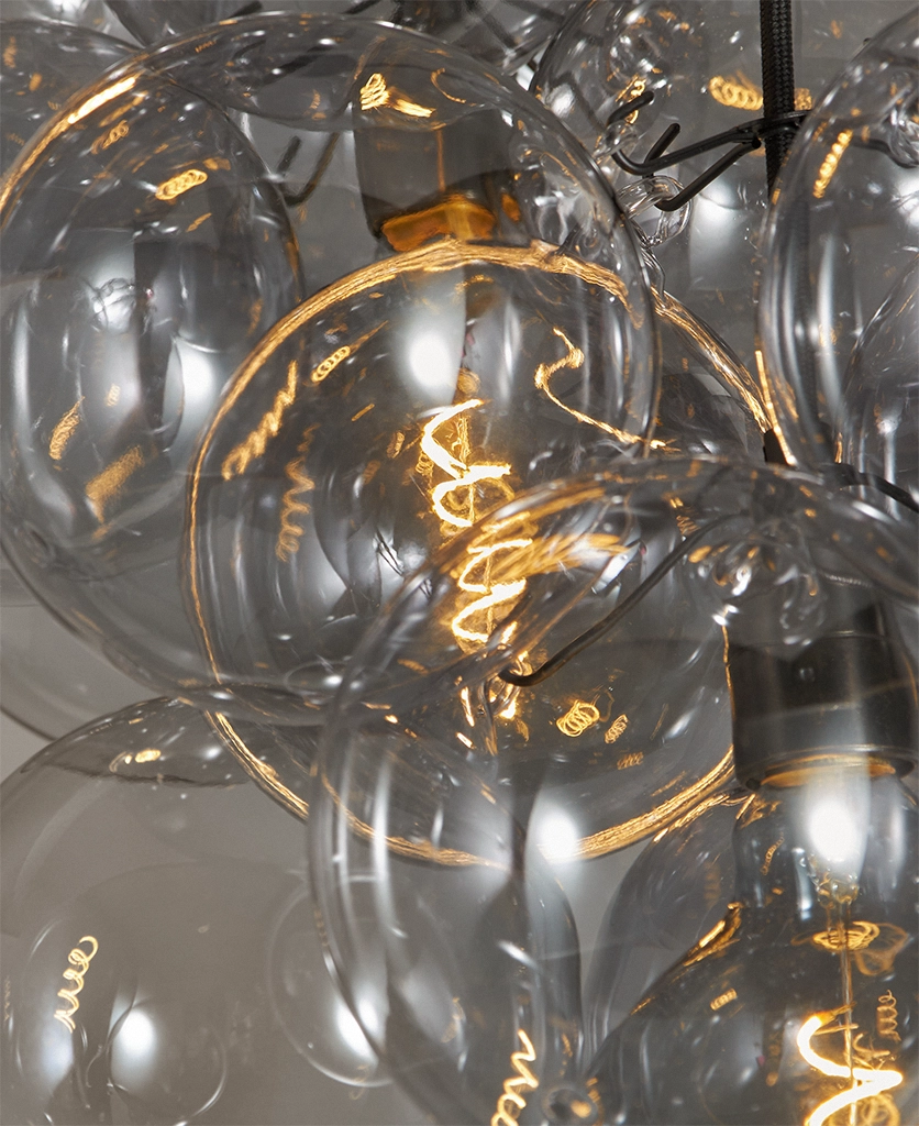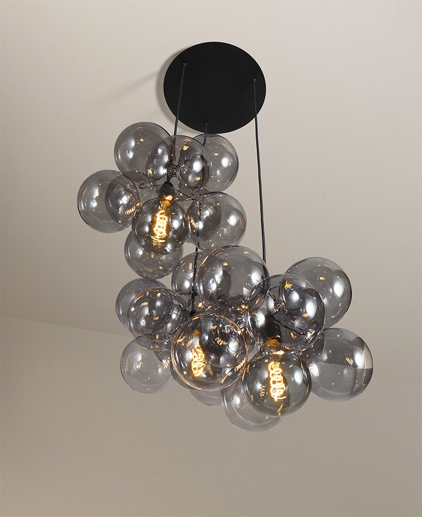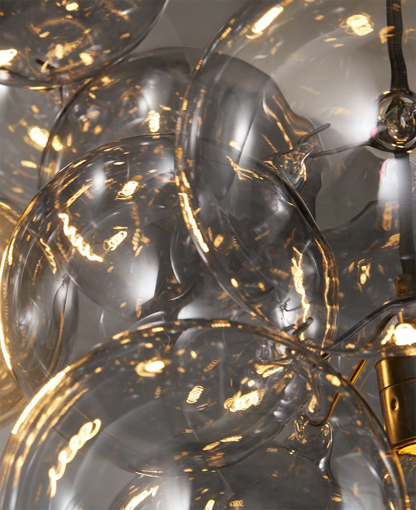 Standing beneath the Smokey Bubble Cascade Light, you watch the warm glow of the filaments shimmer through layers of tinted glass. The smokey spheres seem to float effortlessly, their translucent surfaces catching hints of light while holding onto the gentle depth of grey. It’s a beautifully balanced contrast — atmospheric, cocooning and quietly theatrical.