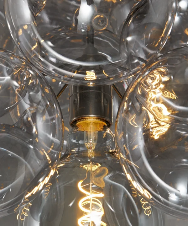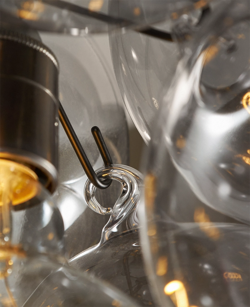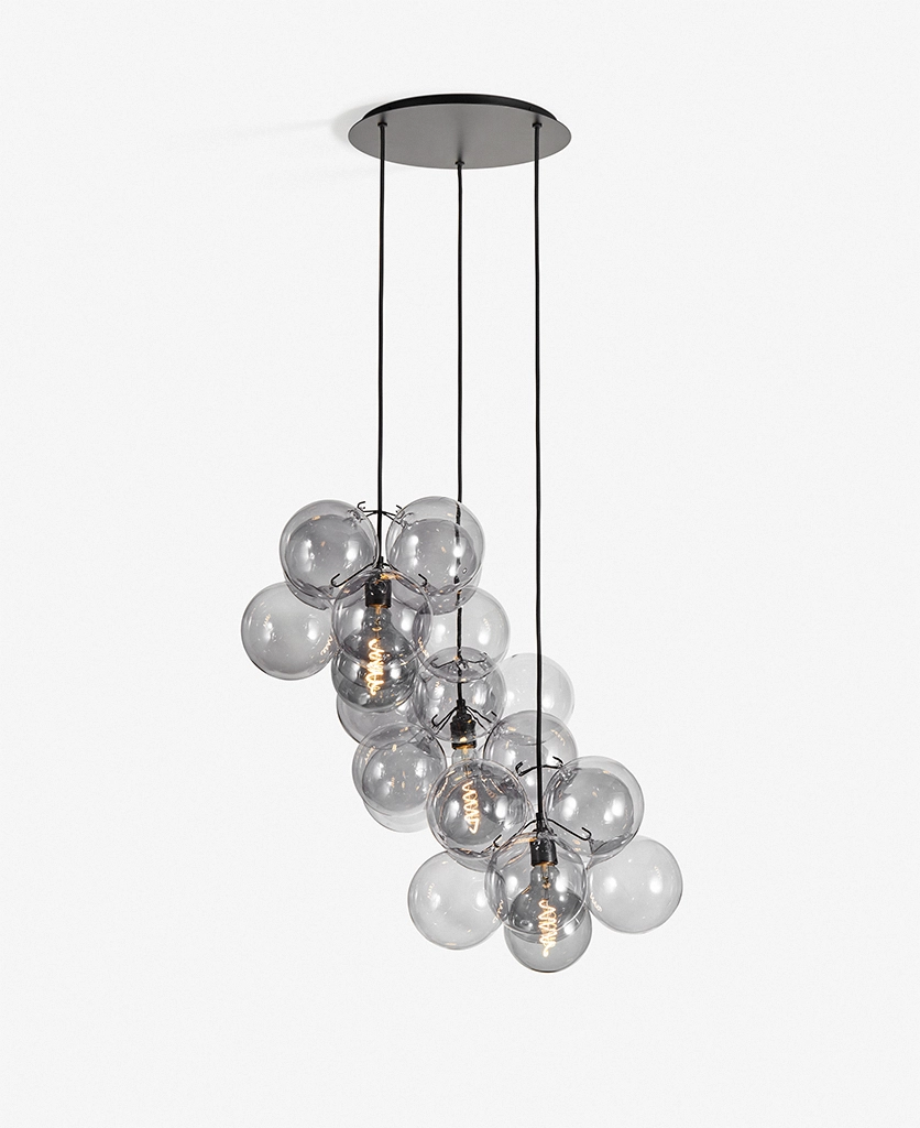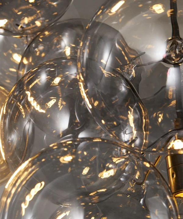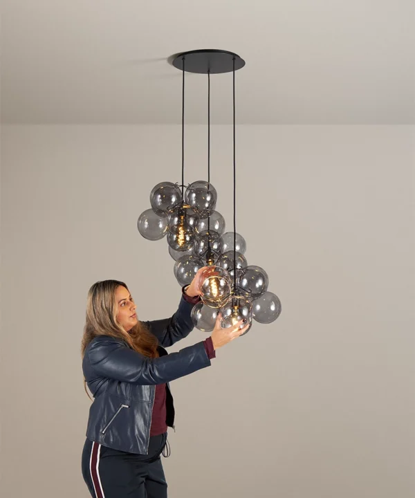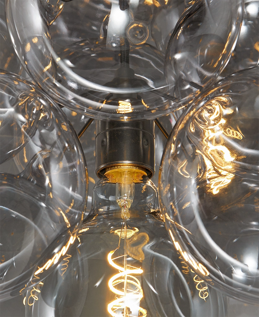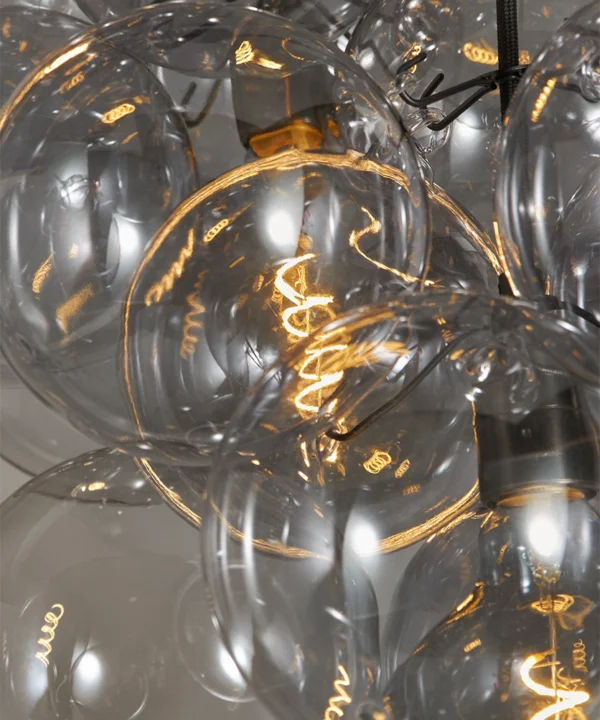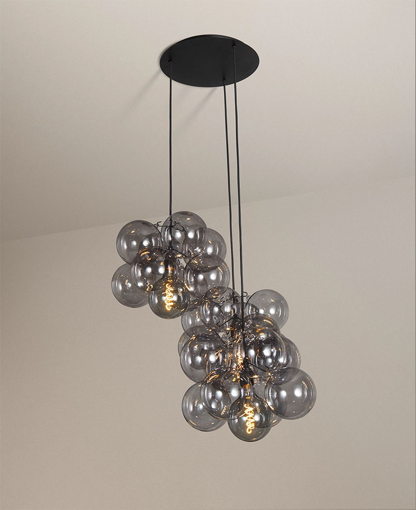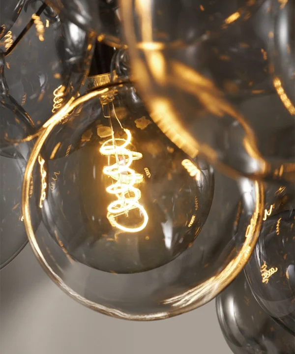 Standing beneath the Smokey Bubble Cascade Light, you watch the warm glow of the filaments shimmer through layers of tinted glass. The smokey spheres seem to float effortlessly, their translucent surfaces catching hints of light while holding onto the gentle depth of grey. It’s a beautifully balanced contrast — atmospheric, cocooning and quietly theatrical.