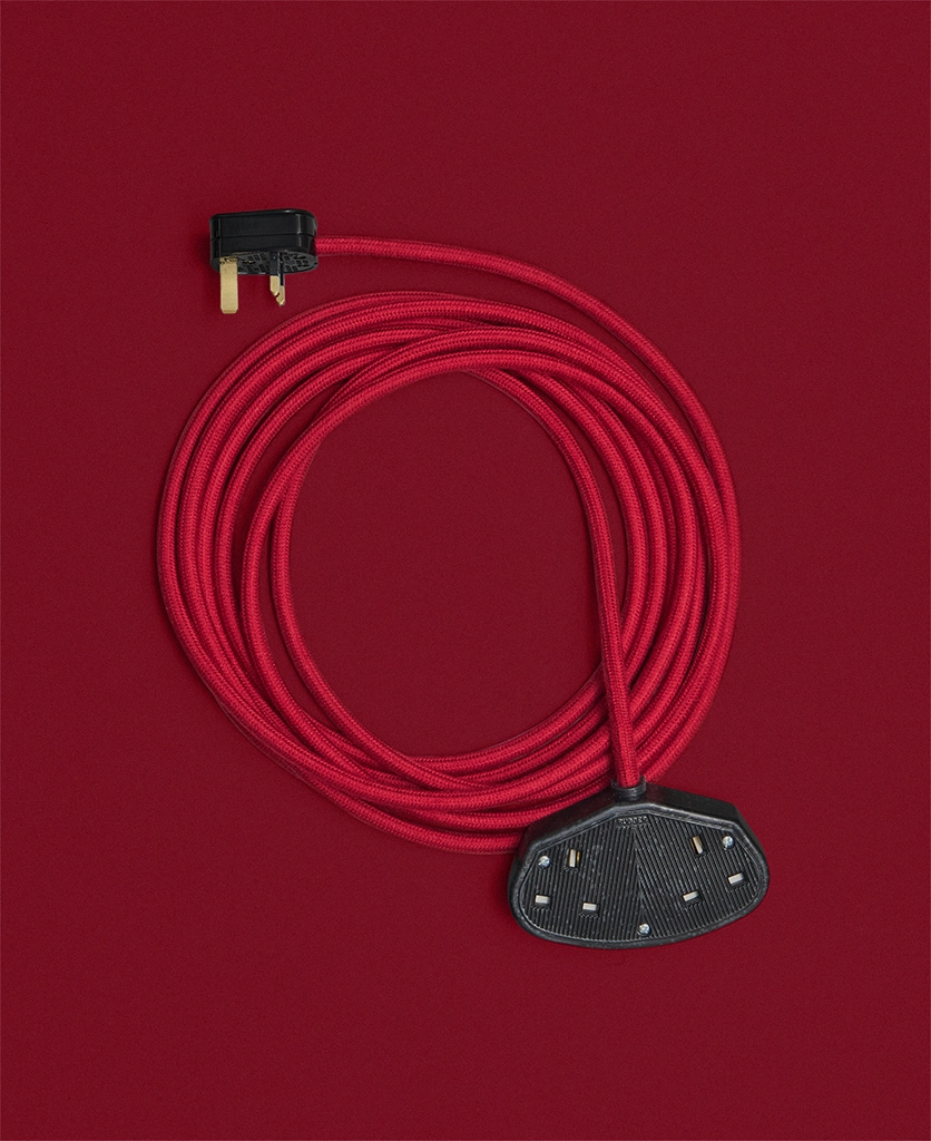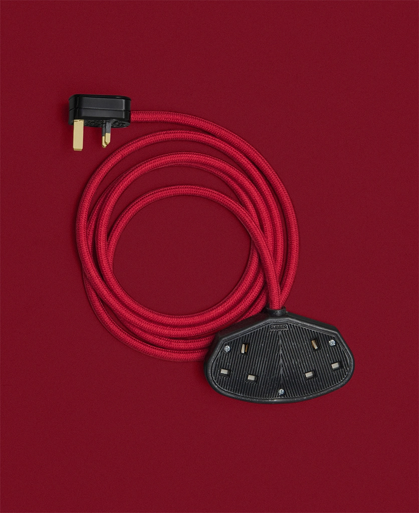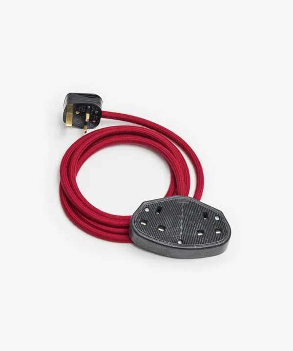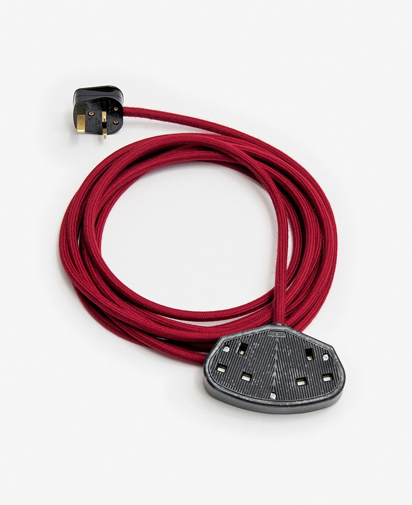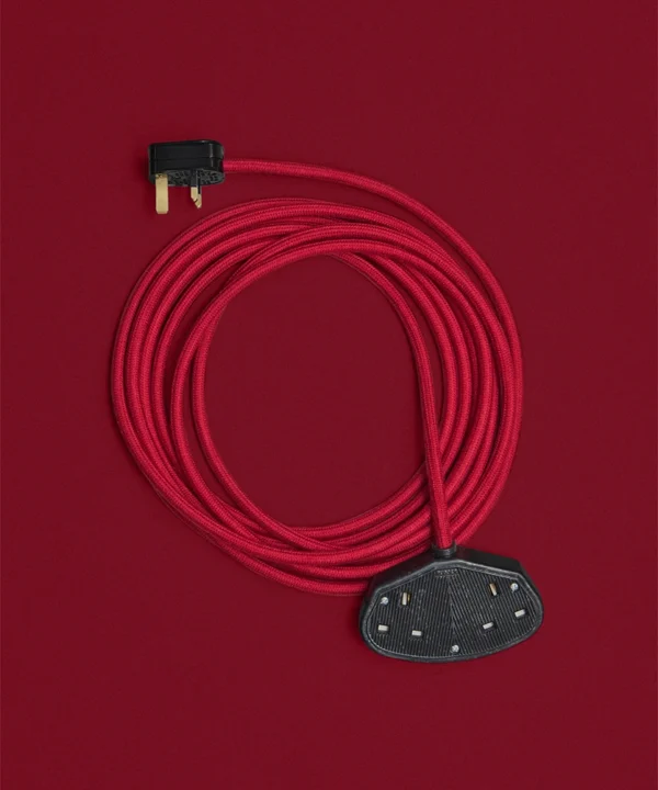 A vibrant fabric extension lead in Sweet Cherry red, designed to add bold colour and intentional detail to everyday power access.