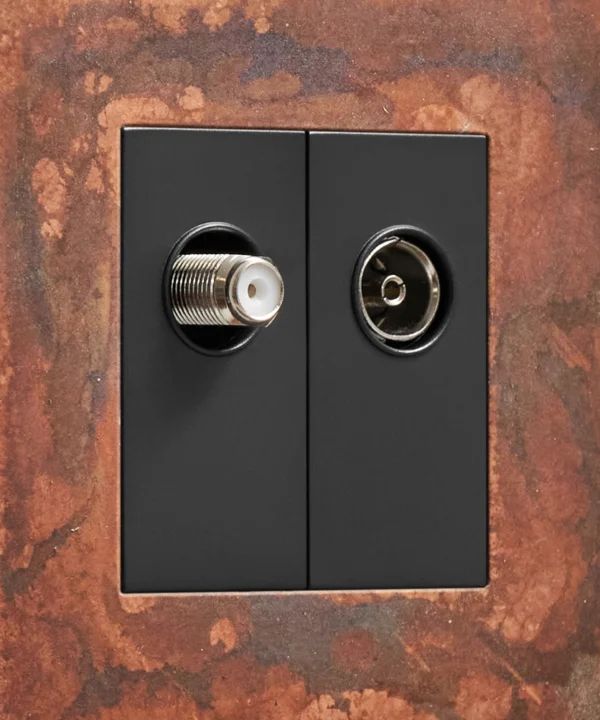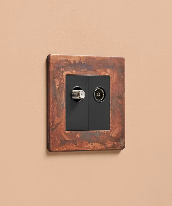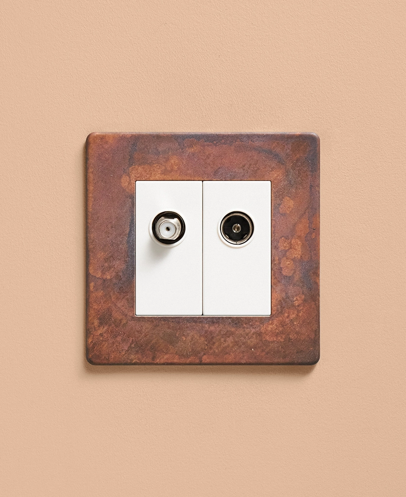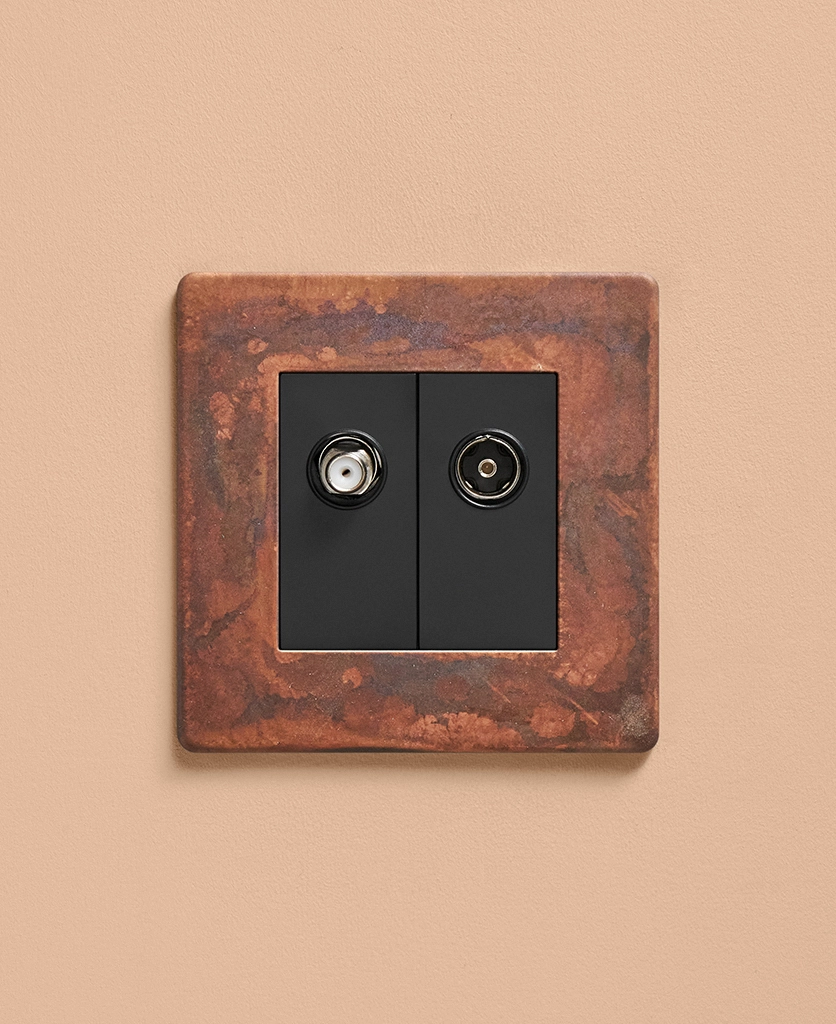 We're pretty sure that you won't find anything as industrial as our oxide copper switches and sockets. And this double data port is no exception. Featuring an authentically distressed copper plate with charcoal and coffee tones eddying across the surface and a choice of black or white satellite and aerial inserts, this designer switch is a stunning way to finish off your spaces.