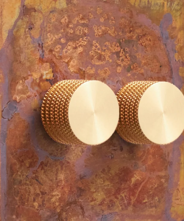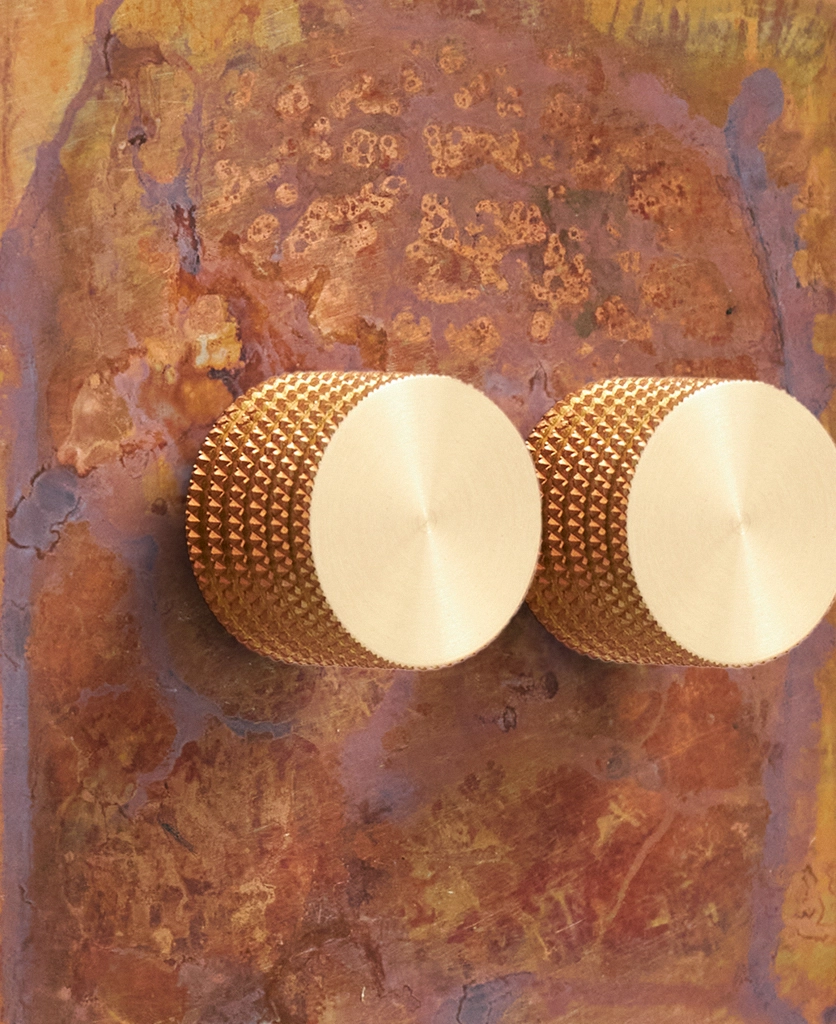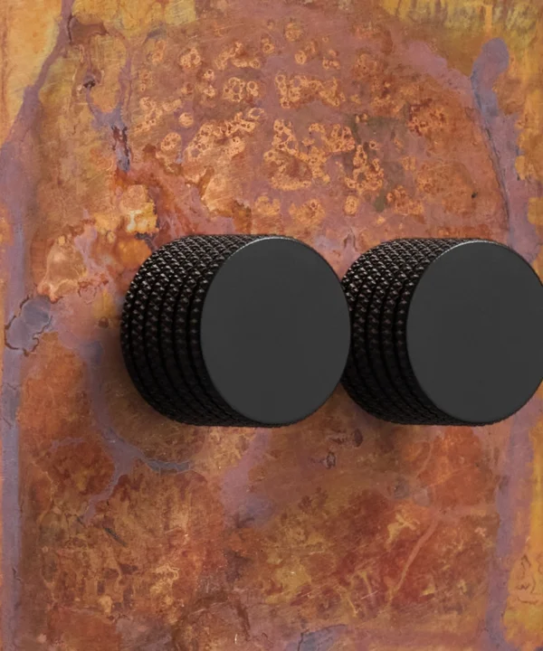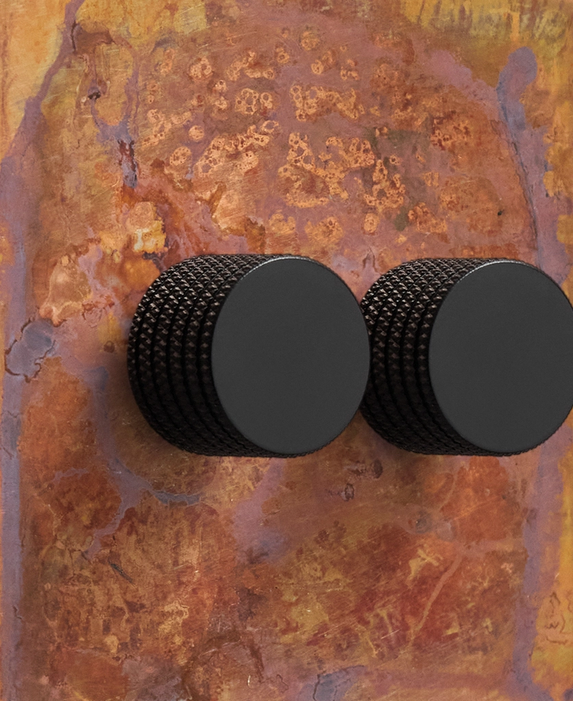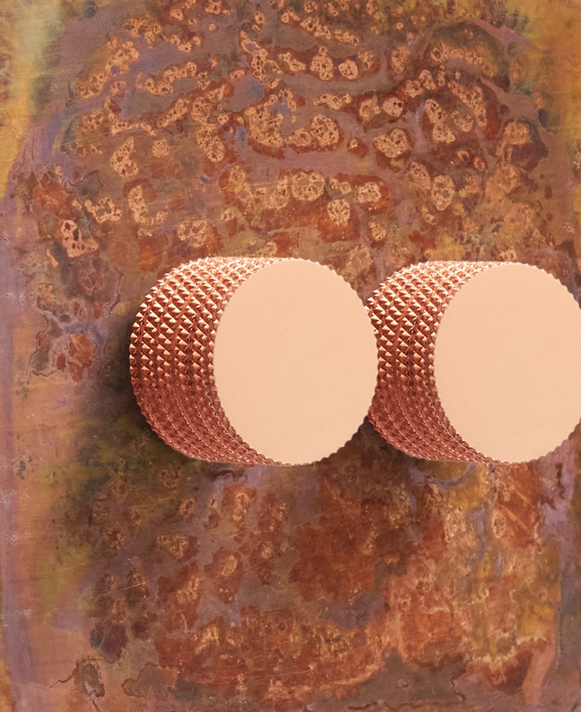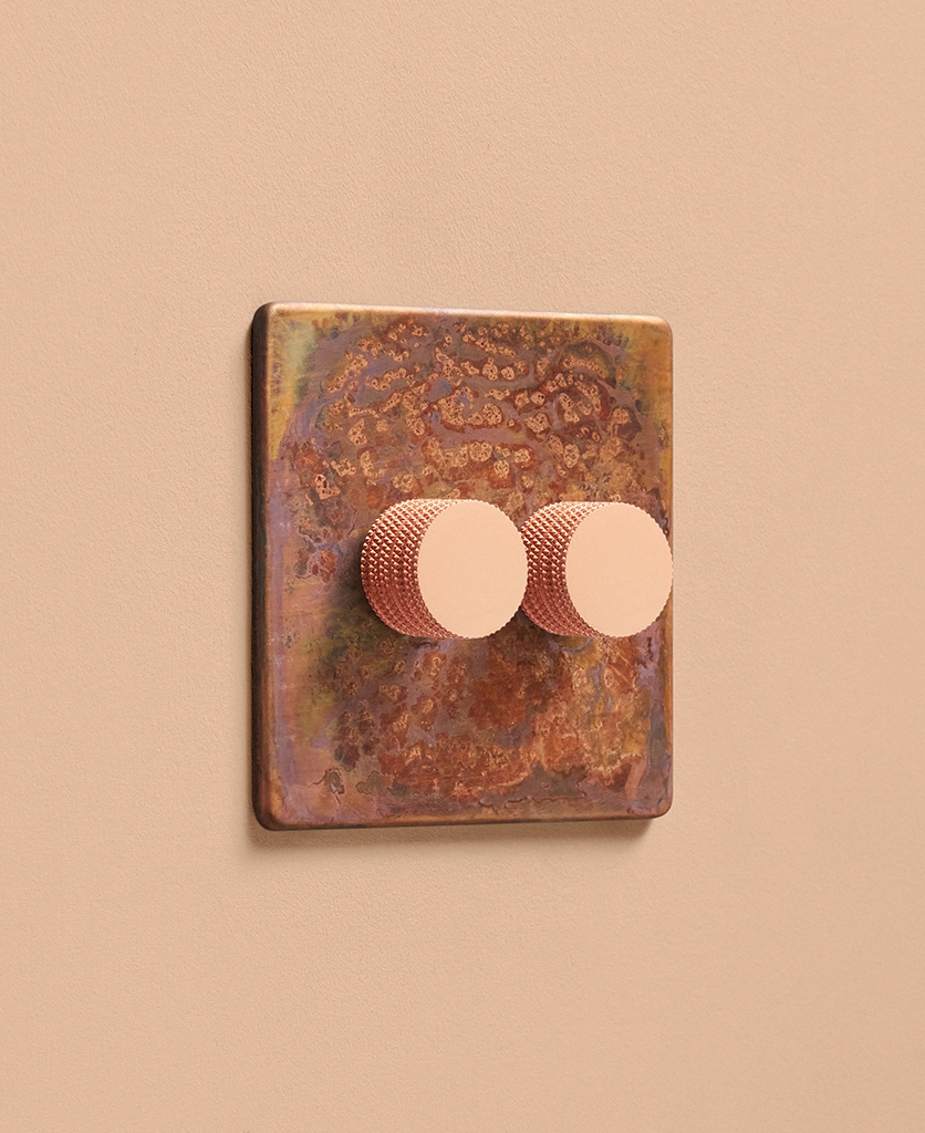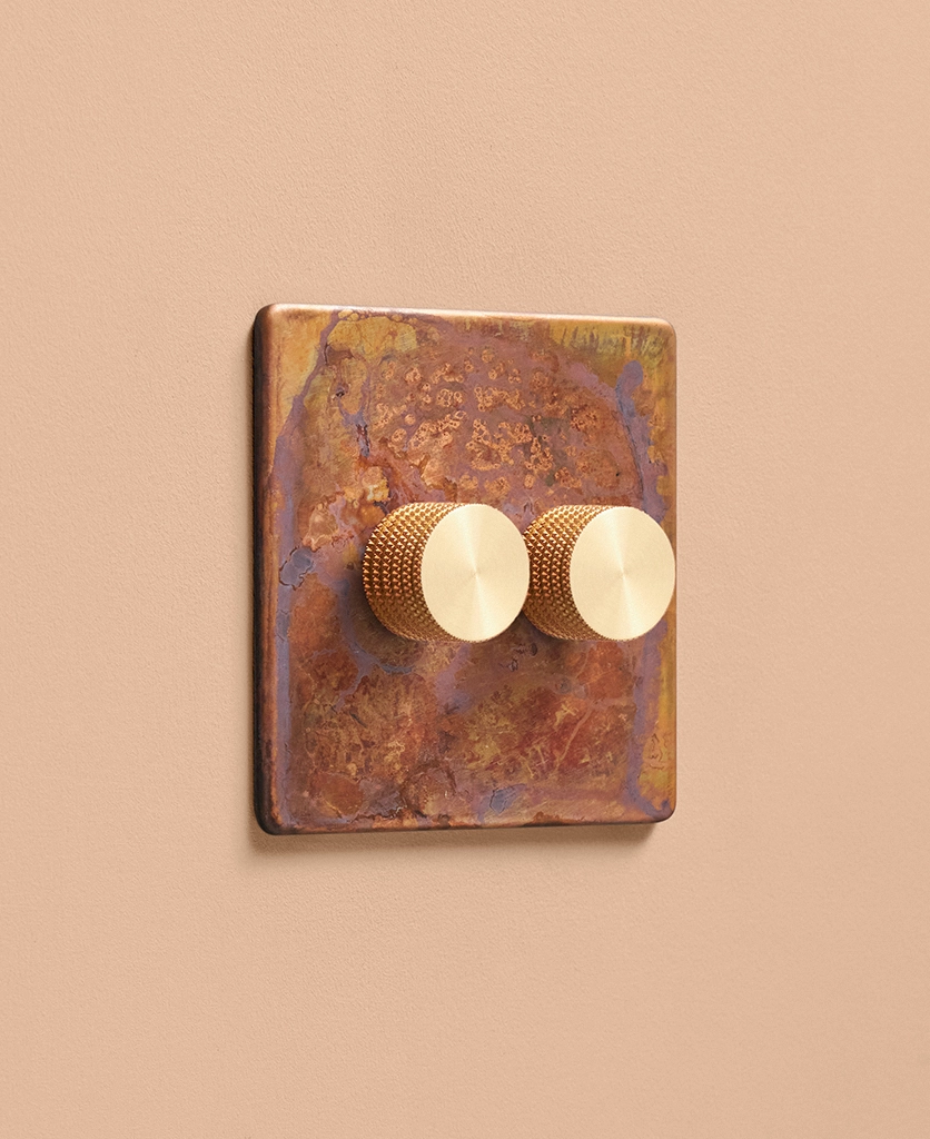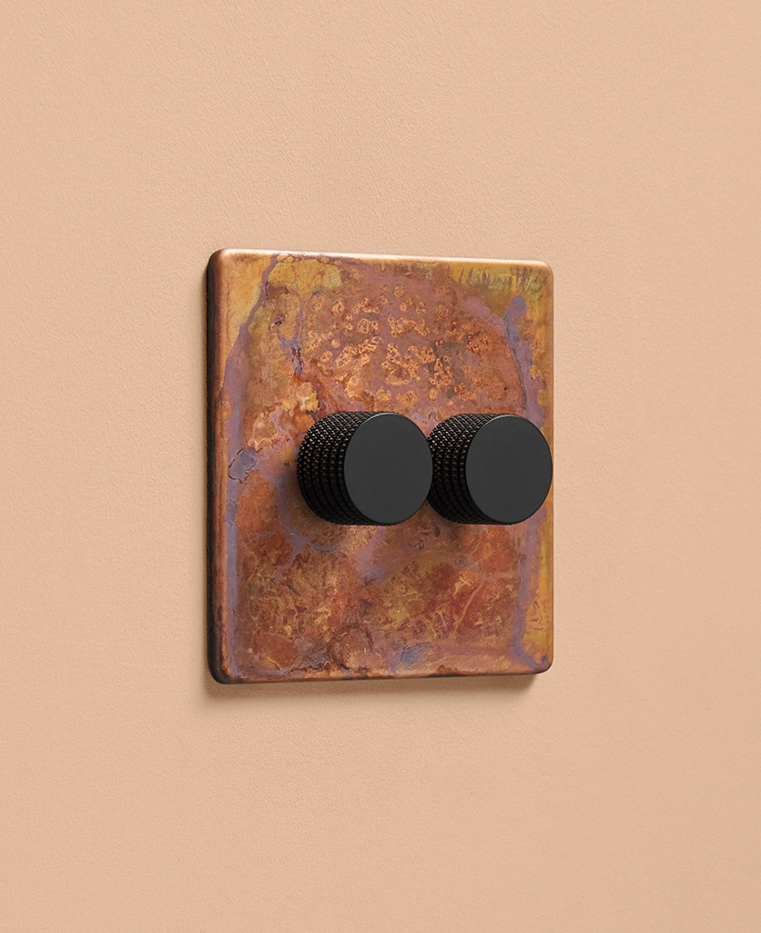 Perfect for open-plan living or any room with two lighting zones, this double dimmer offers seamless control and understated industrial elegance. Whether you’re zoning your lighting for work and relaxation or switching from bright task lighting to cosy evening ambience, it gives you flexibility without compromising on style. The tactile knurled dimmers provide satisfying manual control, while the oxide copper faceplate adds depth and interest to pared-back interiors.