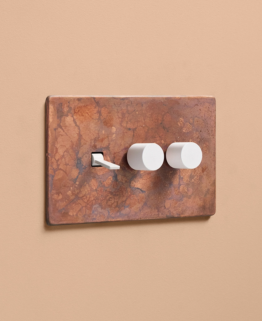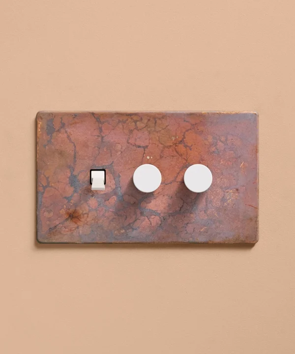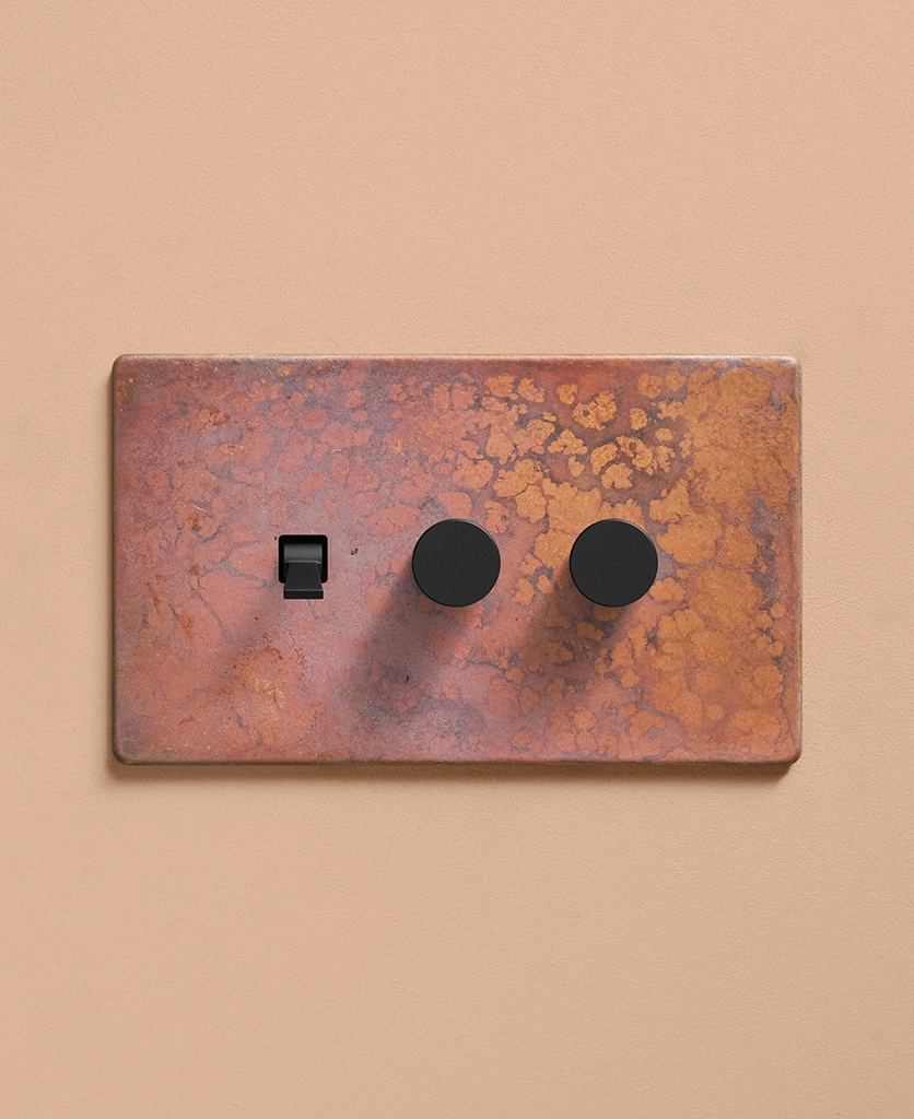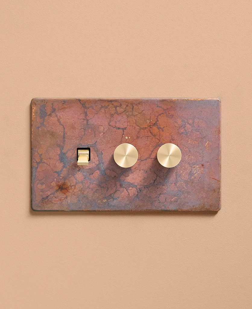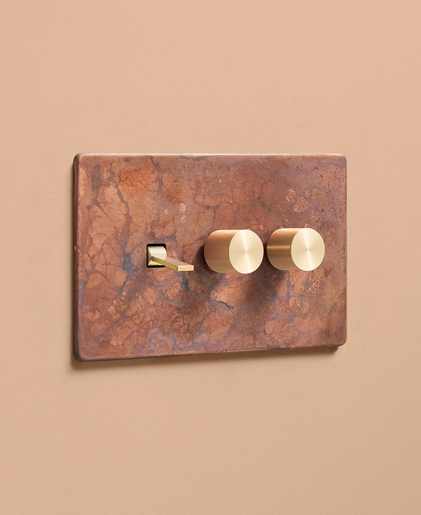 Reaching for the antique copper light switch, you slowly twist the dimmer dial, gently illuminating the dining table pendant before flicking the toggle to turn the spotlights off. Being able to swap between task and ambient lighting from one central control makes family life less chaotic, and the oxide copper light switches and sockets you chose complement your blush-toned space perfectly.