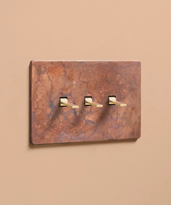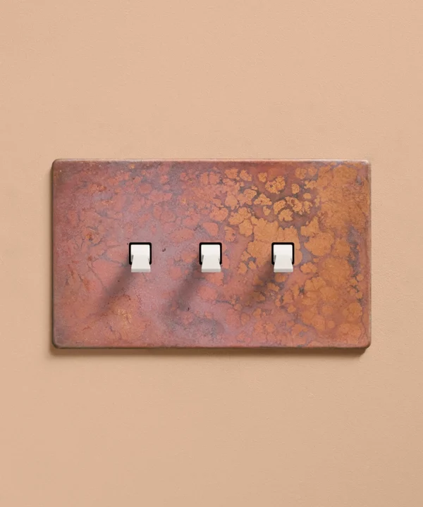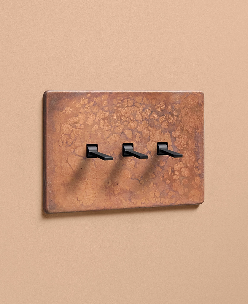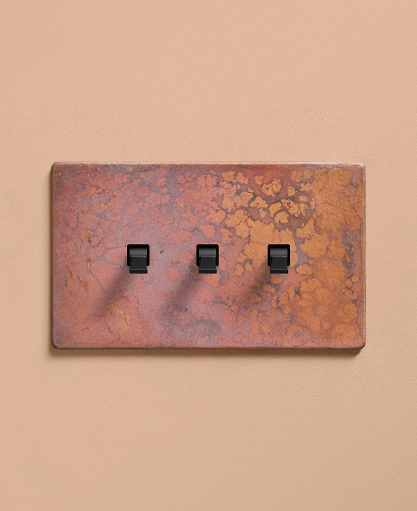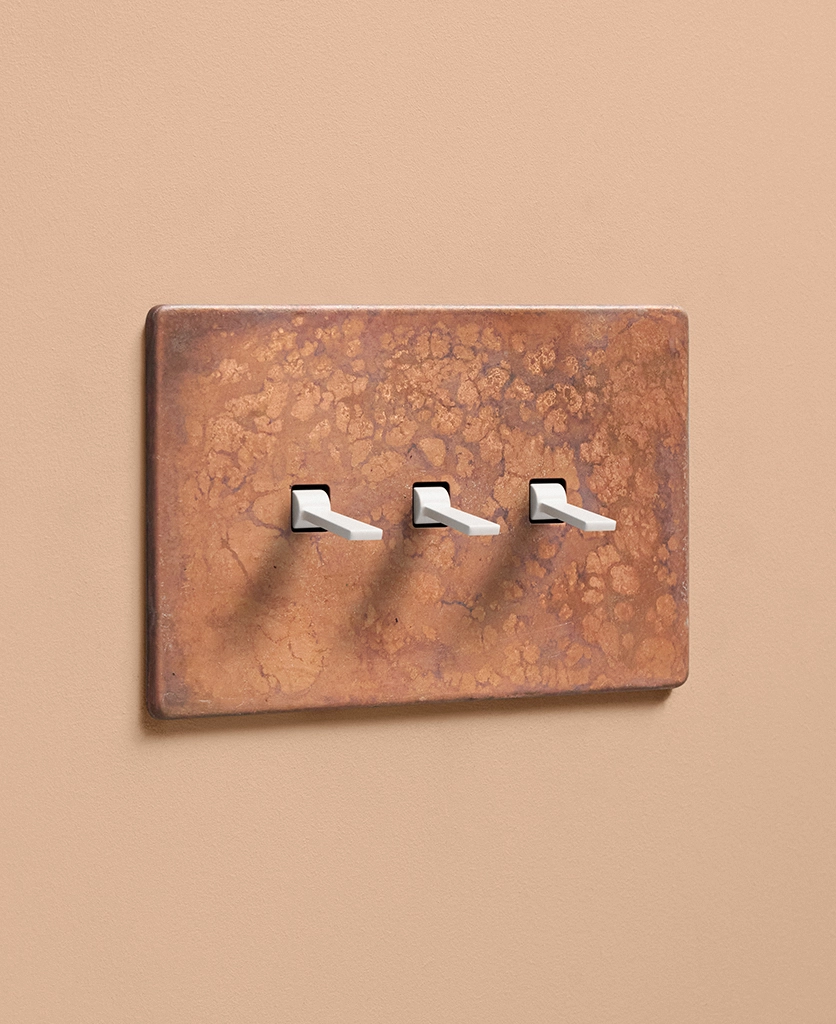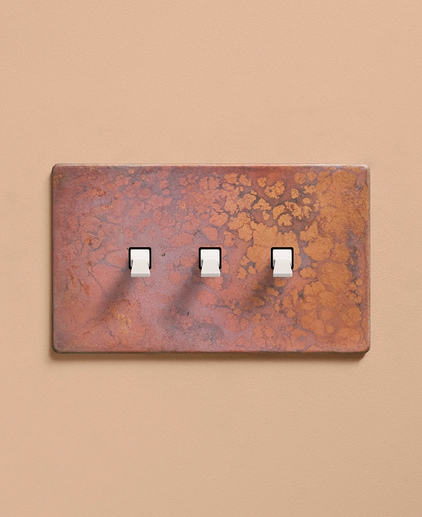 Reaching for the triple toggle light switch, you brush the oxide copper backplate with your fingertips, tracing the patina. The warm shade harmonises beautifully with your pink space, with matching sockets that elevate all your everyday interactions. Pinching the tapered toggle, you tease it downwards, grinning at the satisfying click as your wall lights gently illuminate.