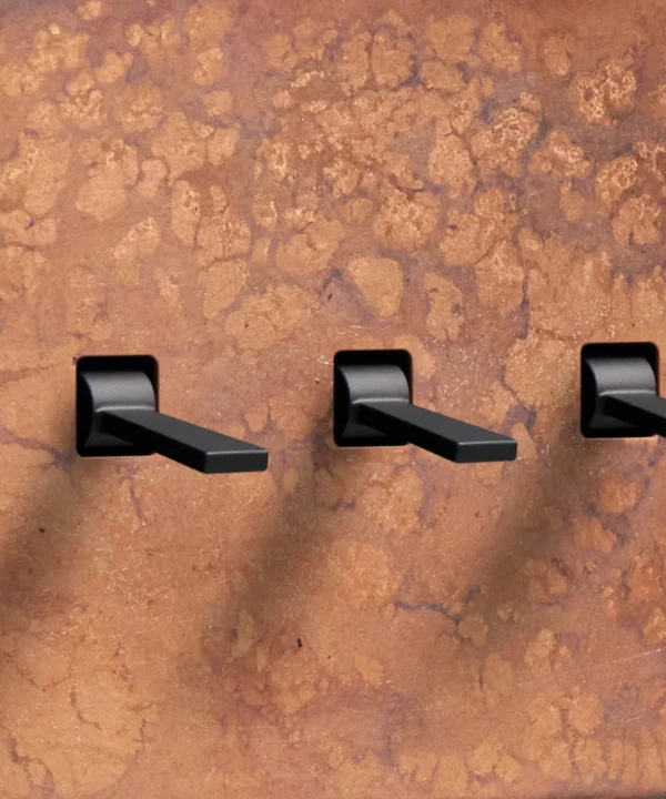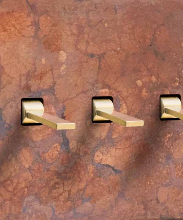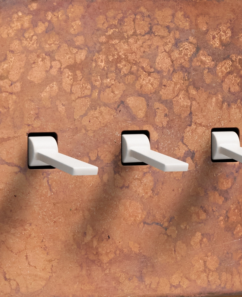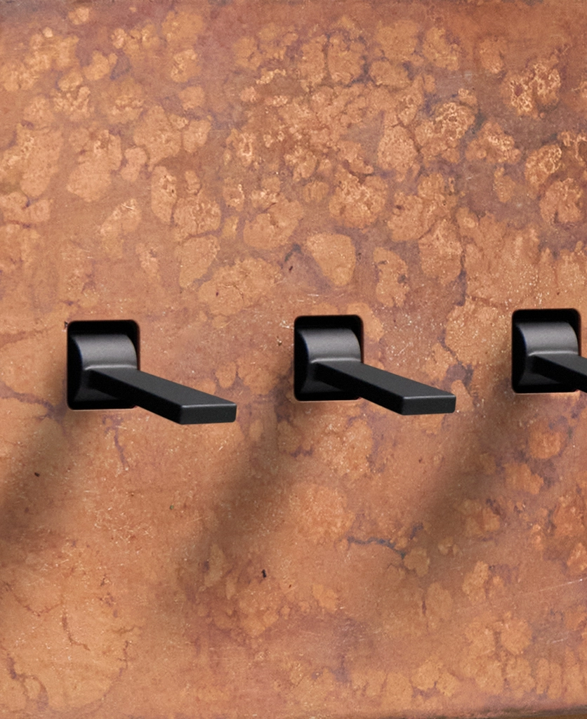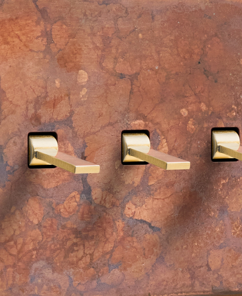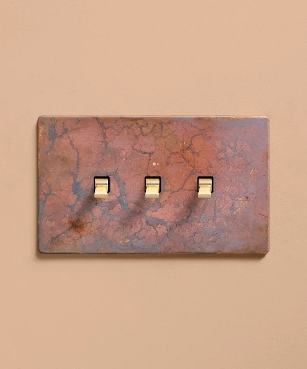 Reaching for the triple toggle light switch, you brush the oxide copper backplate with your fingertips, tracing the patina. The warm shade harmonises beautifully with your pink space, with matching sockets that elevate all your everyday interactions. Pinching the tapered toggle, you tease it downwards, grinning at the satisfying click as your wall lights gently illuminate.
