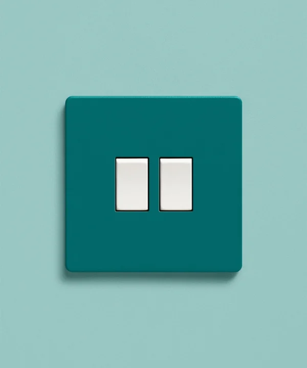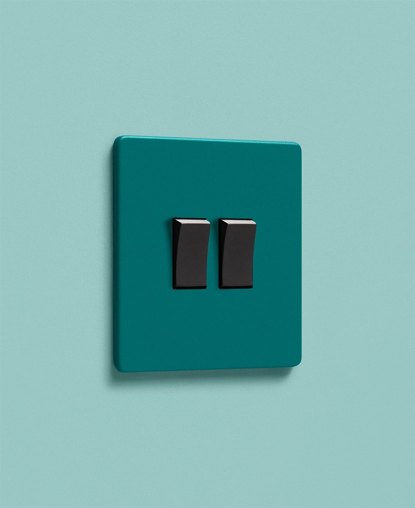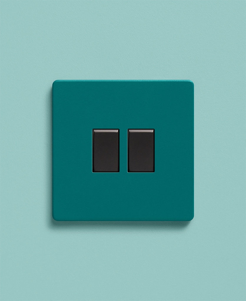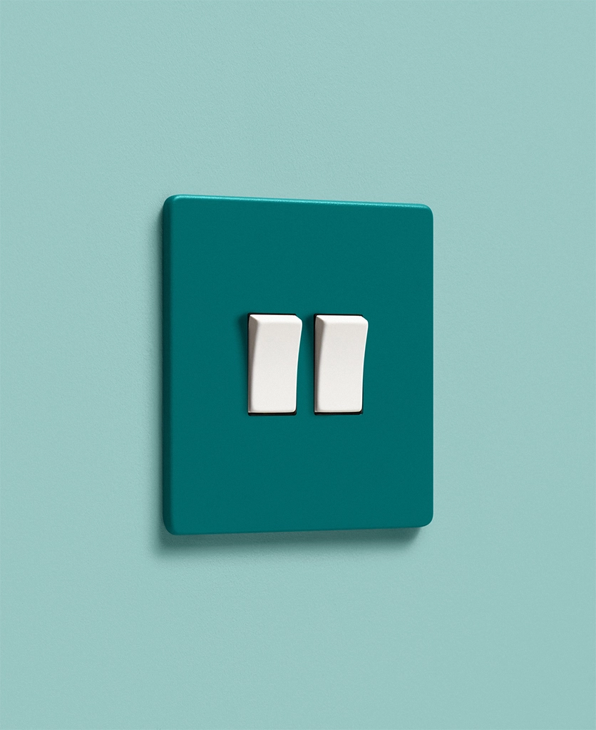 Flicking the green light switch in the hallway, you illuminate the vibrant space. With vivid walls, coordinating verdigris green rocker switches, sockets and handles and colourful, impactful pieces of art adorning the walls, it fills you with joy the moment you step inside, raising a smile on even the greyest days.