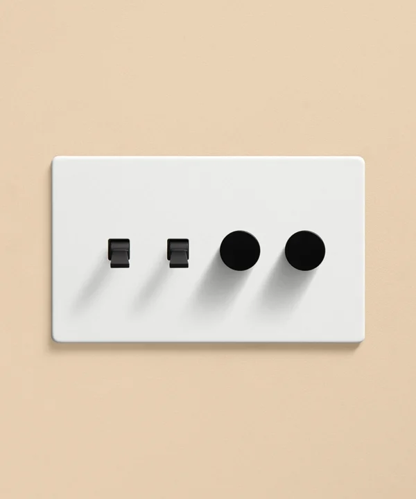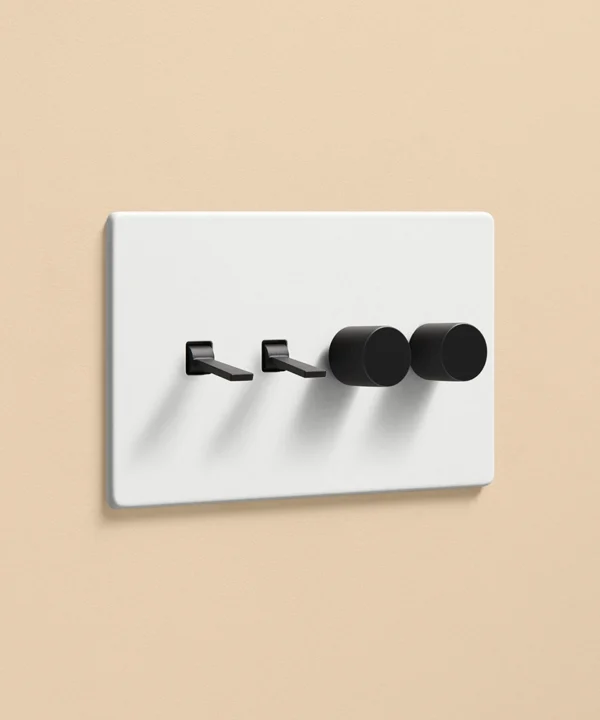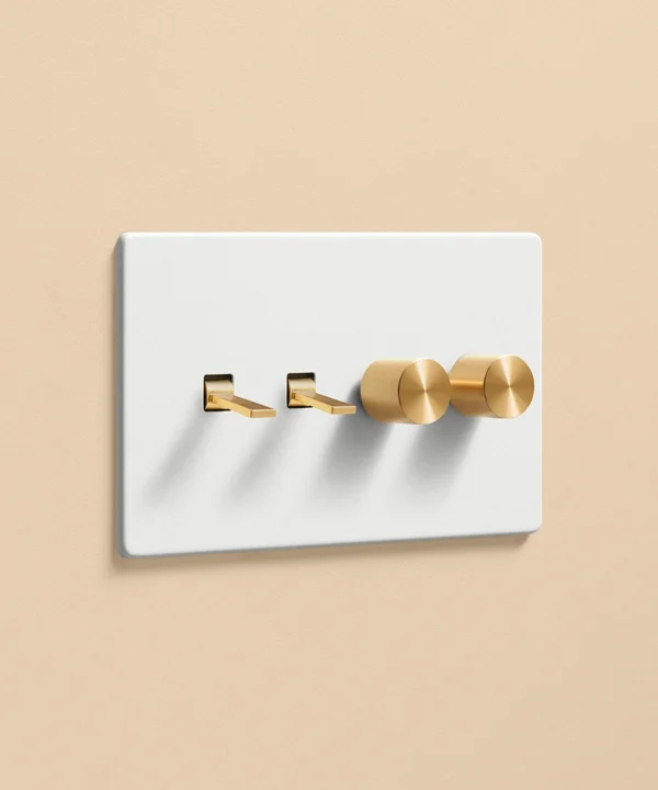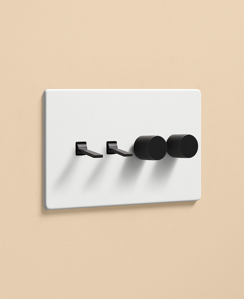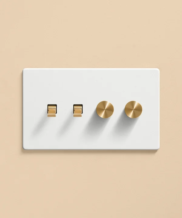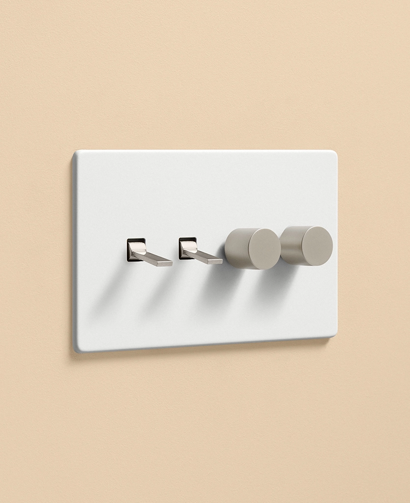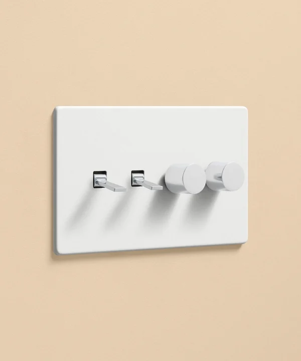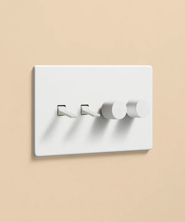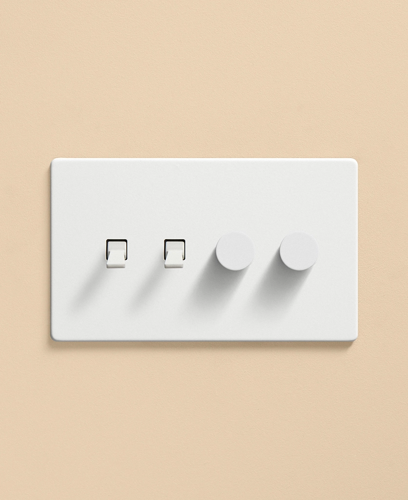 Pushing the heavy wood door open, you inhale the scent of freshly baked bread from earlier today, still lingering in the air. Reaching out, you trace the matt white light switch with your fingertips. Fumbling for the dimmer dial, you slowly twist, setting a warm ambience in your living room before flicking the toggle switch to illuminate the pendant light in your kitchen. Having a toggle and dimmer on one plate makes it easier to control the lighting in your open-plan space, helping you to create zones for every occasion and mood.
